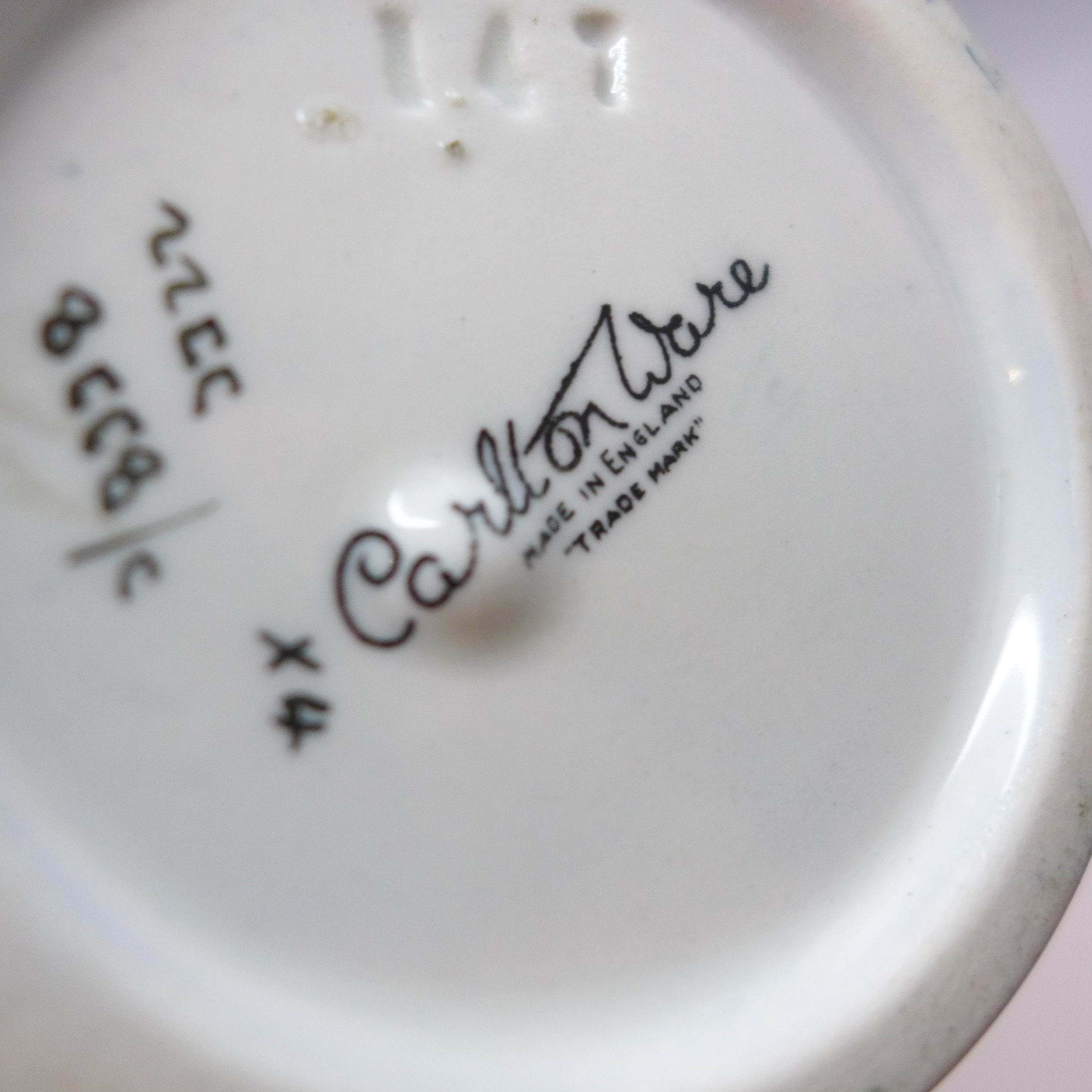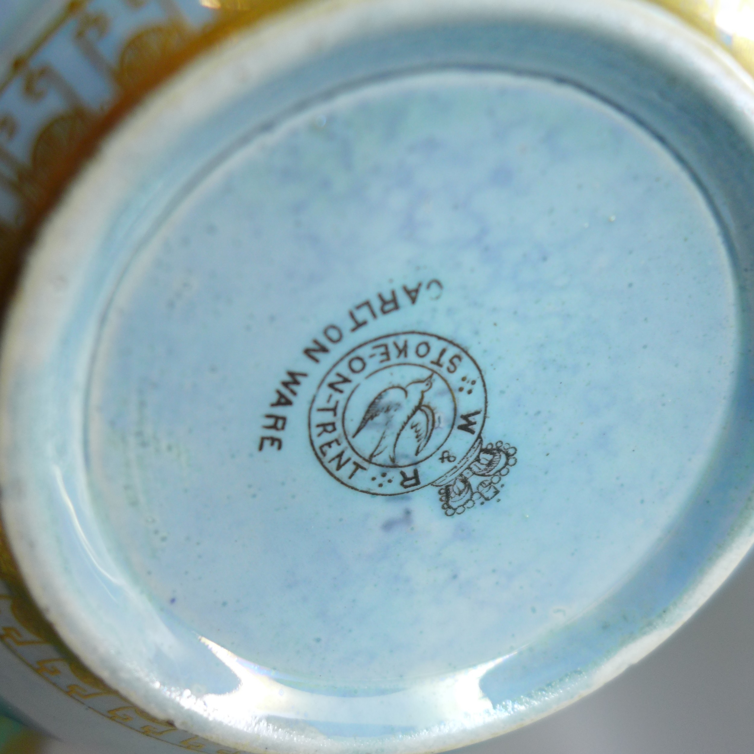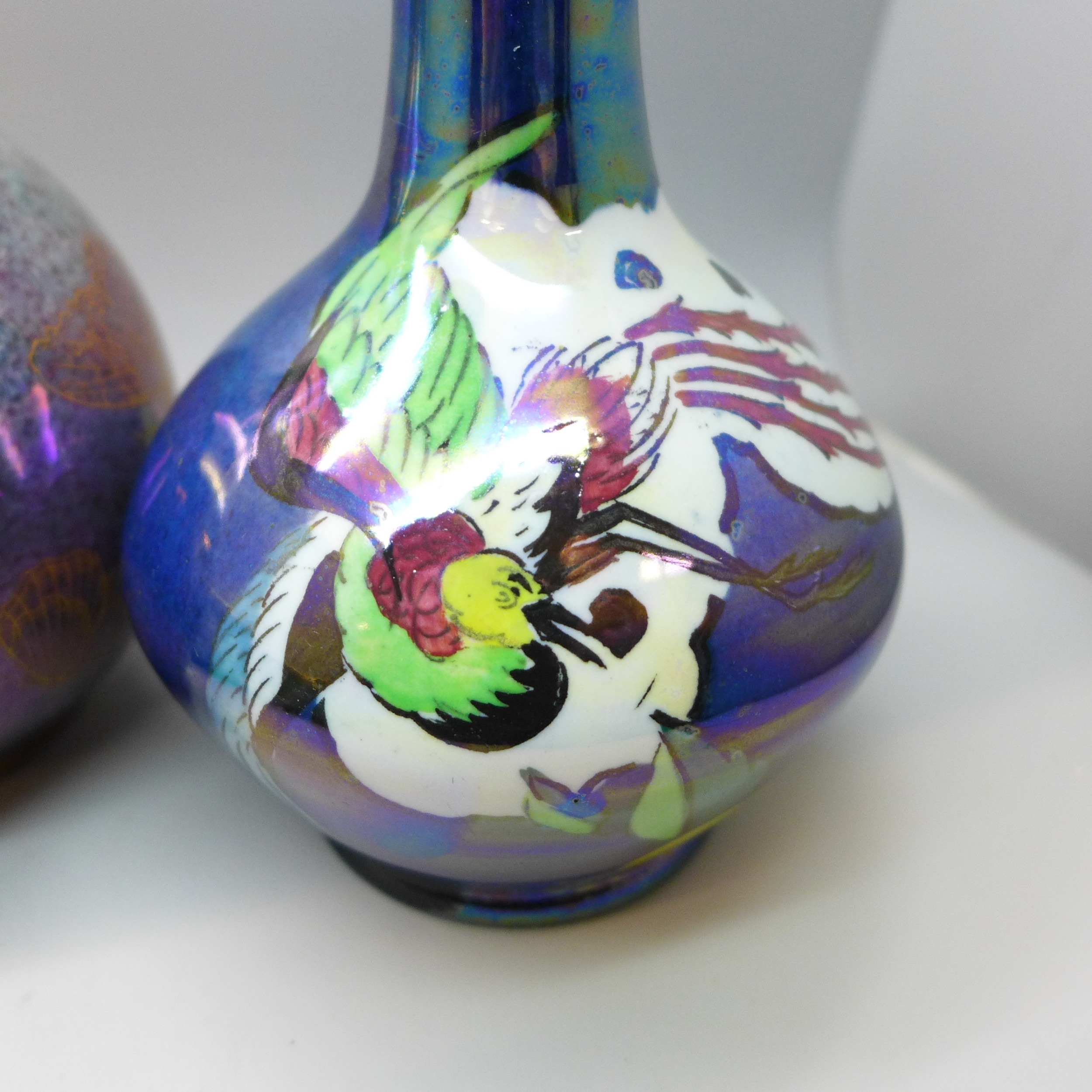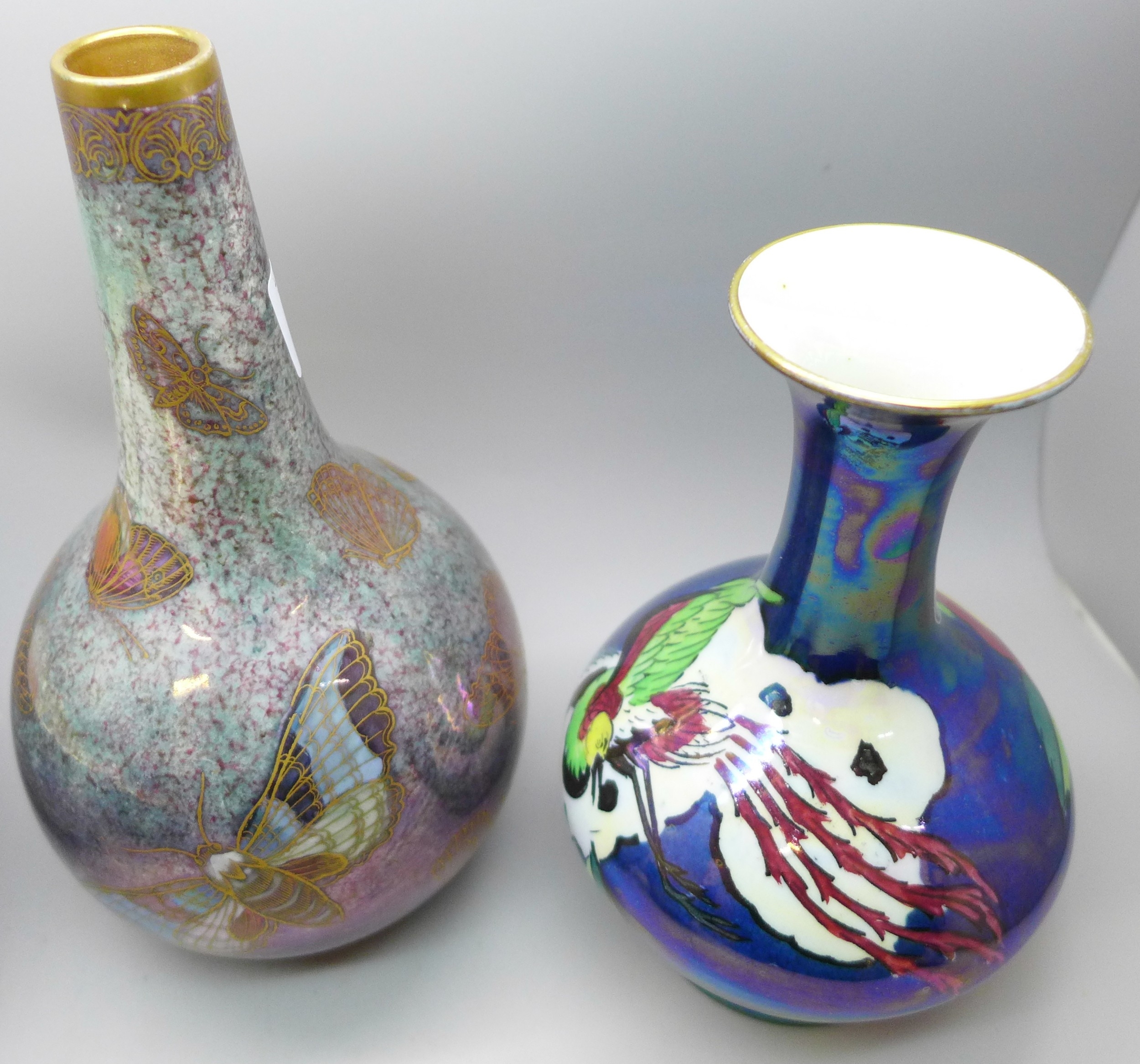 Collection of Carlton Ware lustre pottery to include 1920s Armand Lustre Ware bowl and vase both with butterfly detail, a pale blue and white moth lustre bowl, and a later Art Deco vase, tallest vase 19cm