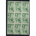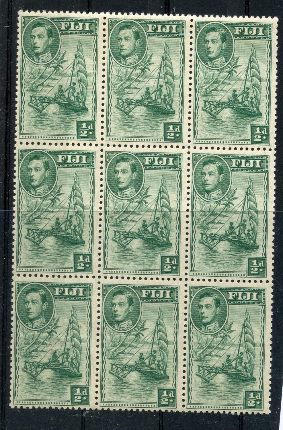 FIJI 1938 - 55 ½d green perf 12 block of 9 including the variety 'Extra palm frond' um. SG 249b, ba. Cat £152.