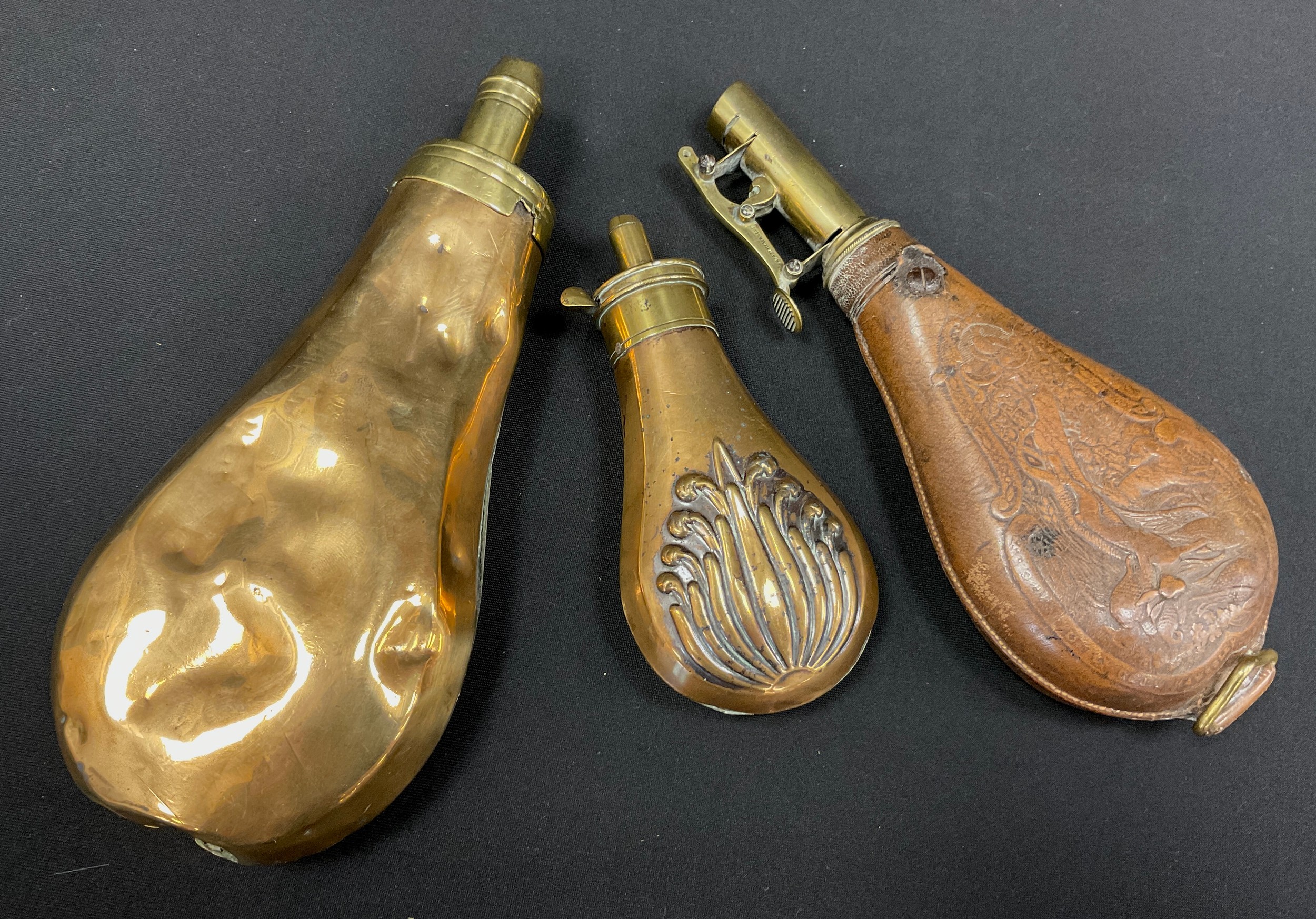 A Sykes patent copper and brass four level powder flask, another smaller single pour, a G & J W Hawksley tooled leather and brass shot flask, decorated with Pheasants, Hare and other game (3)
