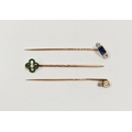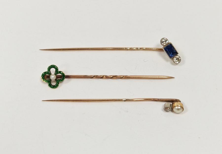 Antique gold-coloured metal, sapphire and diamond stickpin set rectangular sapphire flanked by two diamonds, a gold-coloured metal seedpearl and diamond stickpin and a gold-coloured metal, pearl and green enamel stickpin (3)