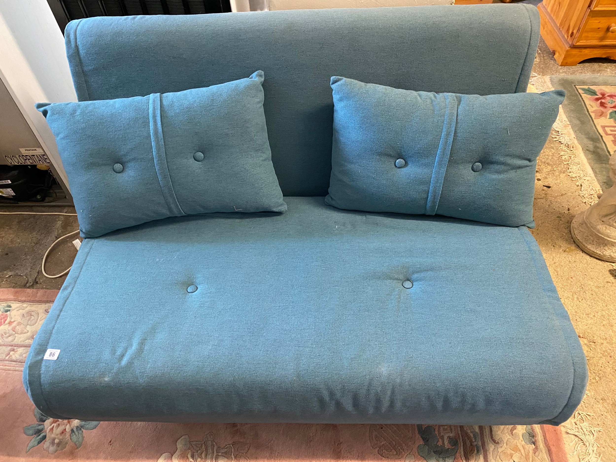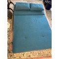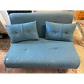 A modern futon upholstered in blue material, two loose cushions, on turned legs - 47in. wide