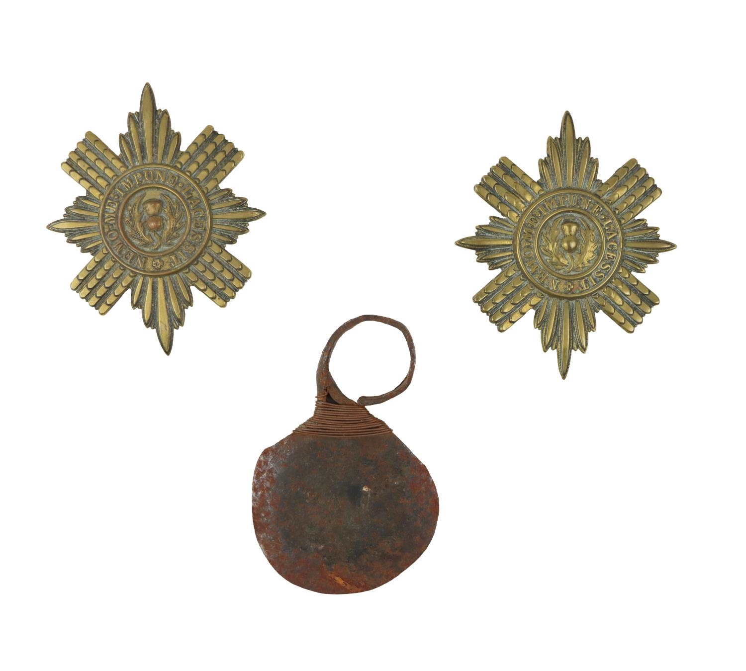 A pair of brass Military Badges, Scots Guards, World War II and a Turkana Tribal Fighting Knife. (3)