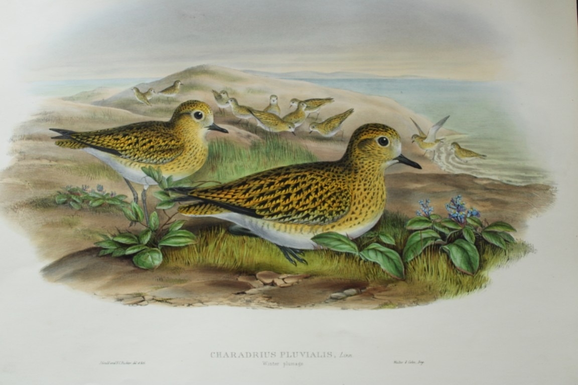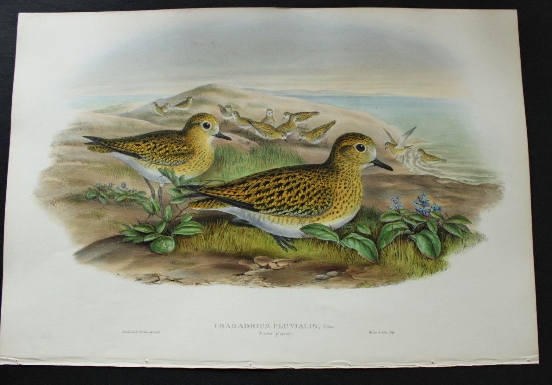 John Gould - Original lithograph of the Golden Plover 1862-73. This original lithograph of the Golden Plover in Winter Plumage (Charadrius pluvialis) is from John Gould's Birds of Great Britain, issued in 25 parts between 1862 and 1873. This plate is number 39 from volume 4 of this work and was drawn and lithographed by John Gould & HC Richter.