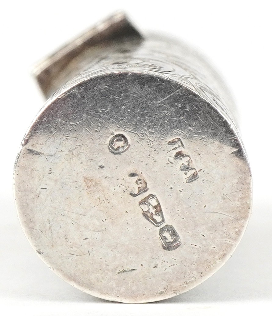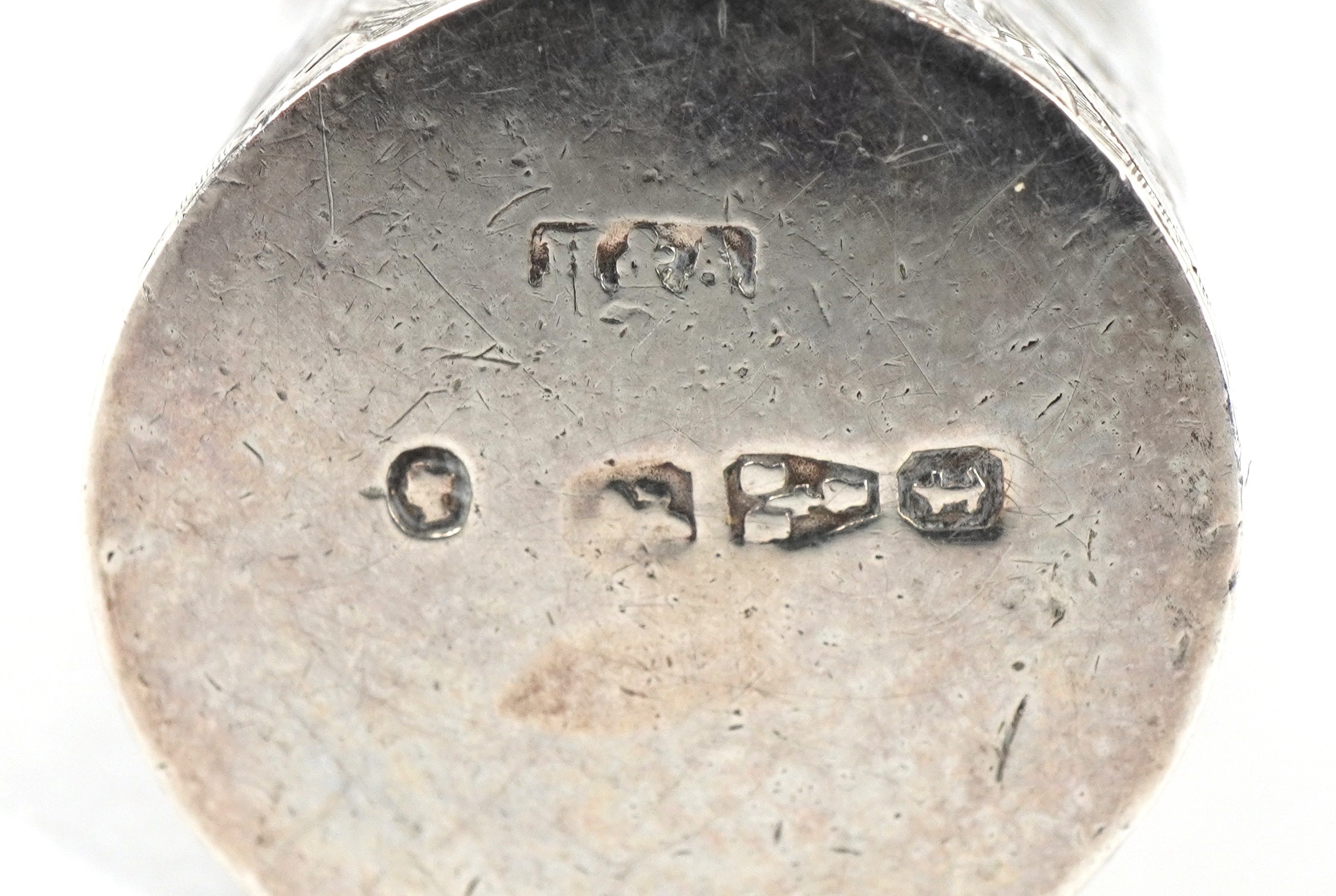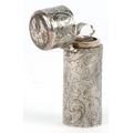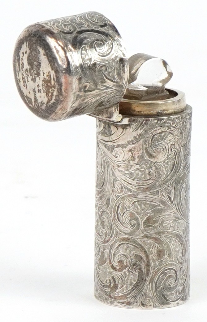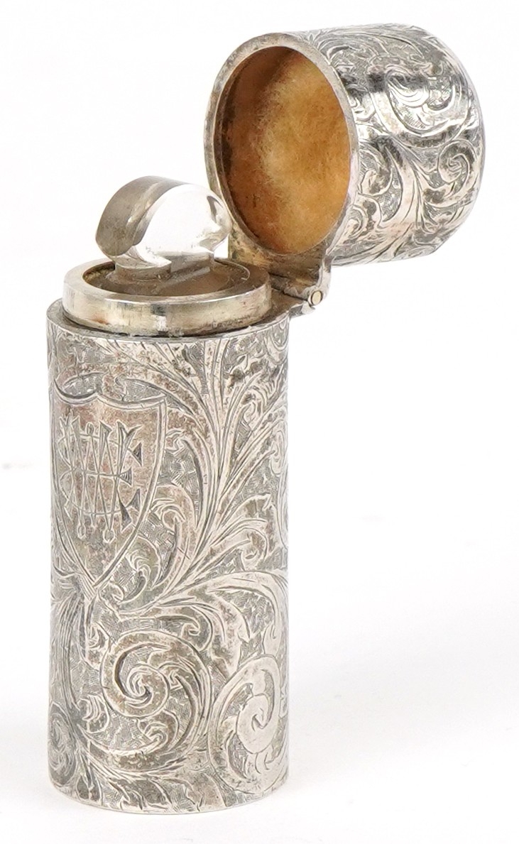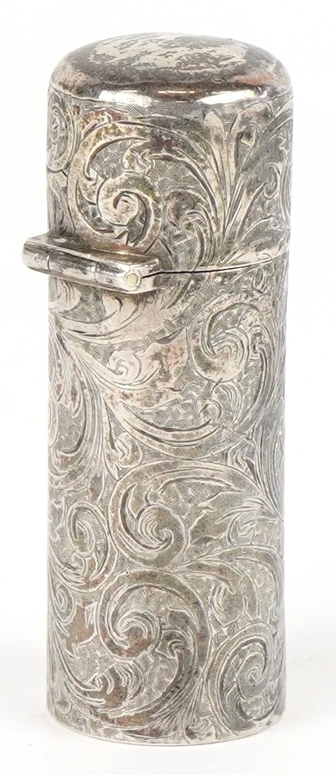 Horton & Allday, a Victorian silver cased scent bottle with glass liner and stopper chased with scrolling foliage, Chester 1882, 5.4cm high, total 25.0g.