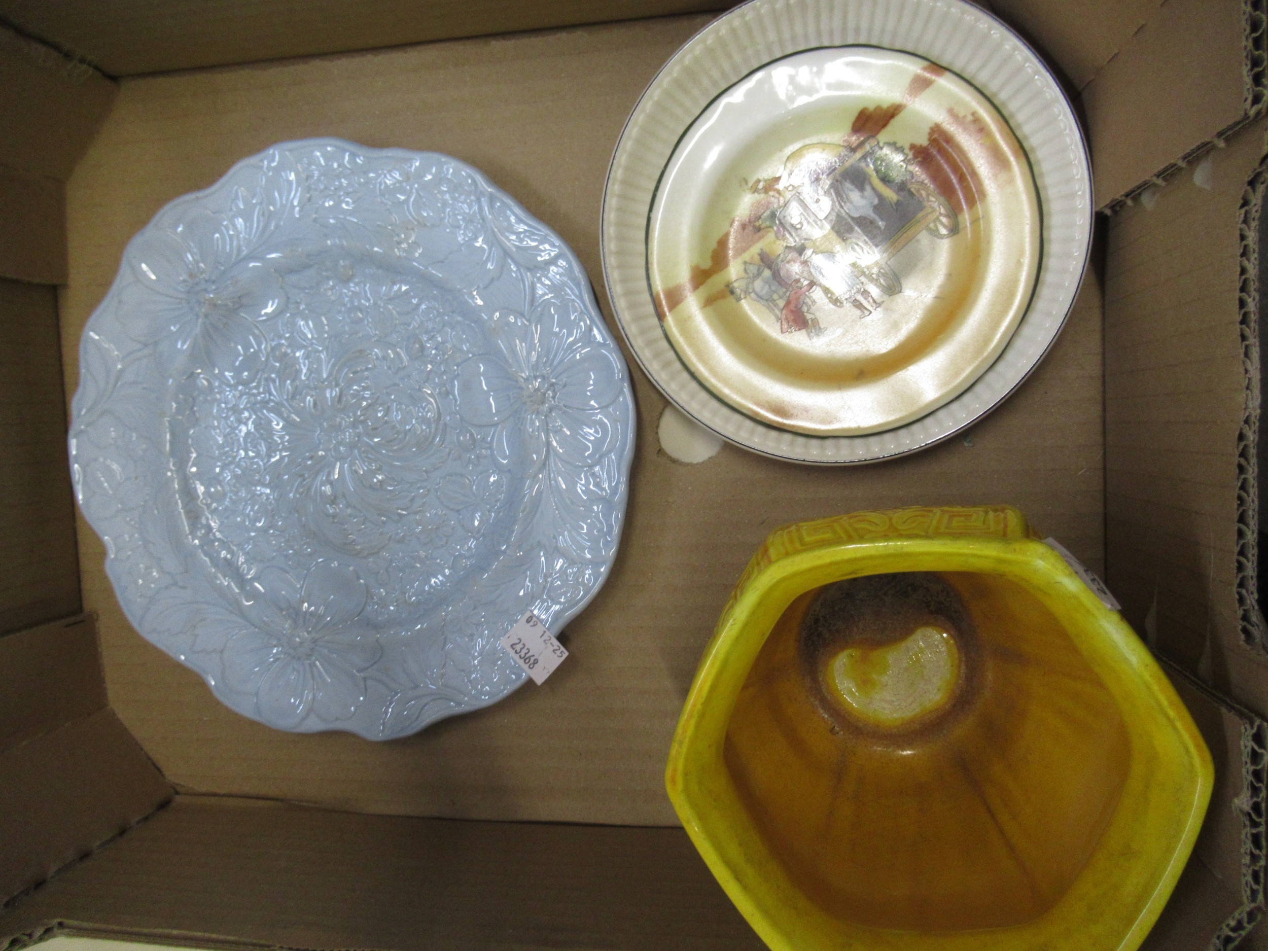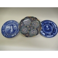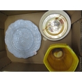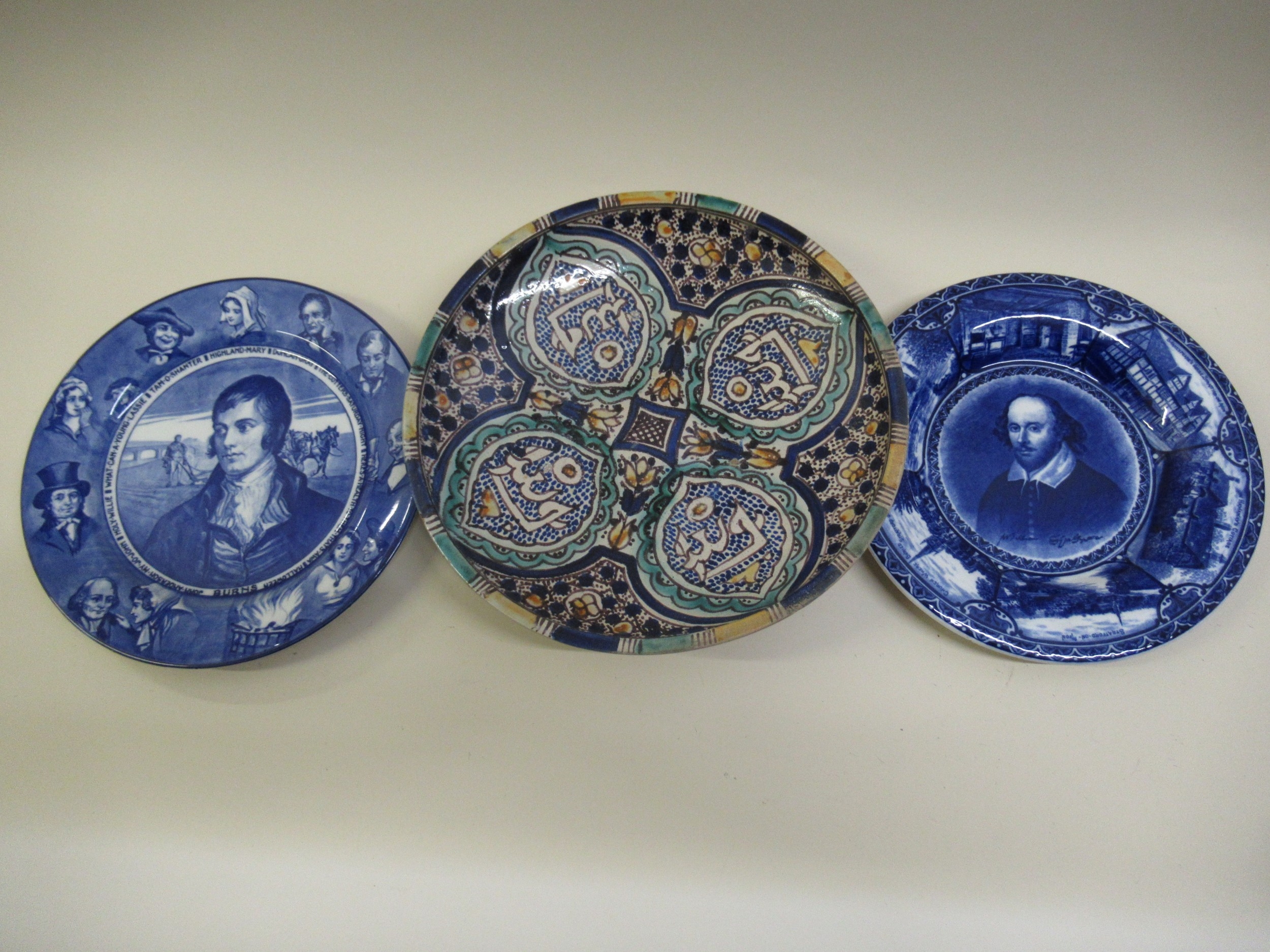 Small Mintons yellow ground pottery jardiniere, two blue and white plates transfer printed with portraits of Burns and Shakespeare, North African pottery bowl and other miscellaneous plates