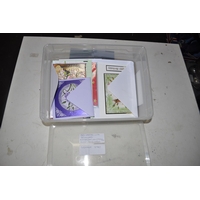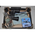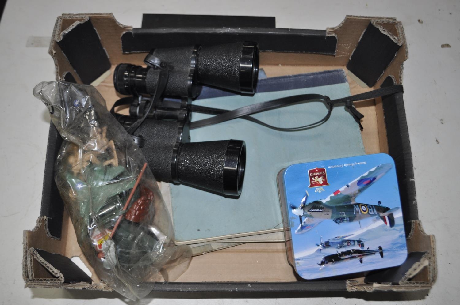BOX OF BINOCULARS, TINS AND PLASTIC ACTION FIGURES