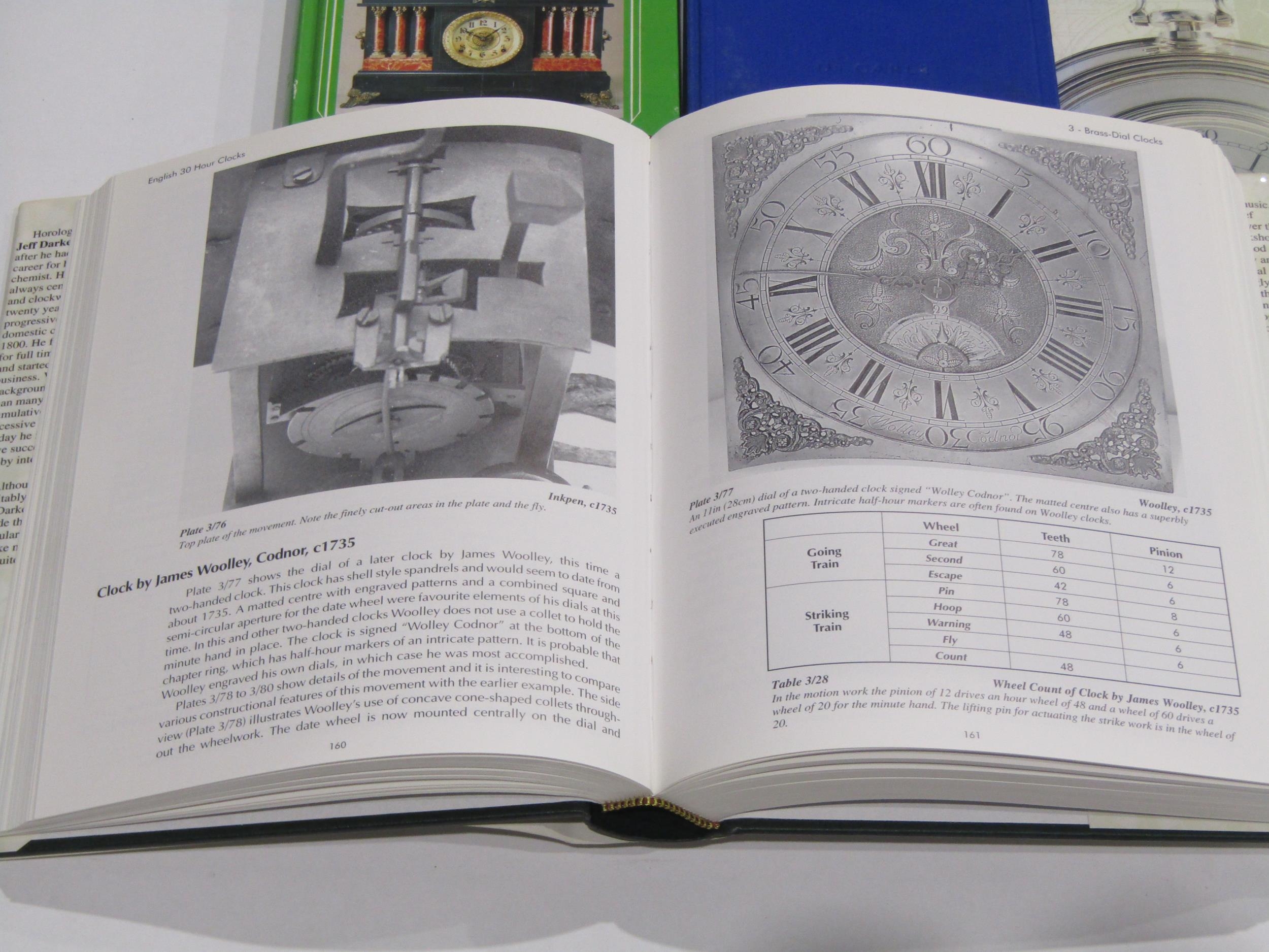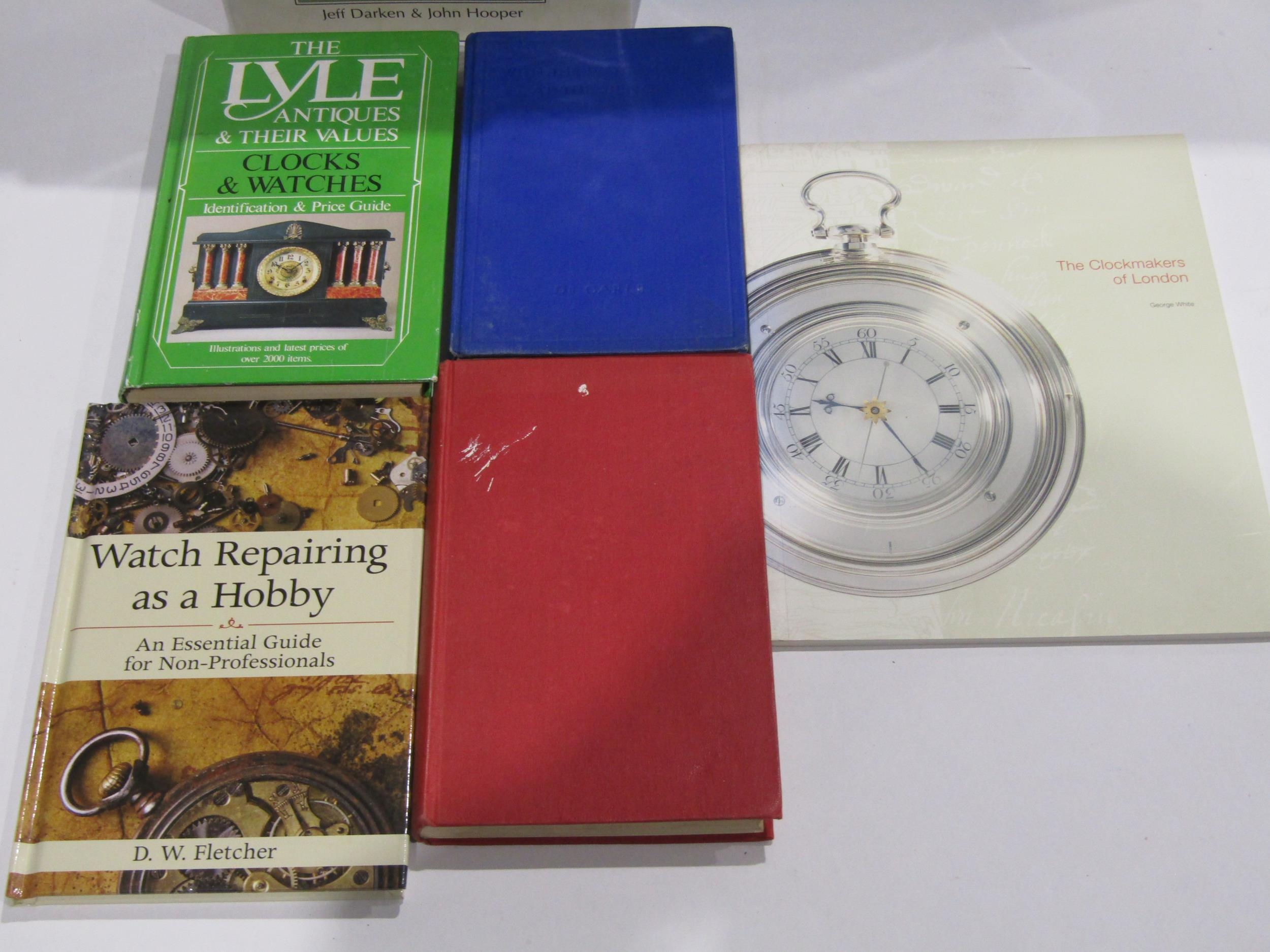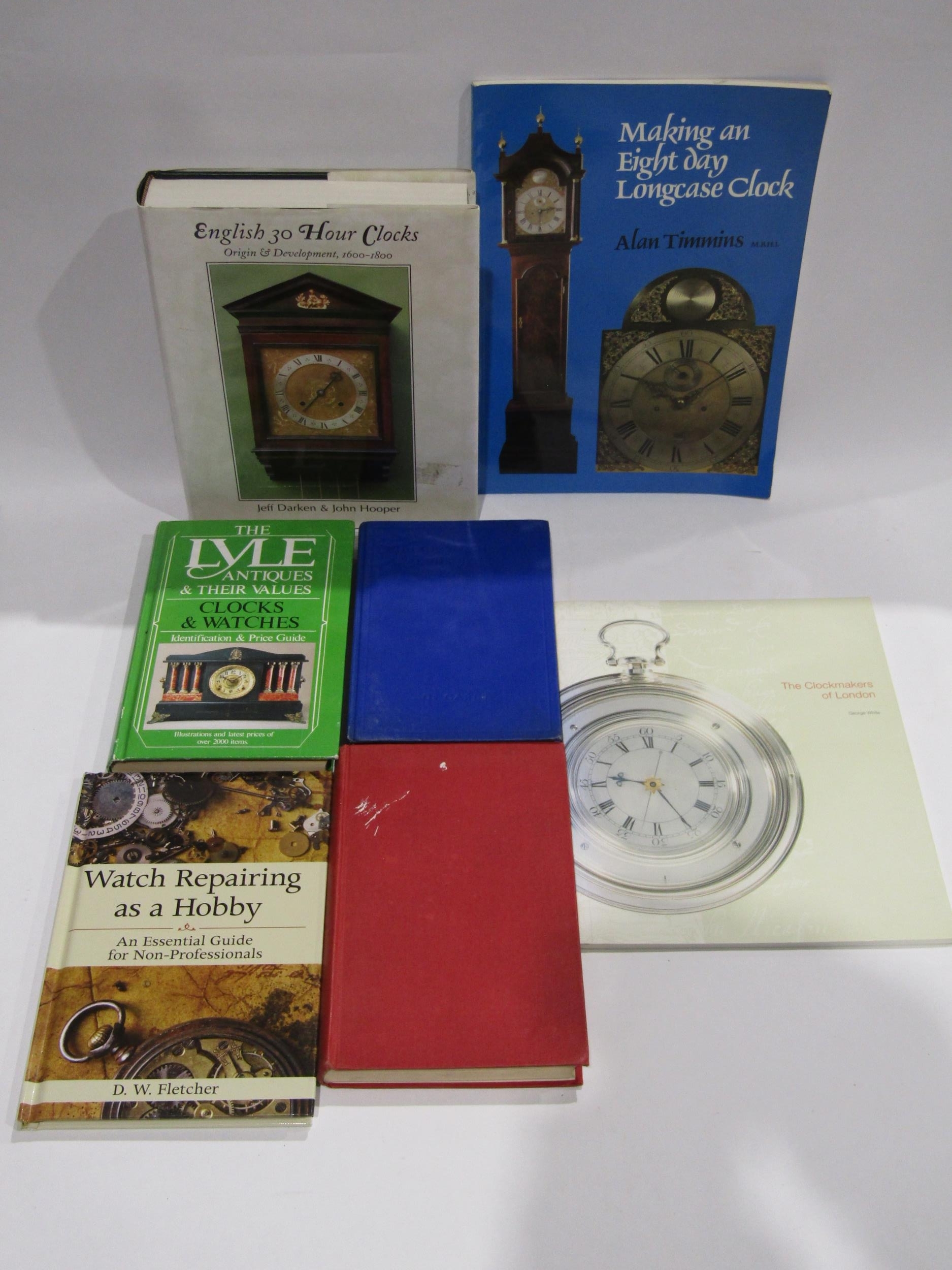 Group of clock related books - De Carle: With the Watchmaker at the Bench, TR Robinson: Modern Clocks, Lyle Antique Clocks Valuation Guide, D W Fletcher: Watch Repairing as a Hobby, George White: The Clockmakers of London, Jeff Darken & John Hooper: English 30 Hour Clocks, Alan Timmins: Making an English Longcase Clock (7)