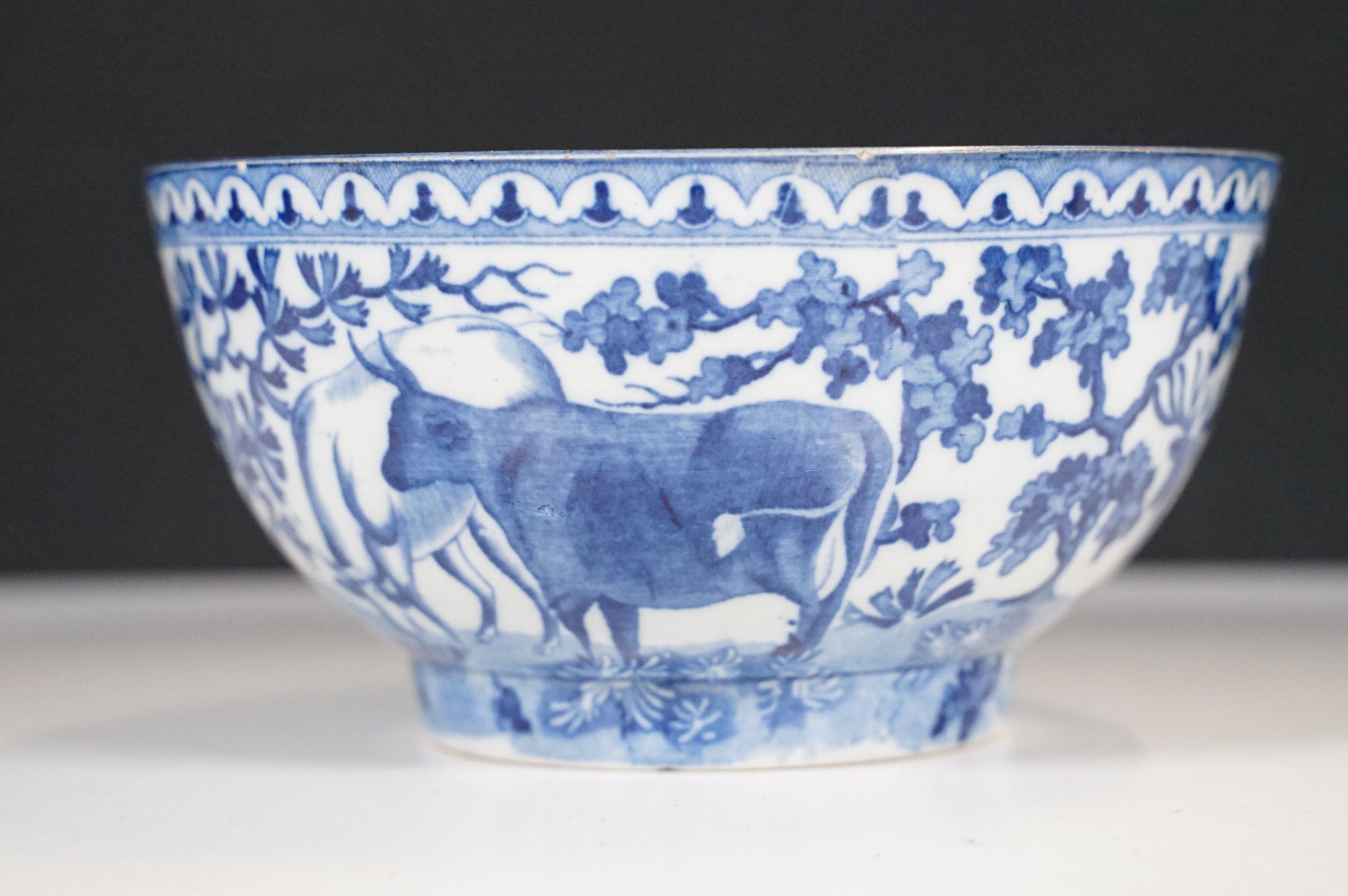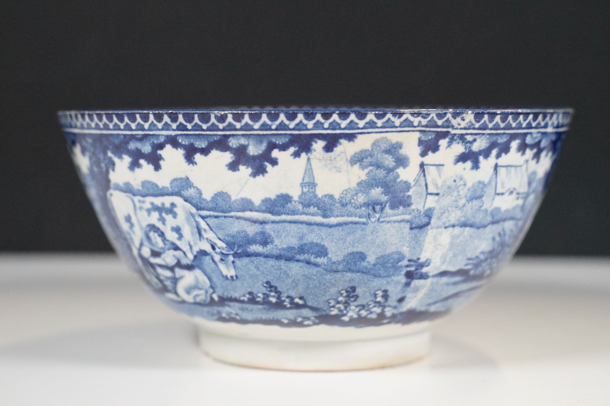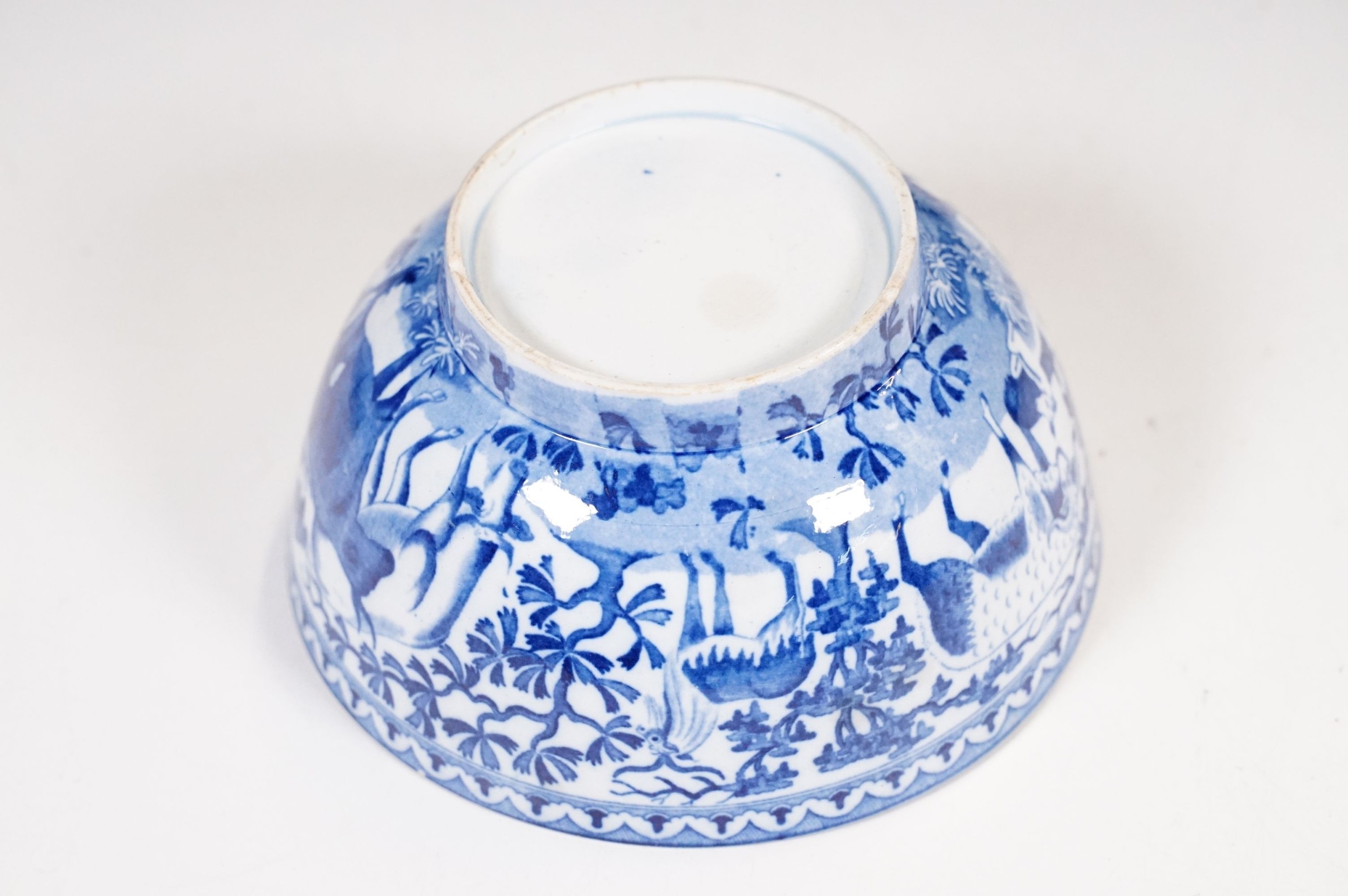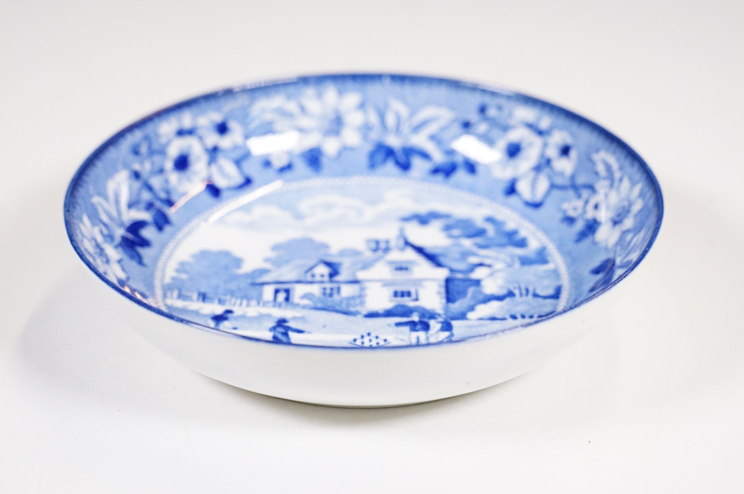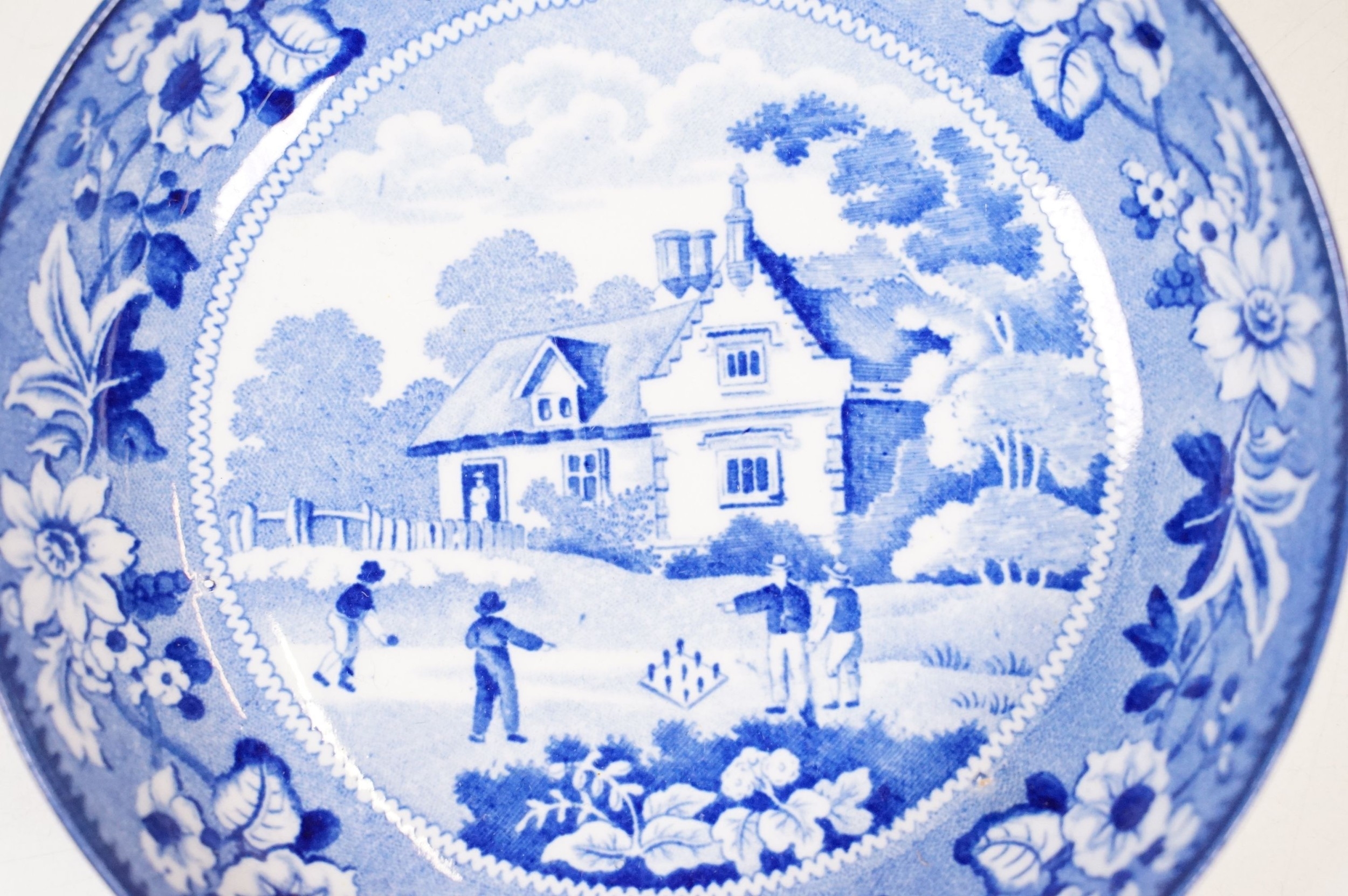 19th century transfer printed blue and white porcelain dish featuring a scene of a house with figures outside playing a game, diameter 14cm, together with a bowl depicting a cow milking scene, diameter 16cm and another with wild forest animals detail surround, diameter 15.5cm