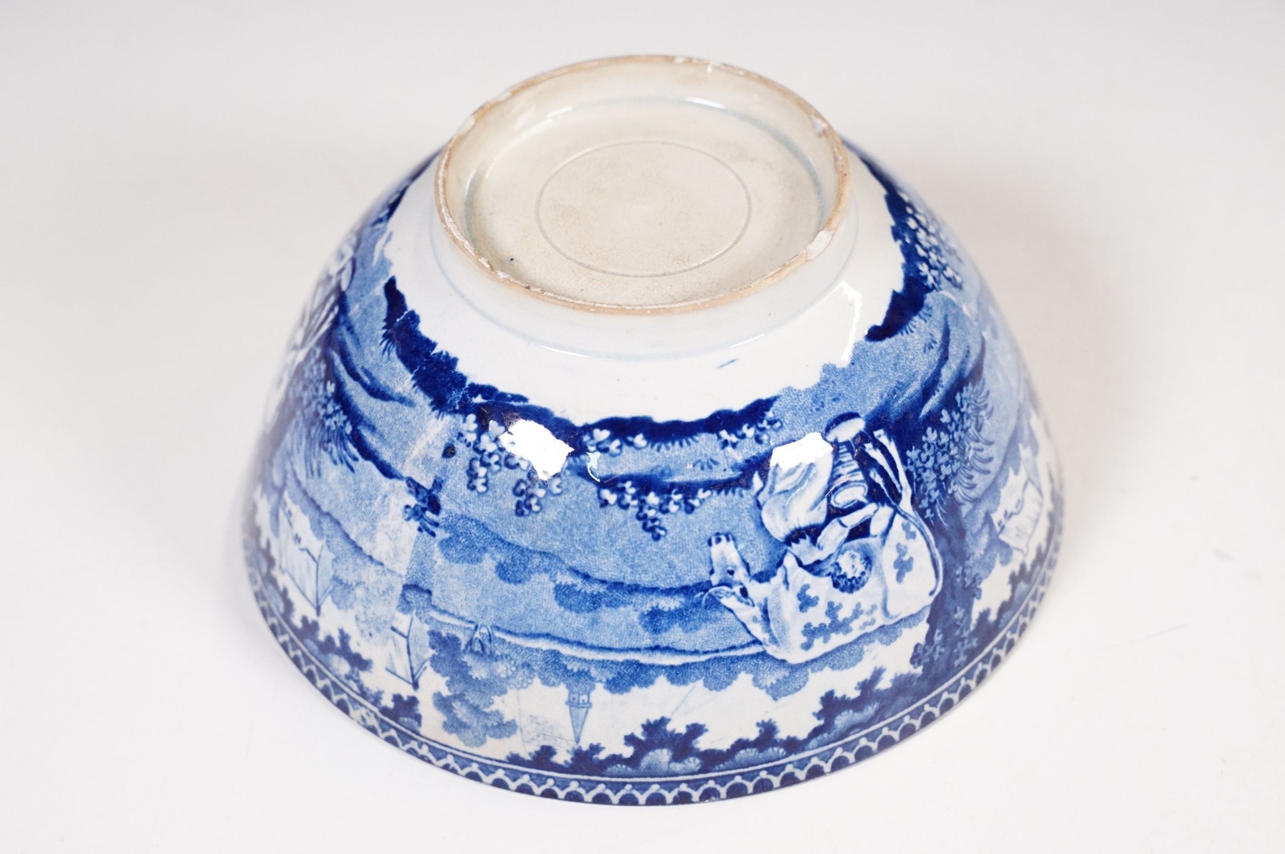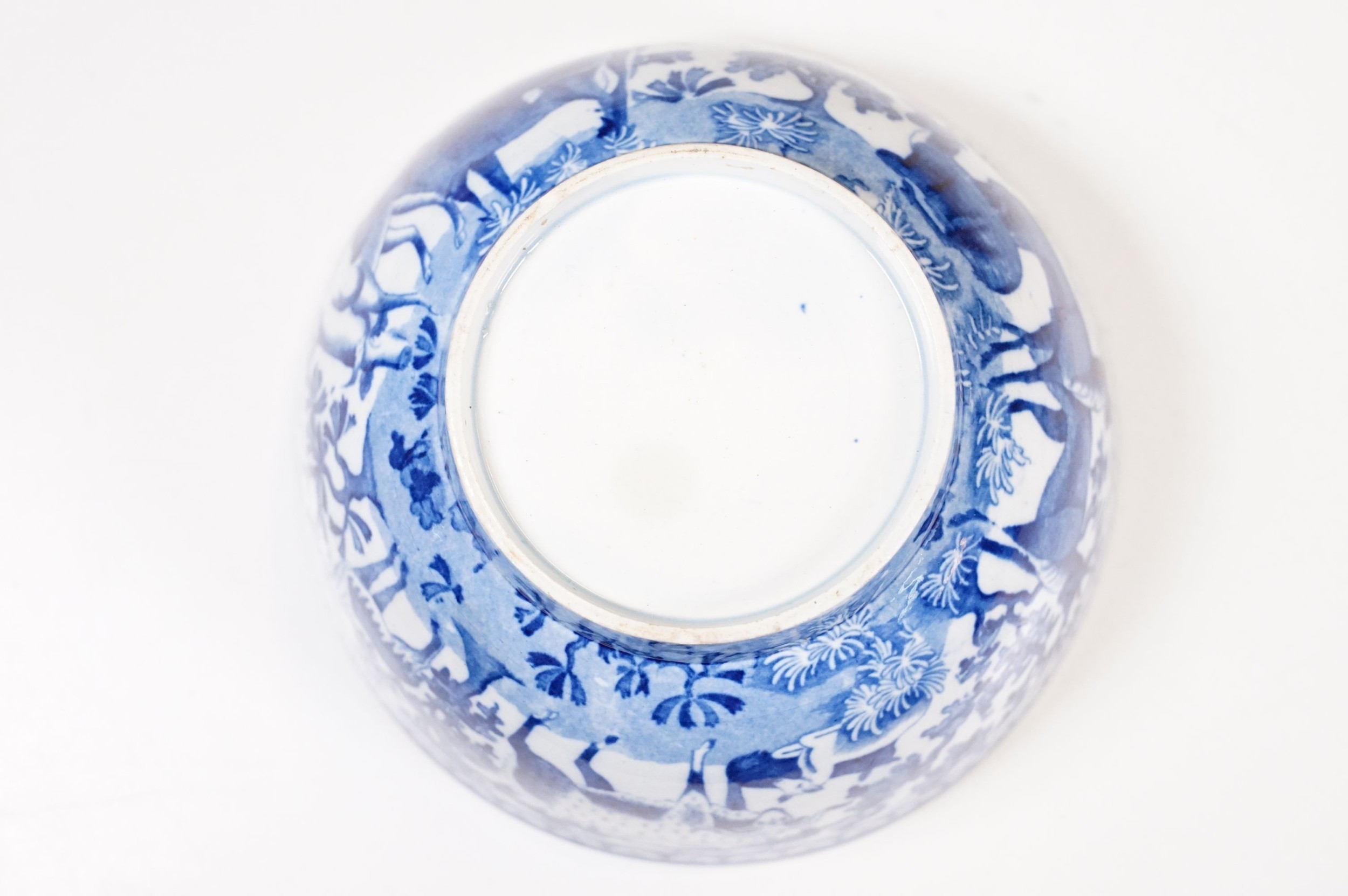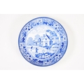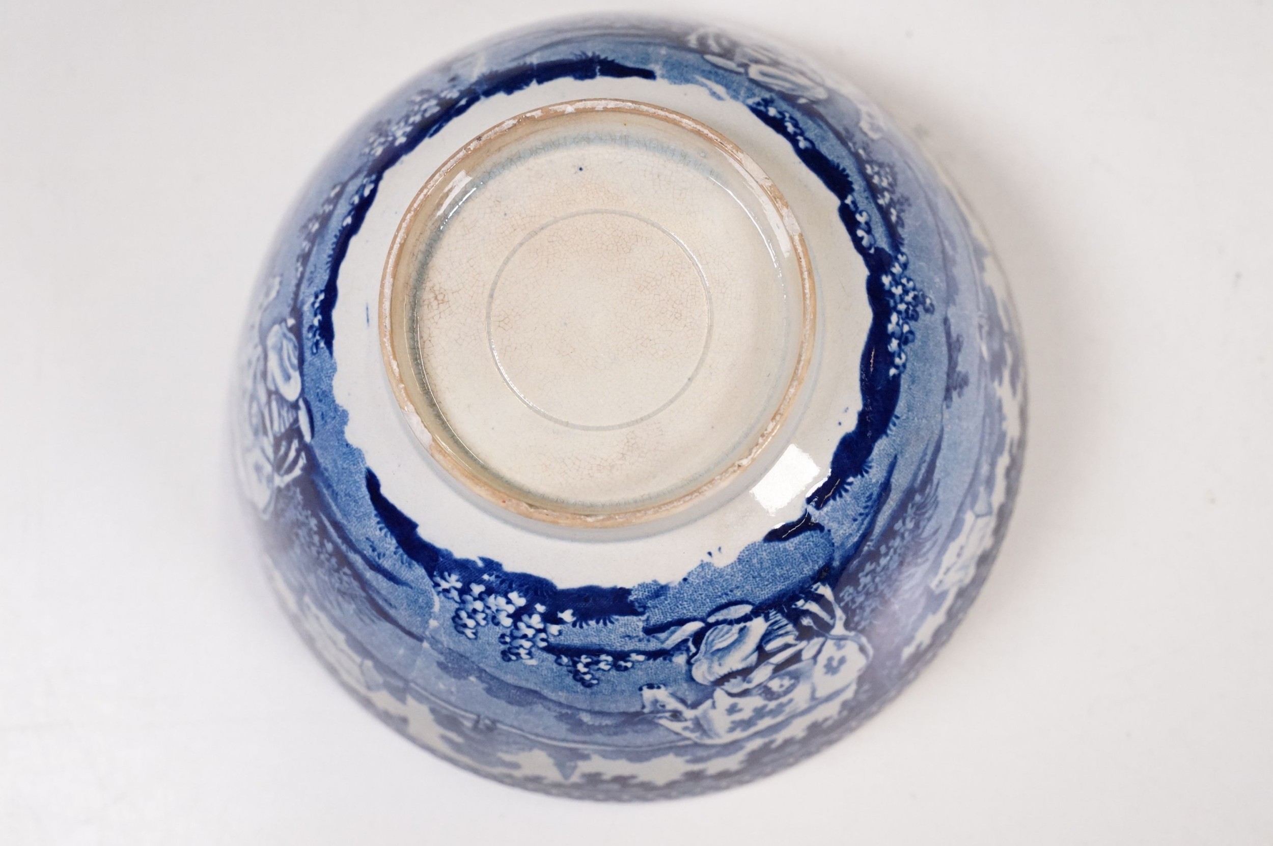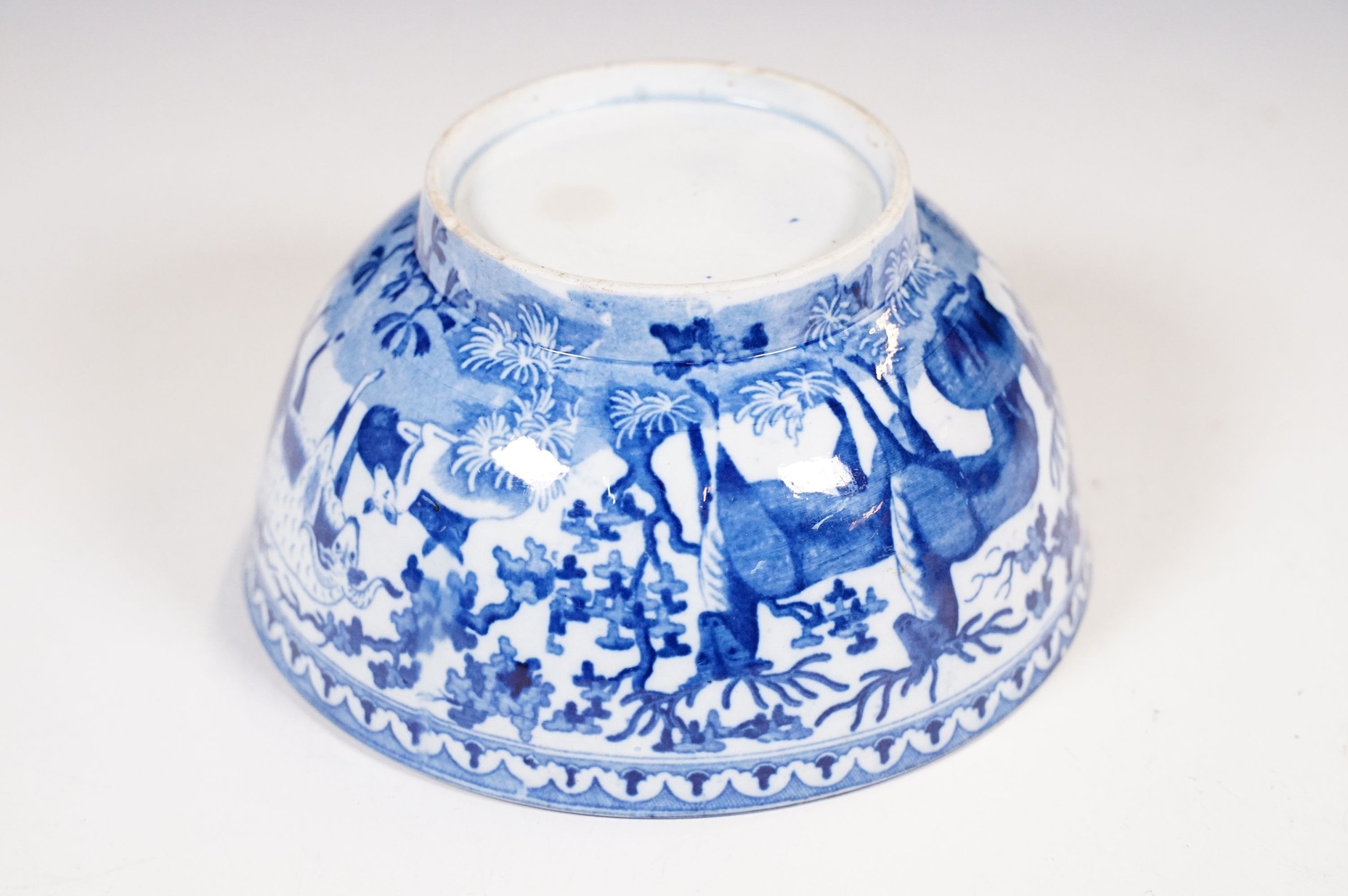19th century transfer printed blue and white porcelain dish featuring a scene of a house with figures outside playing a game, diameter 14cm, together with a bowl depicting a cow milking scene, diameter 16cm and another with wild forest animals detail surround, diameter 15.5cm