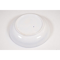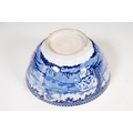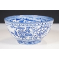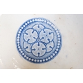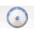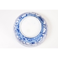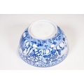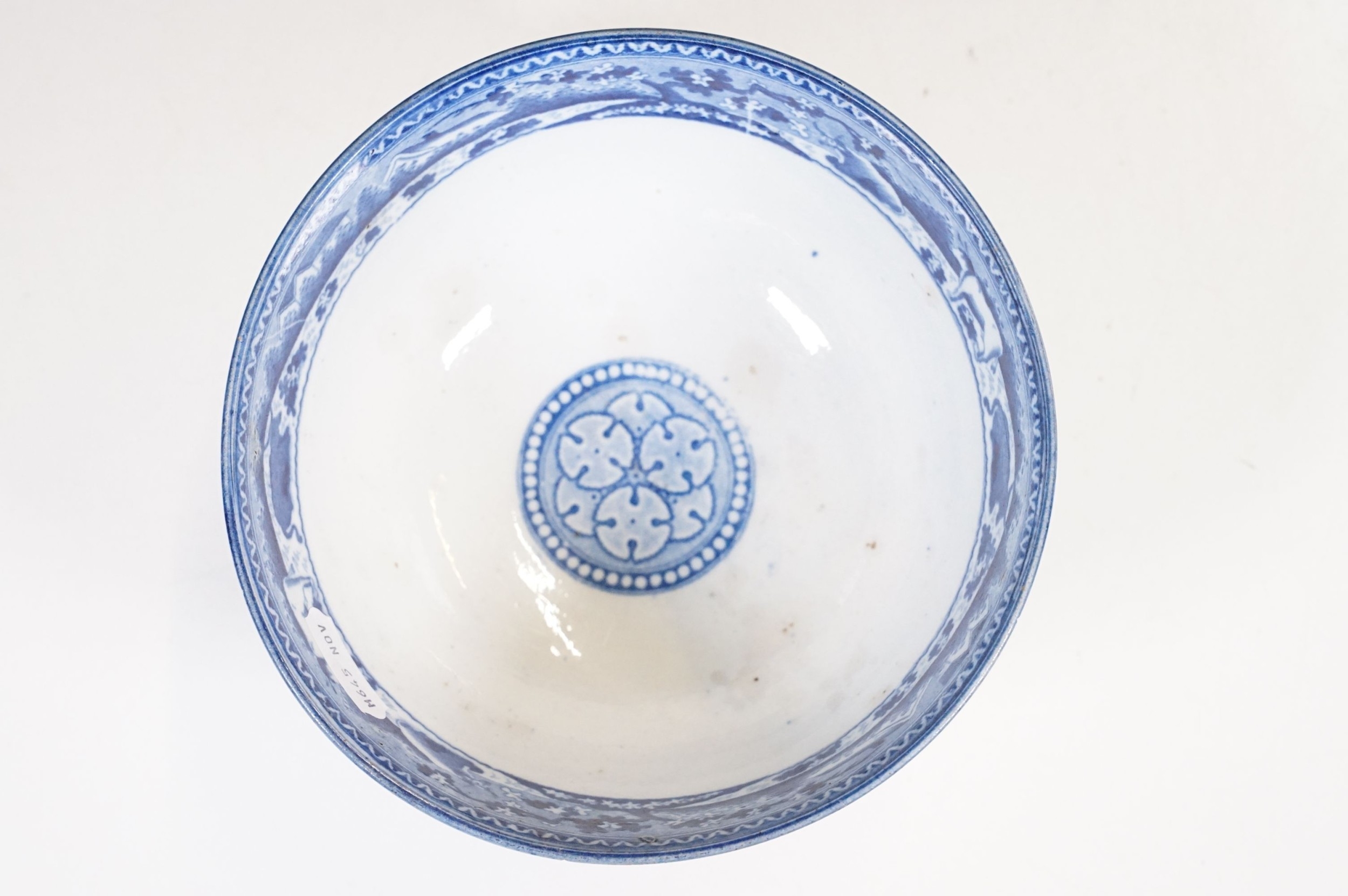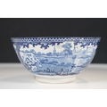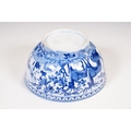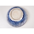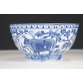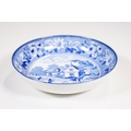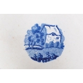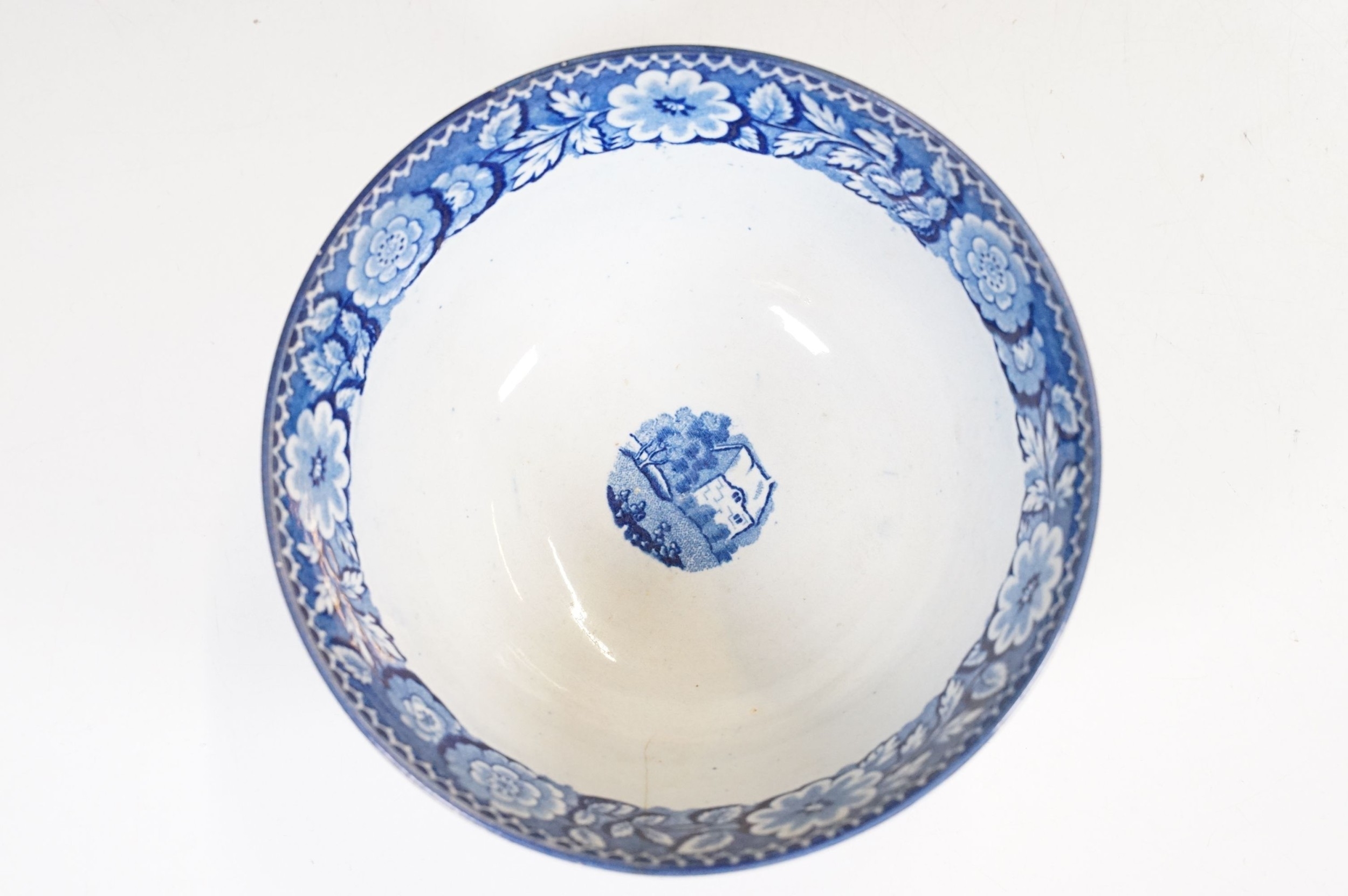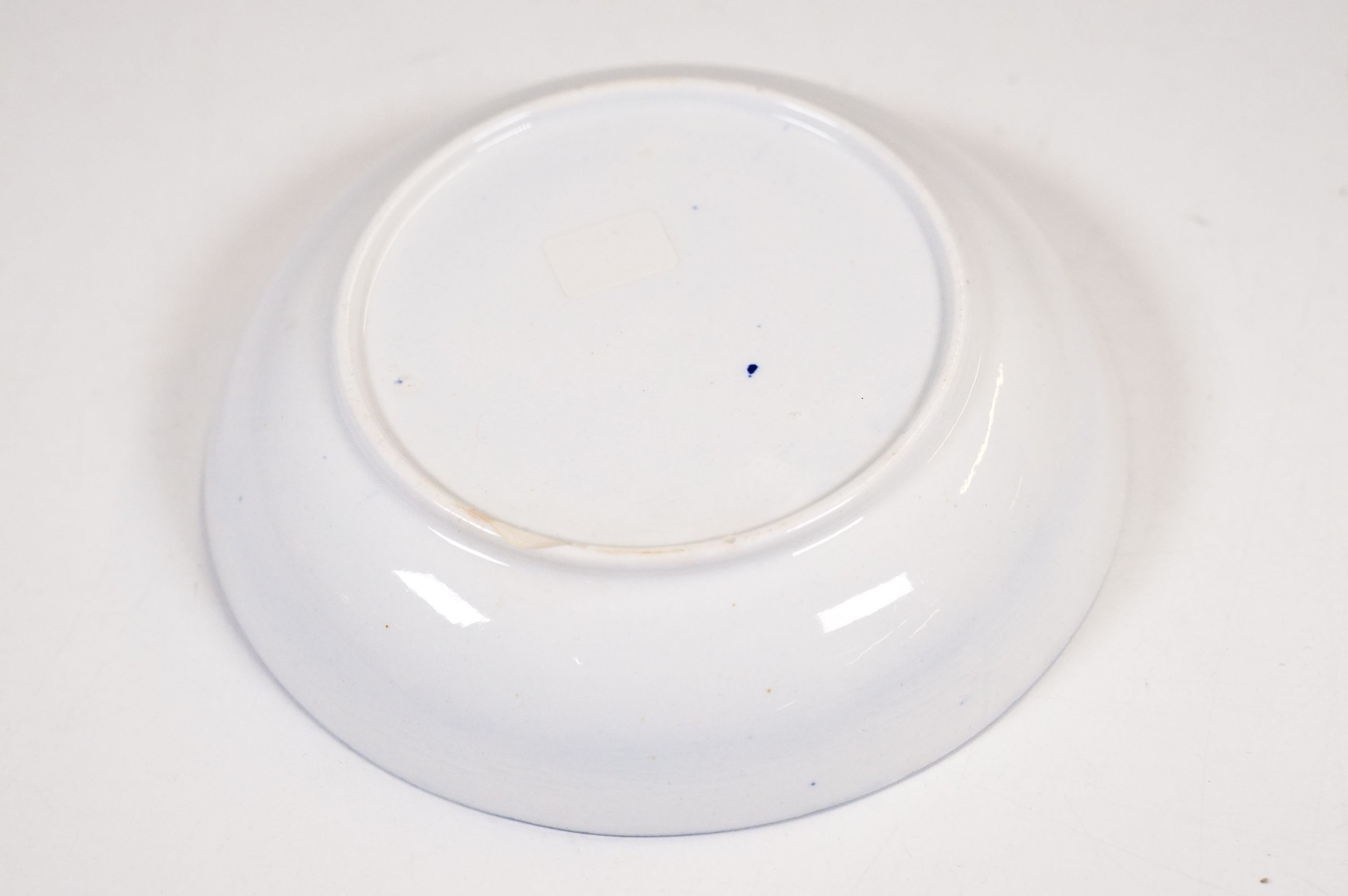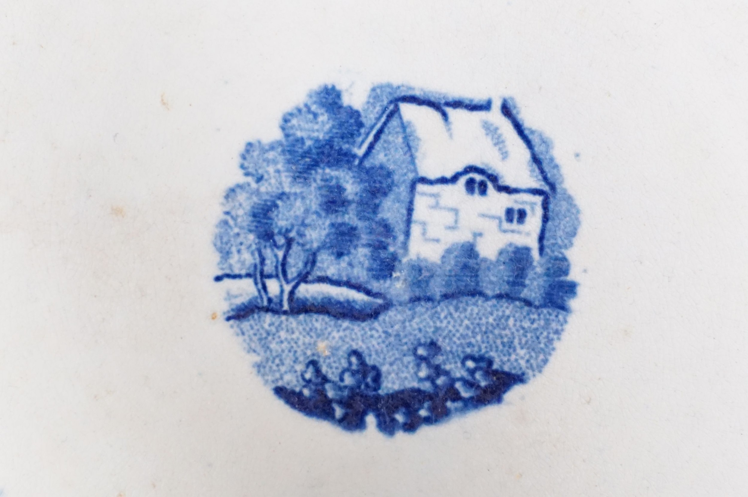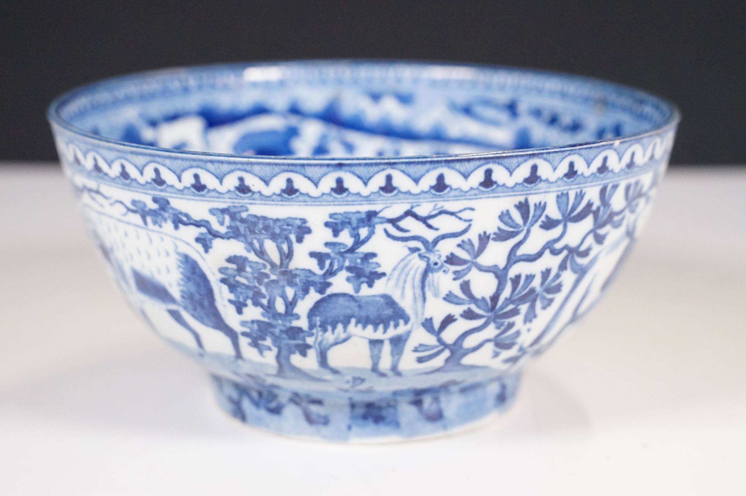 19th century transfer printed blue and white porcelain dish featuring a scene of a house with figures outside playing a game, diameter 14cm, together with a bowl depicting a cow milking scene, diameter 16cm and another with wild forest animals detail surround, diameter 15.5cm