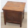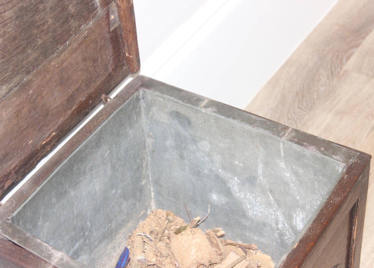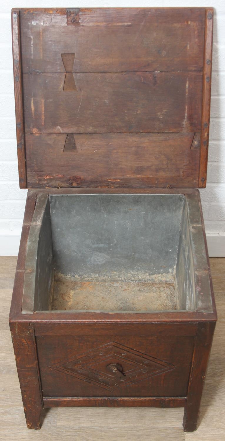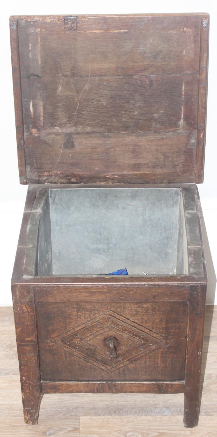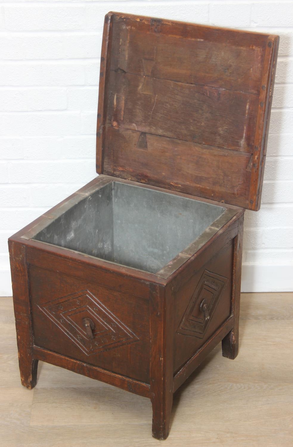An antique oak cellarette or coal bucket with metal lining, seemingly made from parts of an 18th century oak coffer, with split iron hinges, approx 48cm wide x 45cm deep x 49cm tall