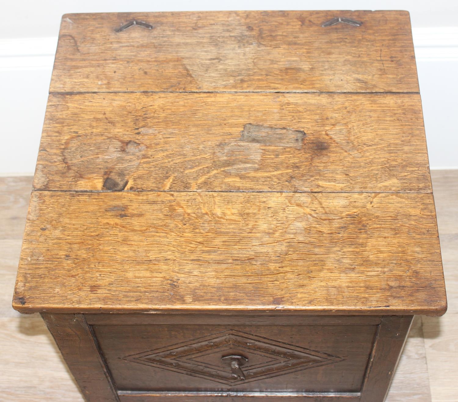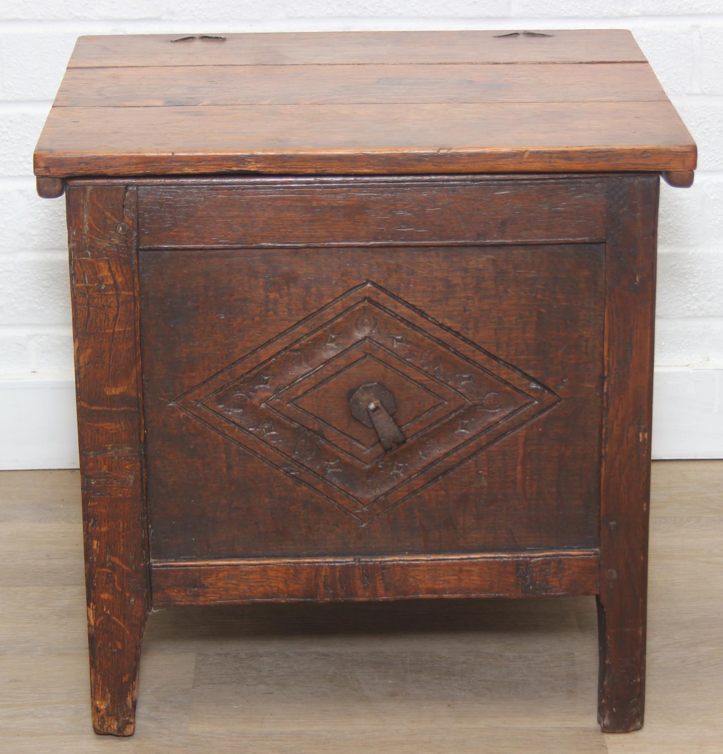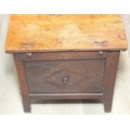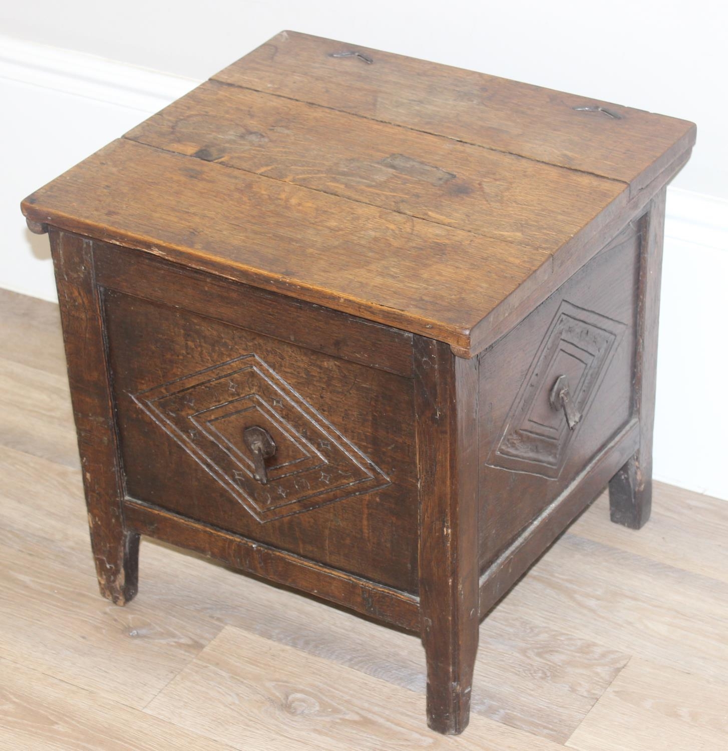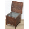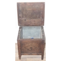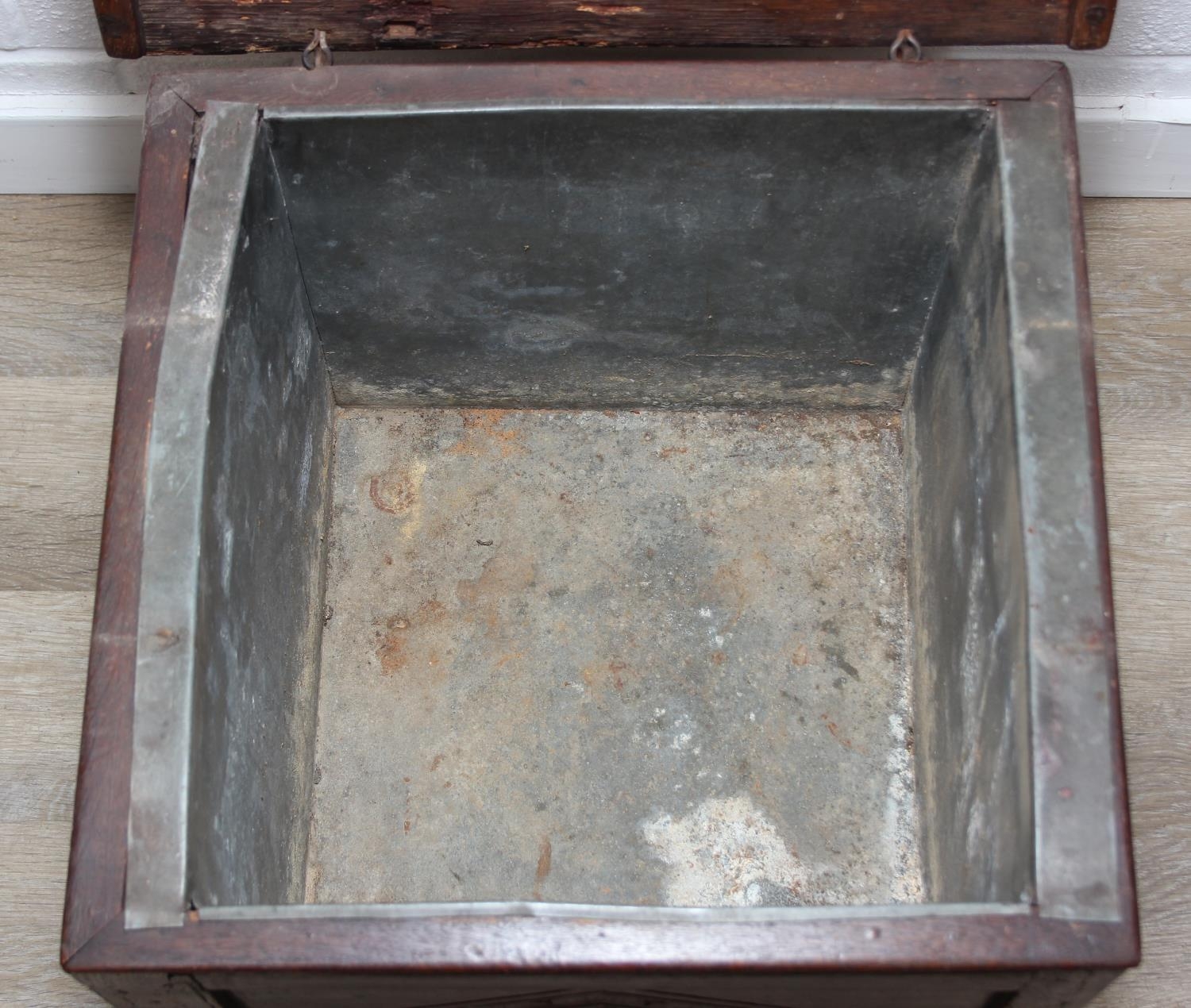 An antique oak cellarette or coal bucket with metal lining, seemingly made from parts of an 18th century oak coffer, with split iron hinges, approx 48cm wide x 45cm deep x 49cm tall