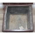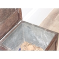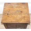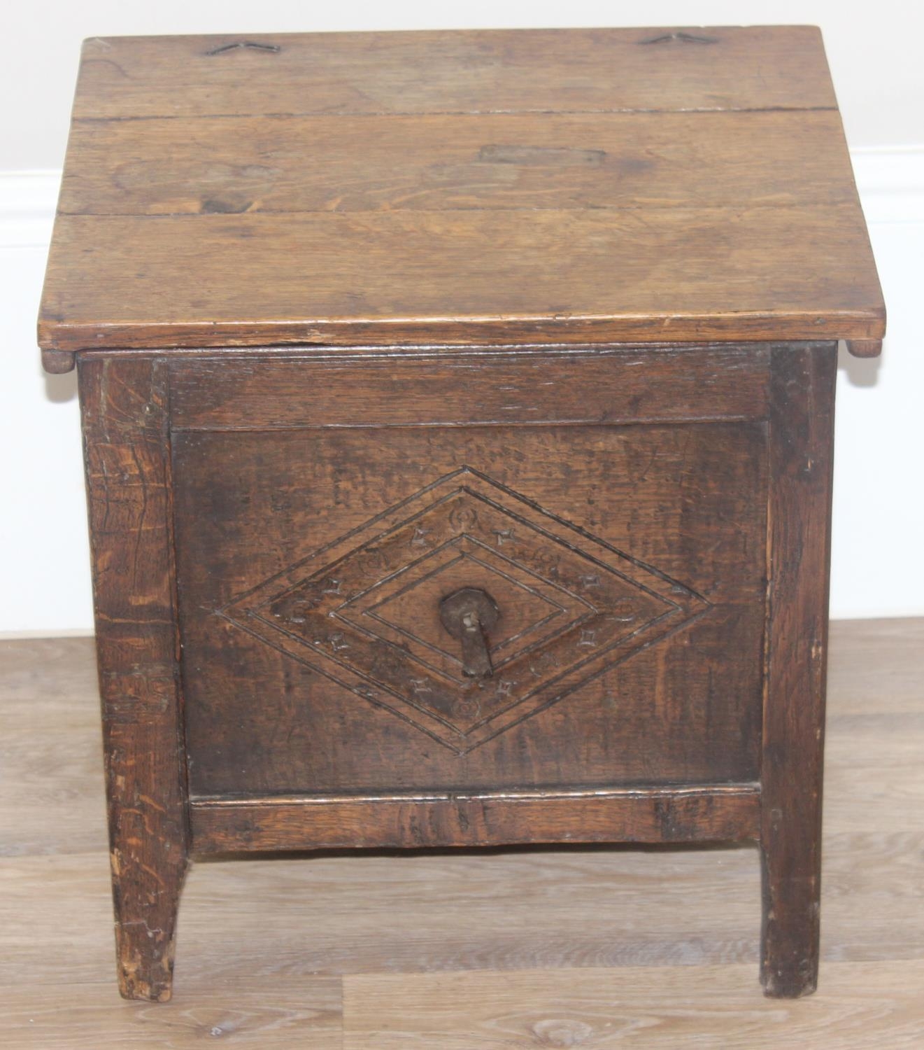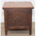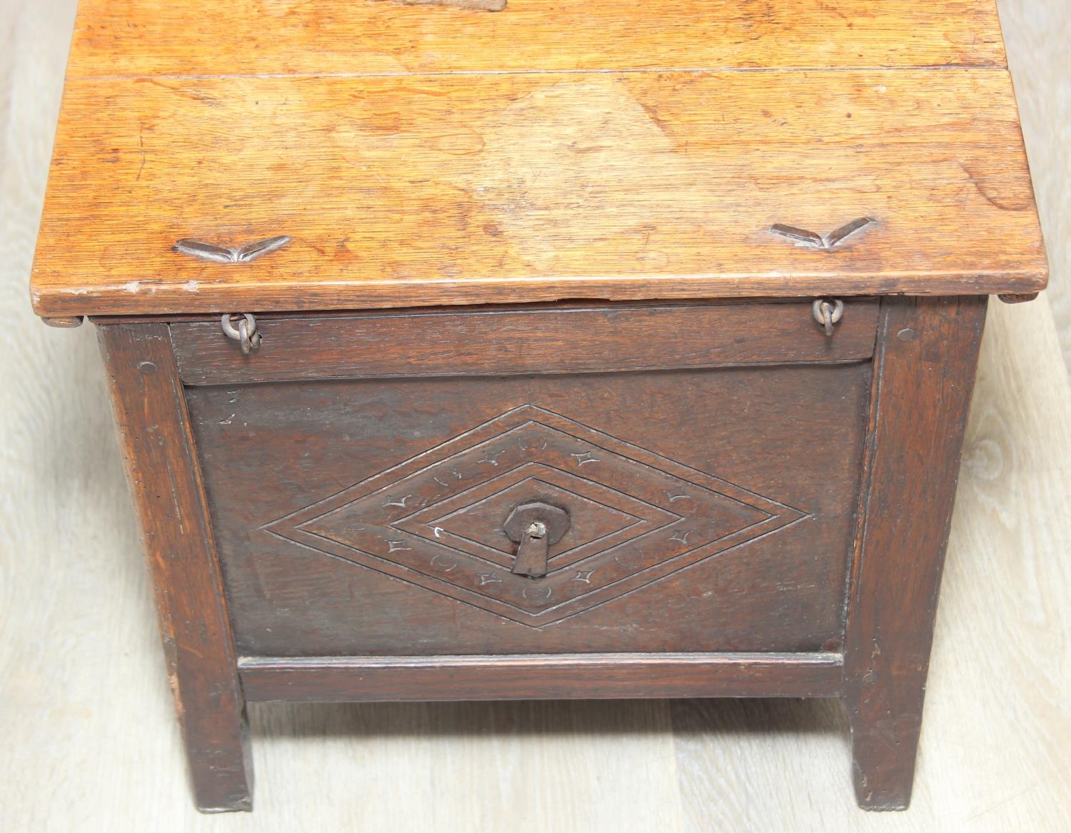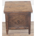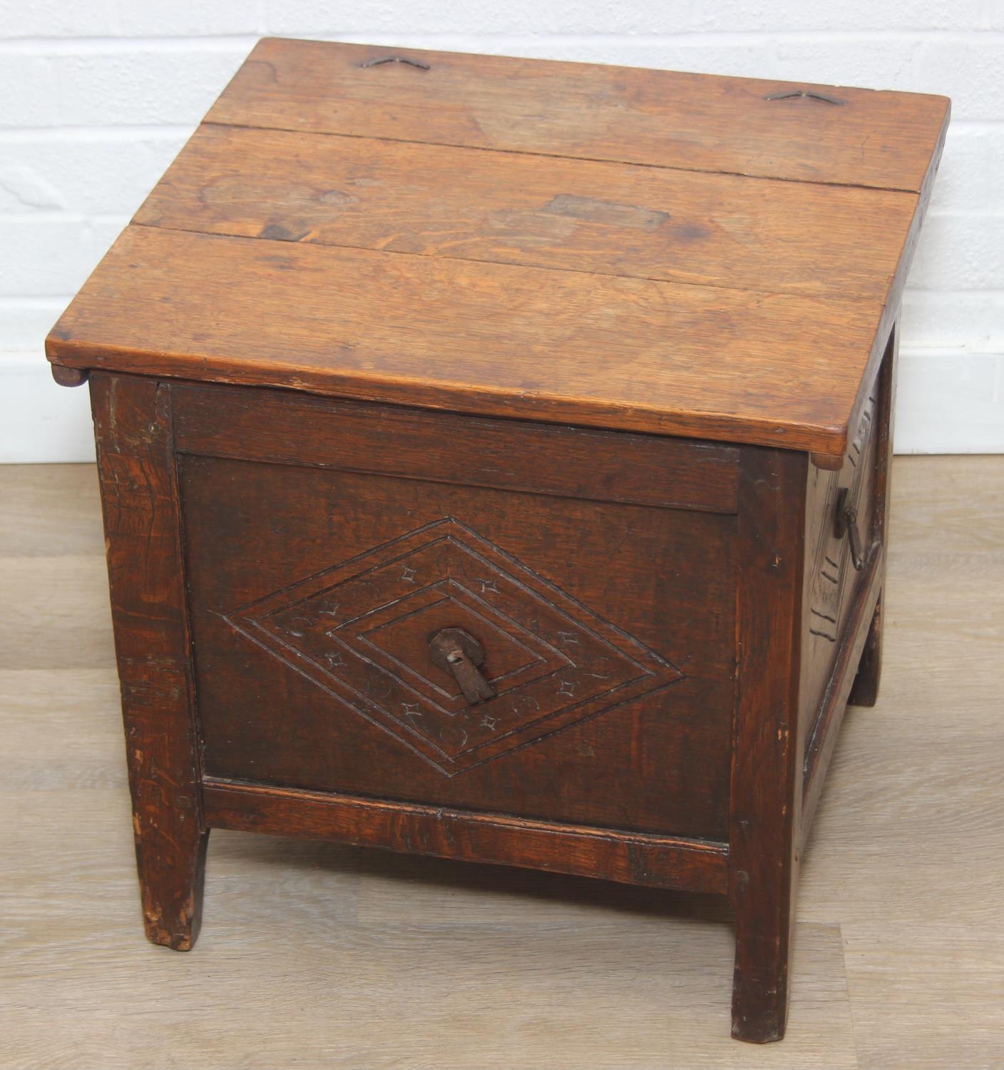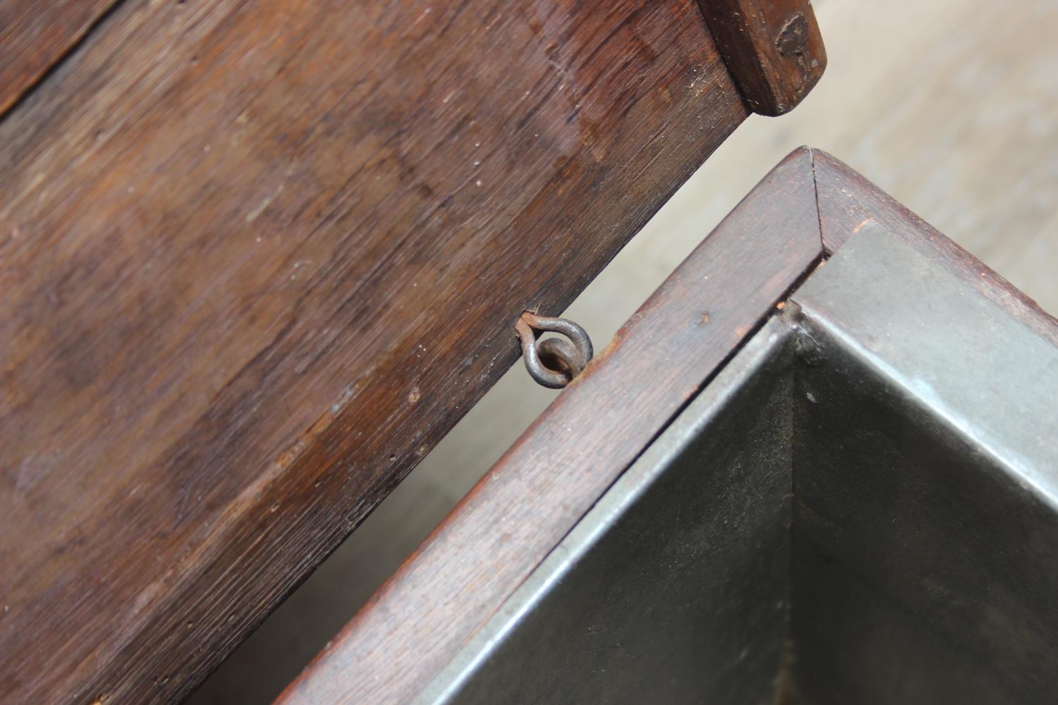 An antique oak cellarette or coal bucket with metal lining, seemingly made from parts of an 18th century oak coffer, with split iron hinges, approx 48cm wide x 45cm deep x 49cm tall