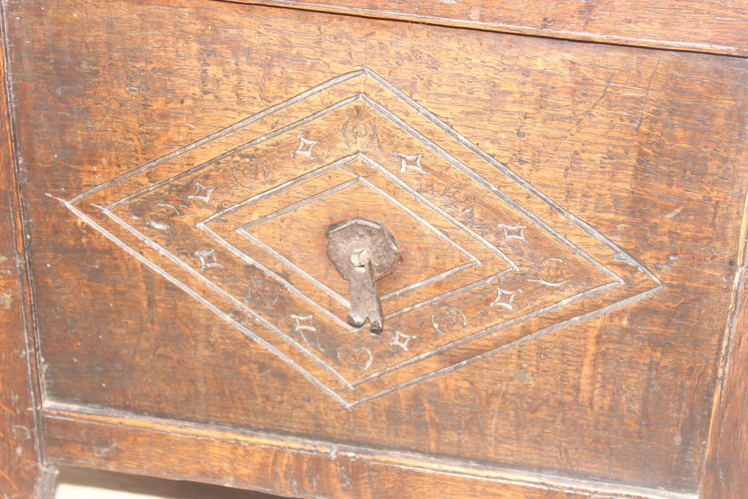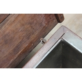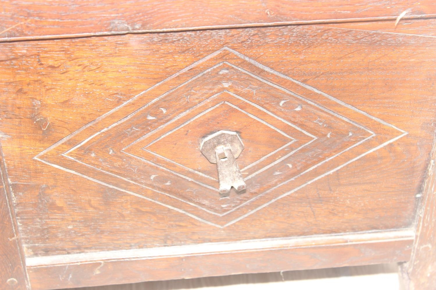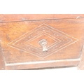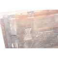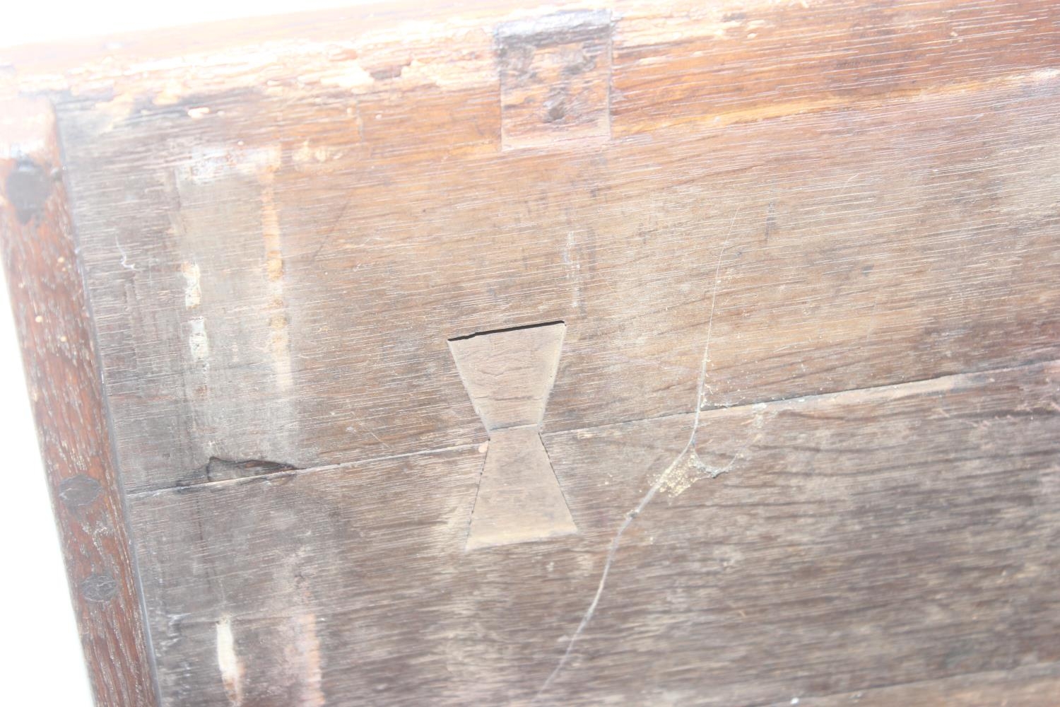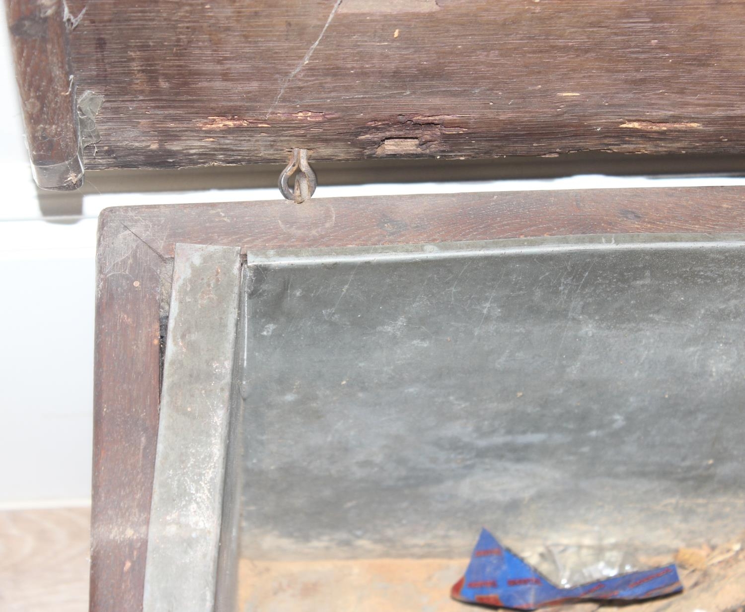 An antique oak cellarette or coal bucket with metal lining, seemingly made from parts of an 18th century oak coffer, with split iron hinges, approx 48cm wide x 45cm deep x 49cm tall