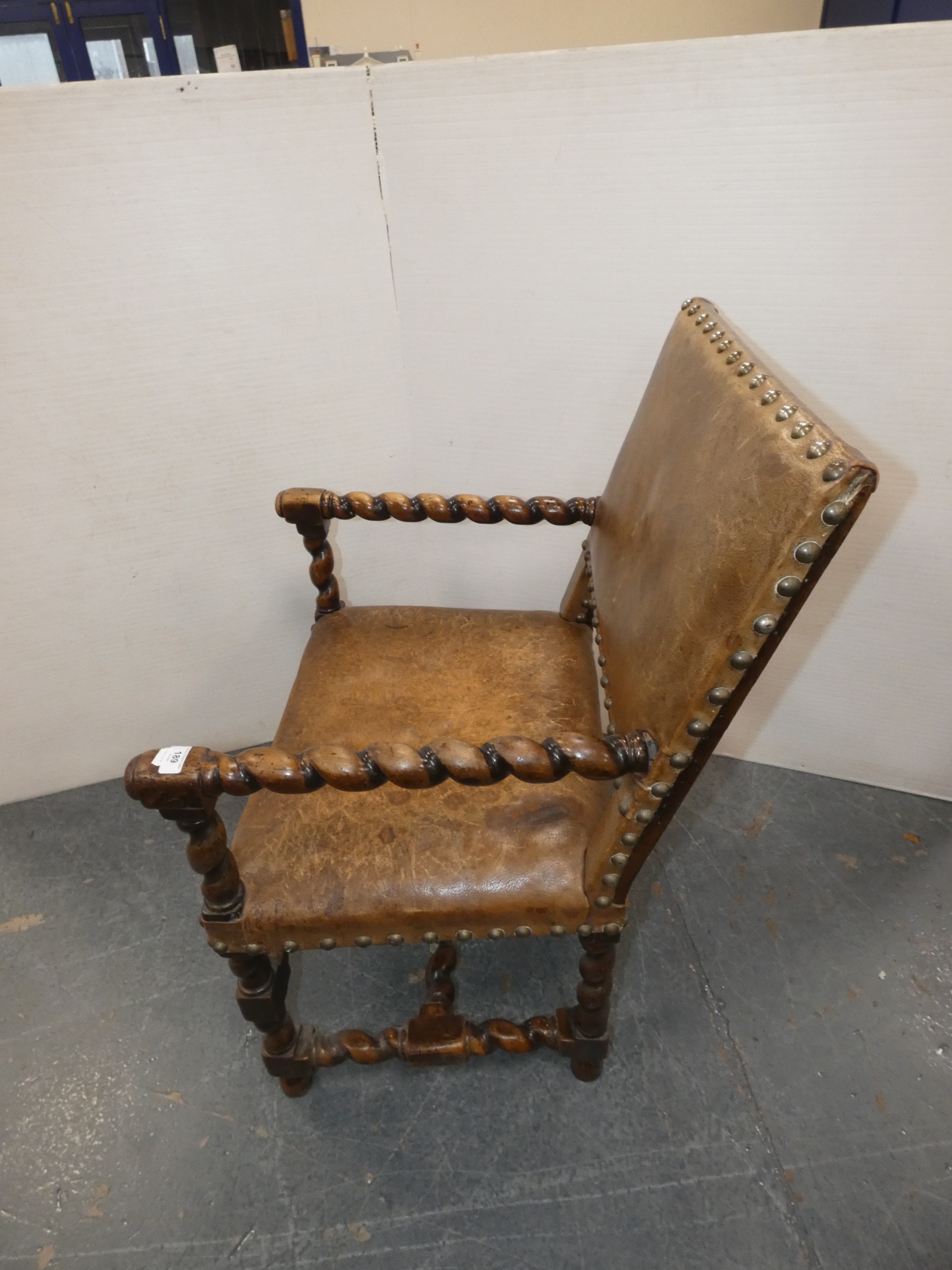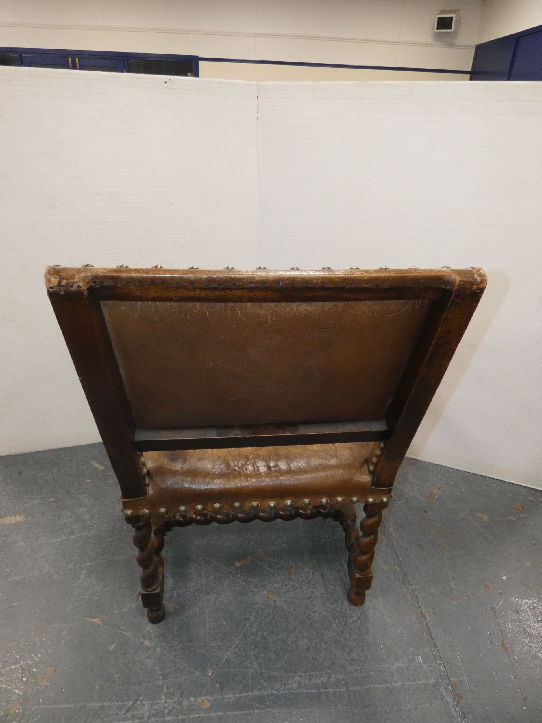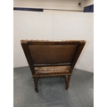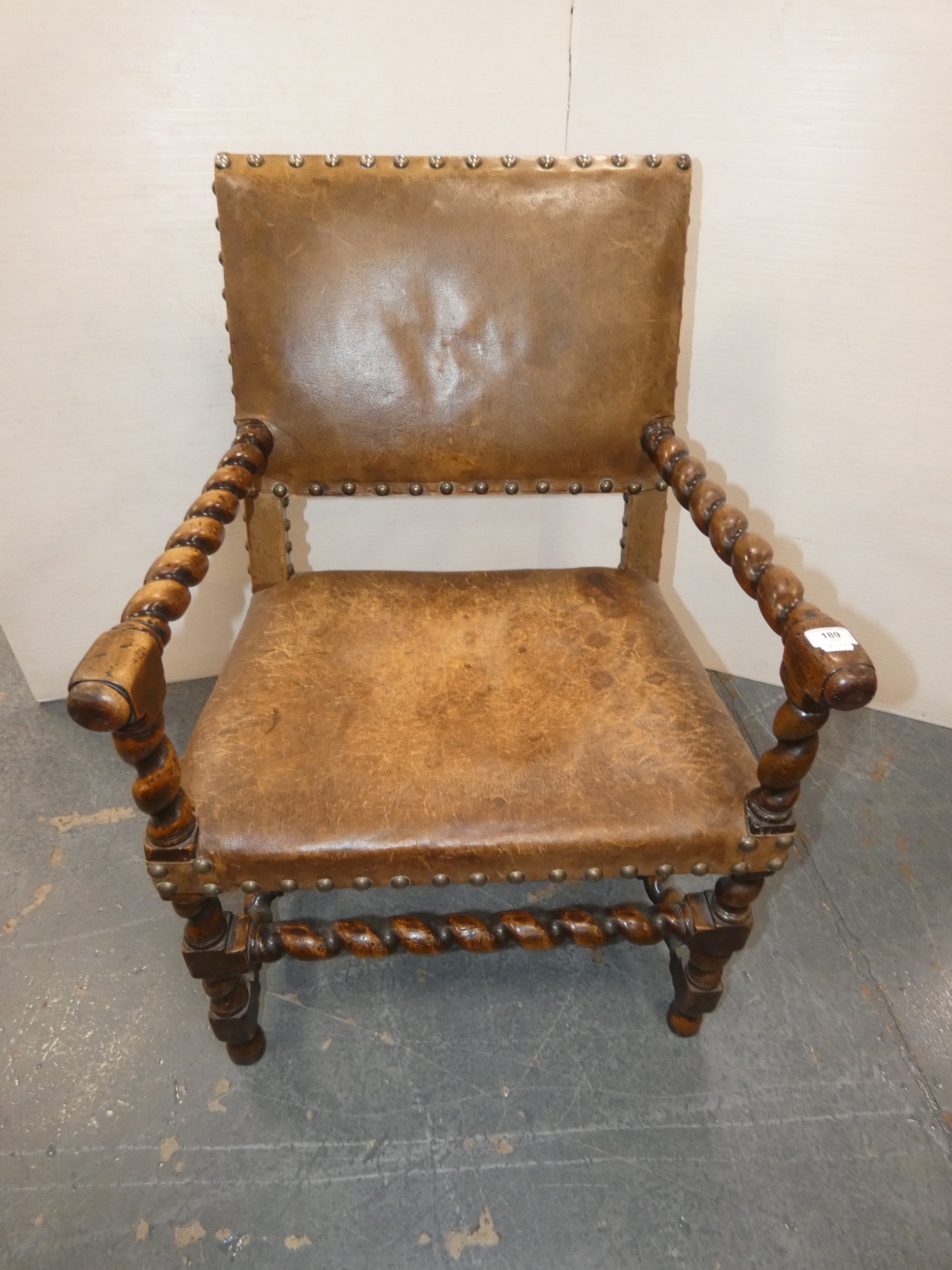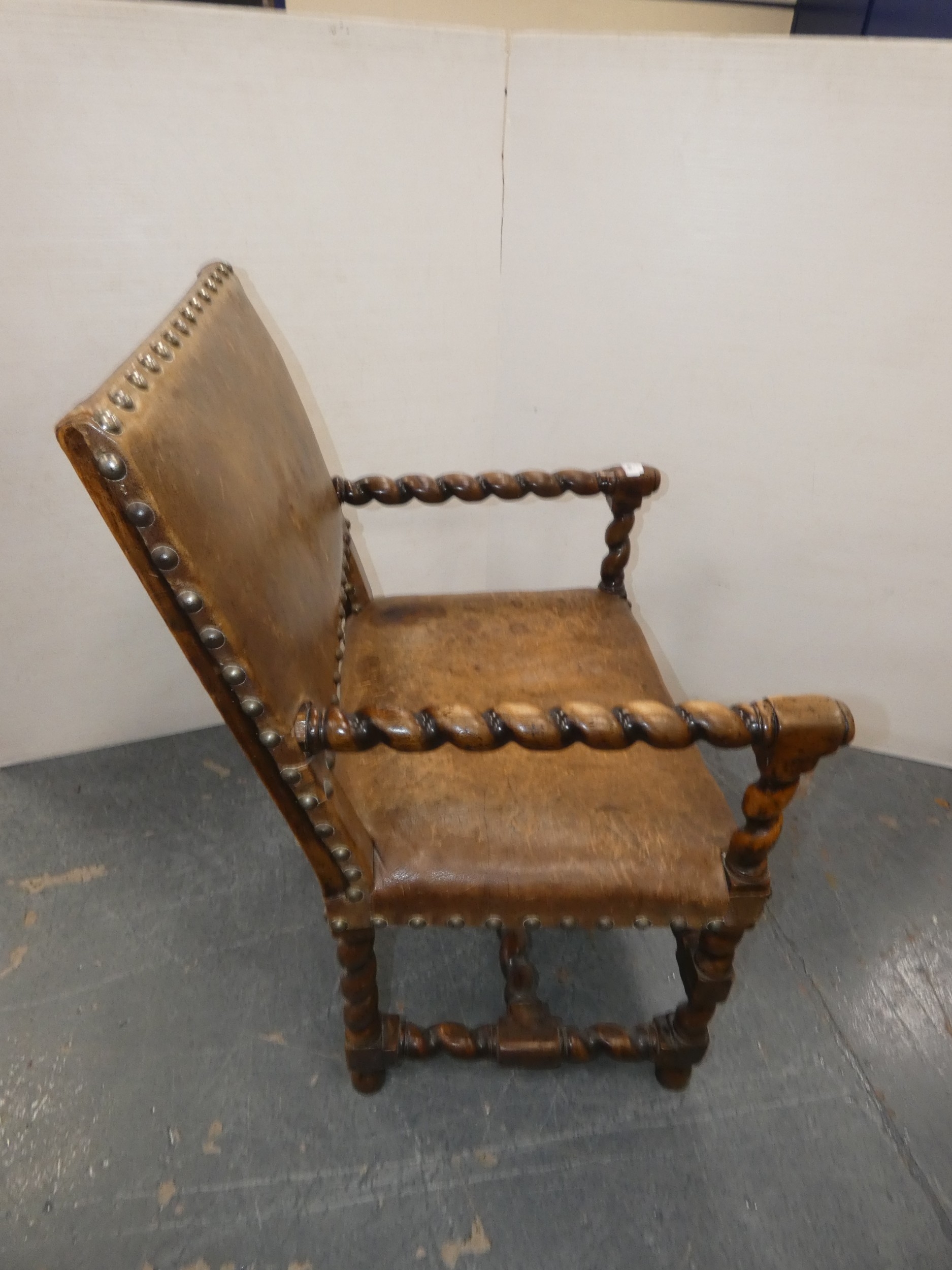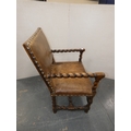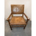 Antique walnut barley column open armchair with studded hide back rest and seat.