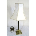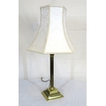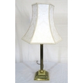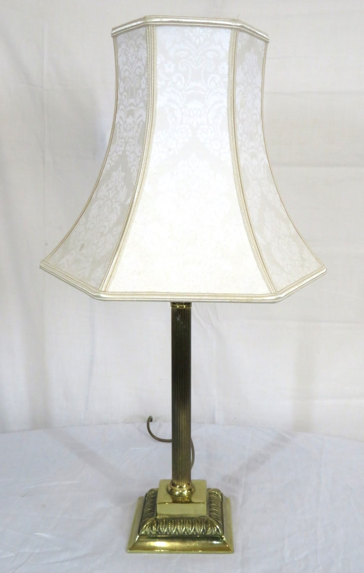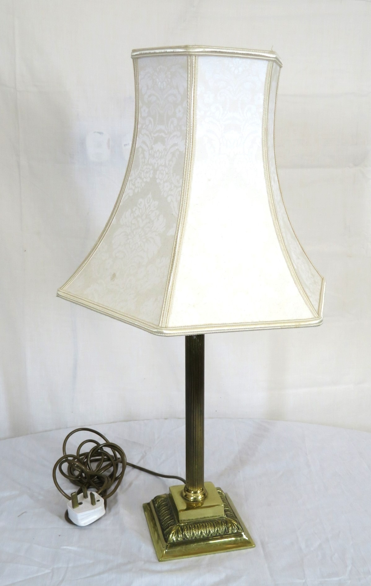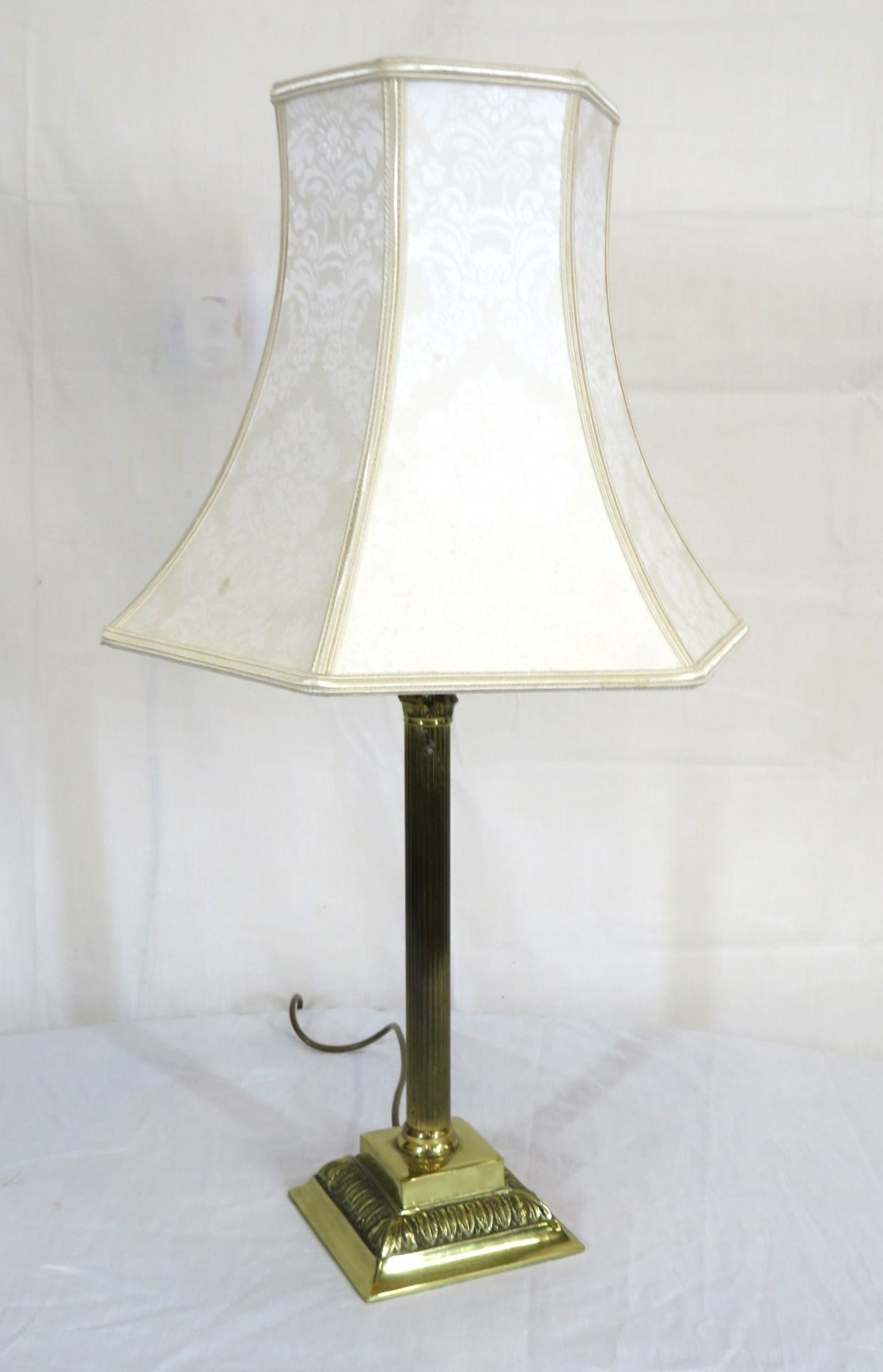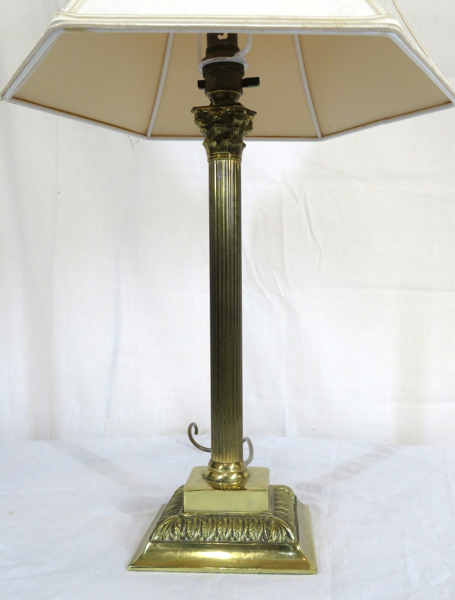Brass electric lamp with reeded Corinthian column and foliate stepped base