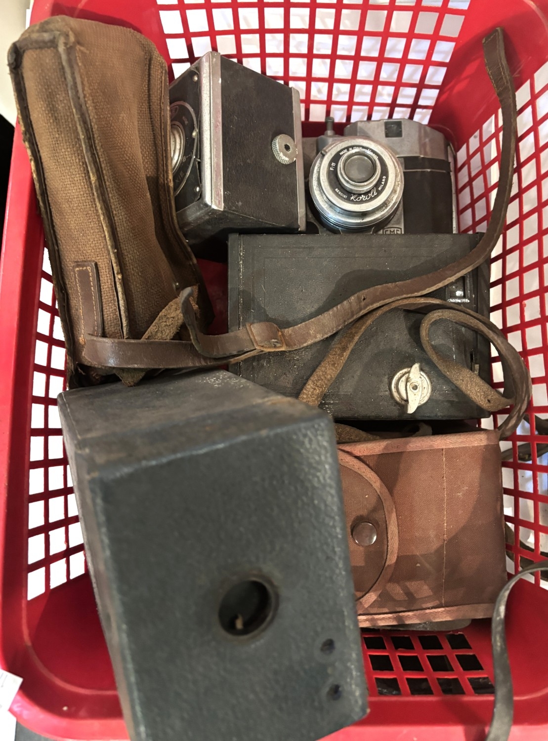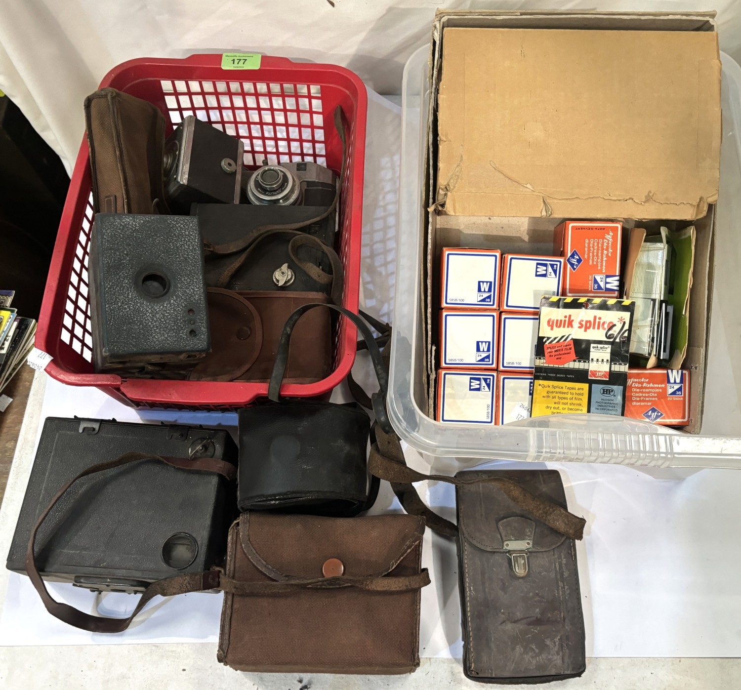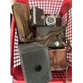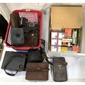 A 19th century etching of Tom Oliver framed with pencil notes; a collection of box cameras etc; framed cigarette cards etc.