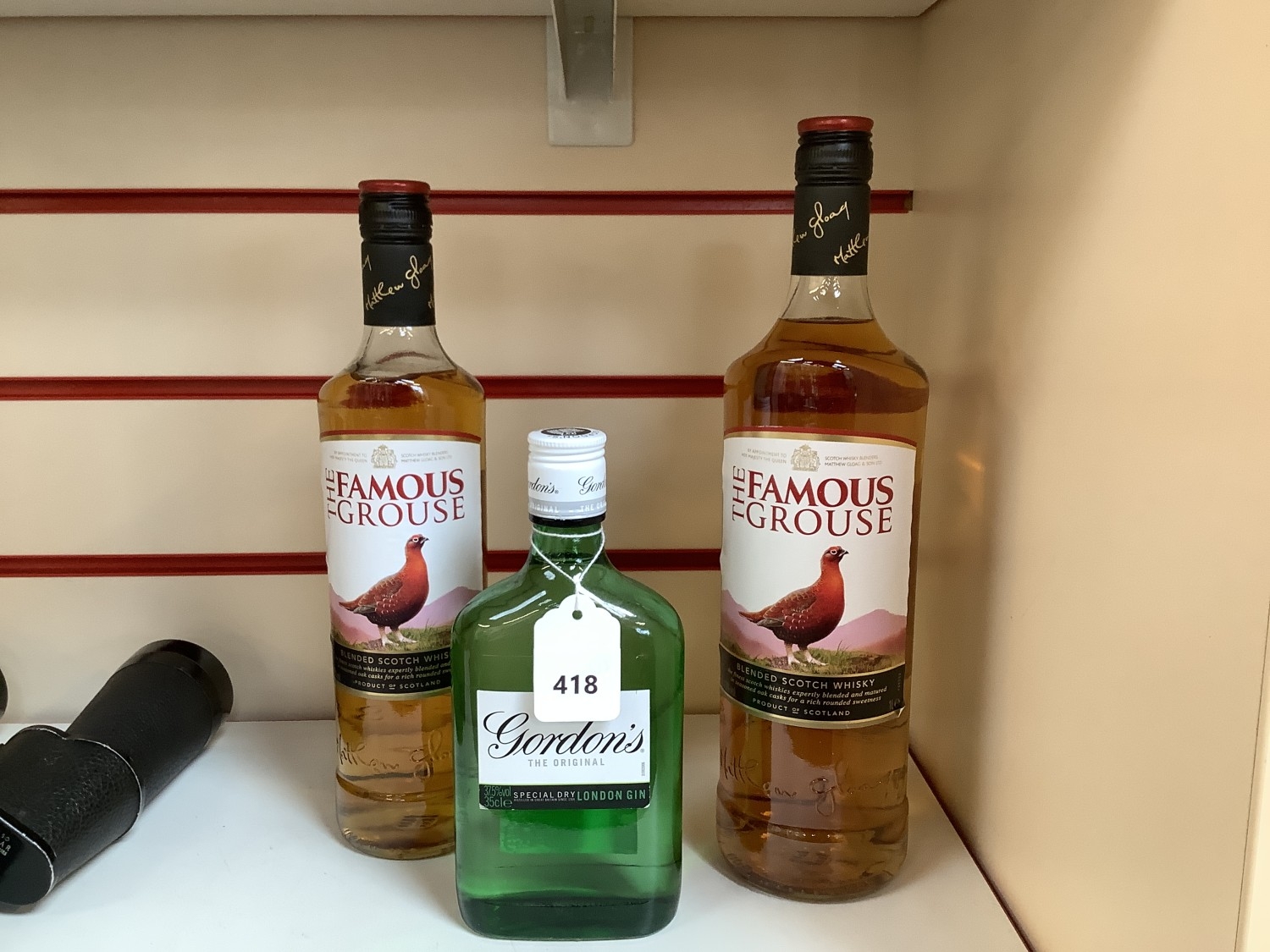 A one litre bottle of the Famous Grouse Scotch Whisky, a 700 ml bottle of the Famous Grouse Scotch Whisky and a 35 cl bottle of Gordons Dry London Gin