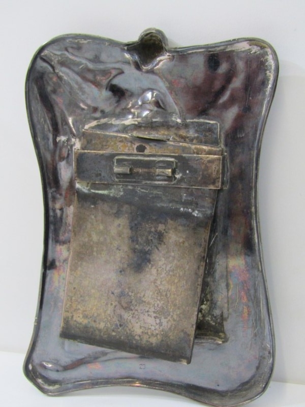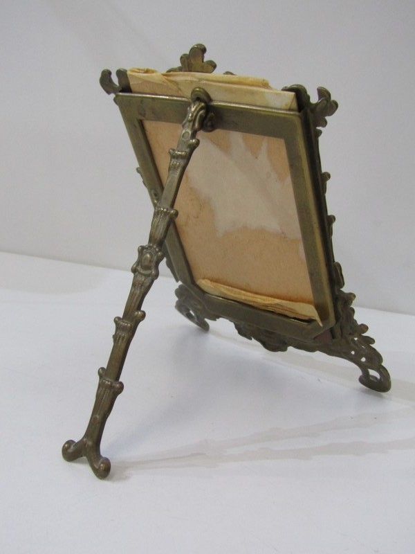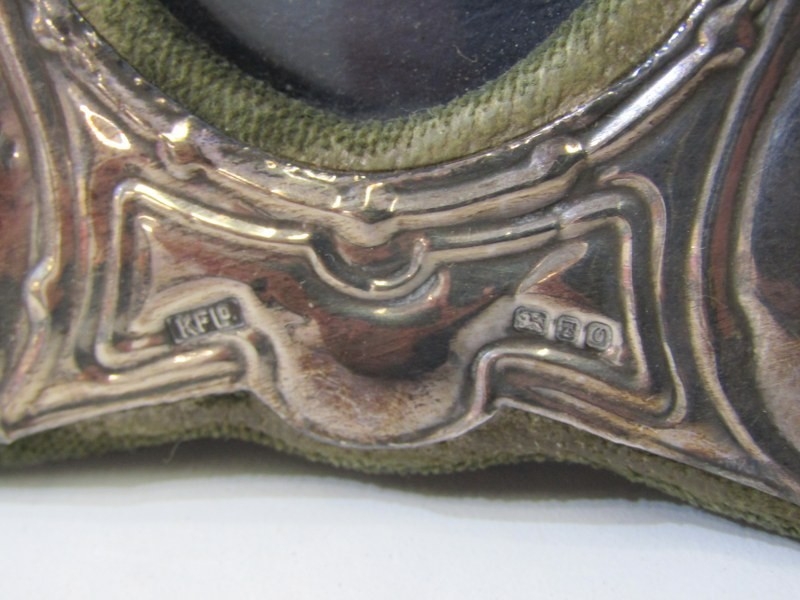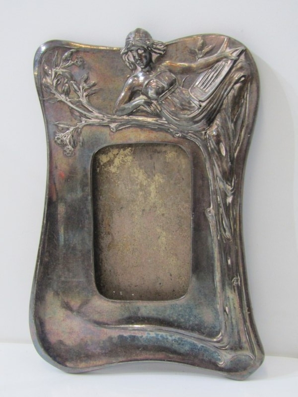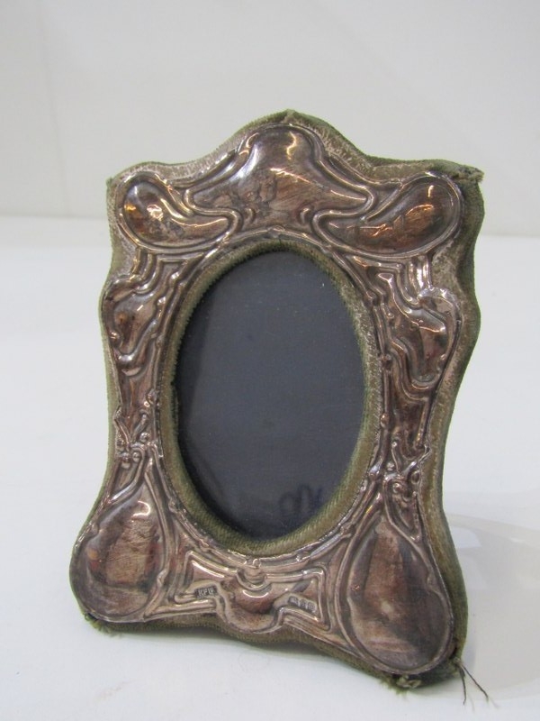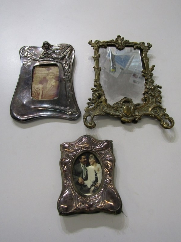 PHOTO FRAMES, a small photo frame with silver mount, together with a brass framed example and an Art Nouveau plated frame