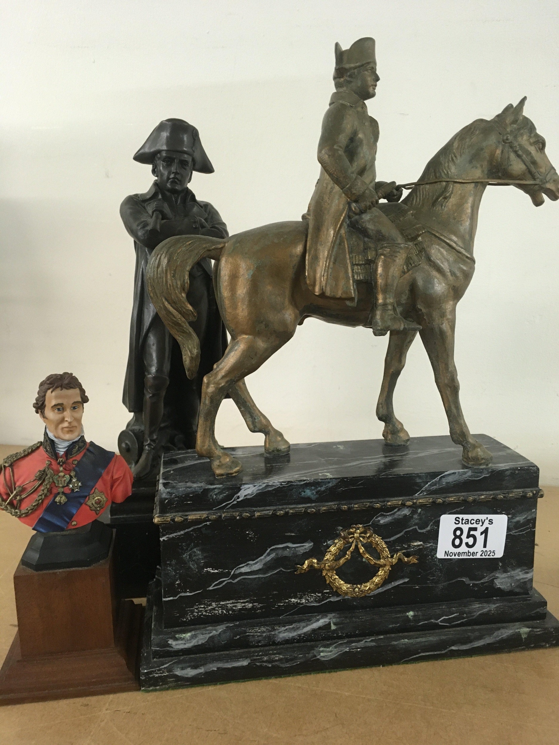 A brass figure of Napoleon on horse back mounted on a simulated marble base Together with a bronzed figure of Napoleon and a small bust of Wellington .