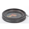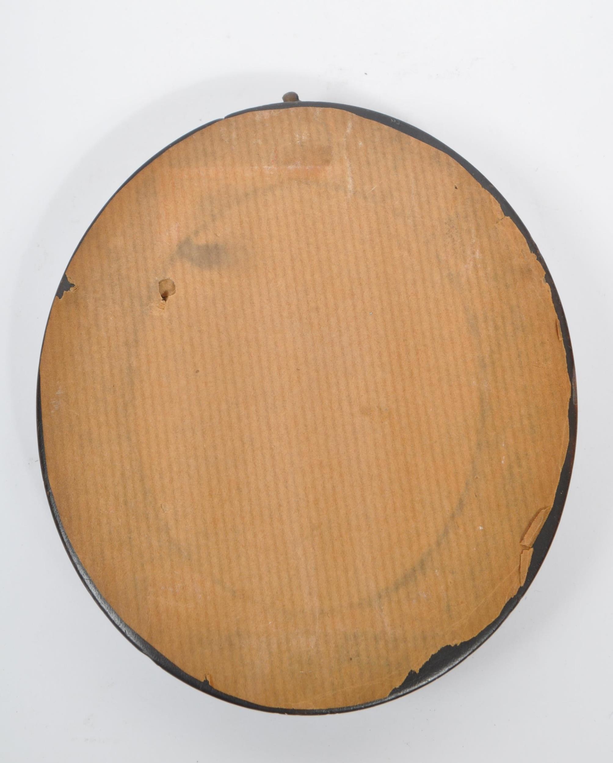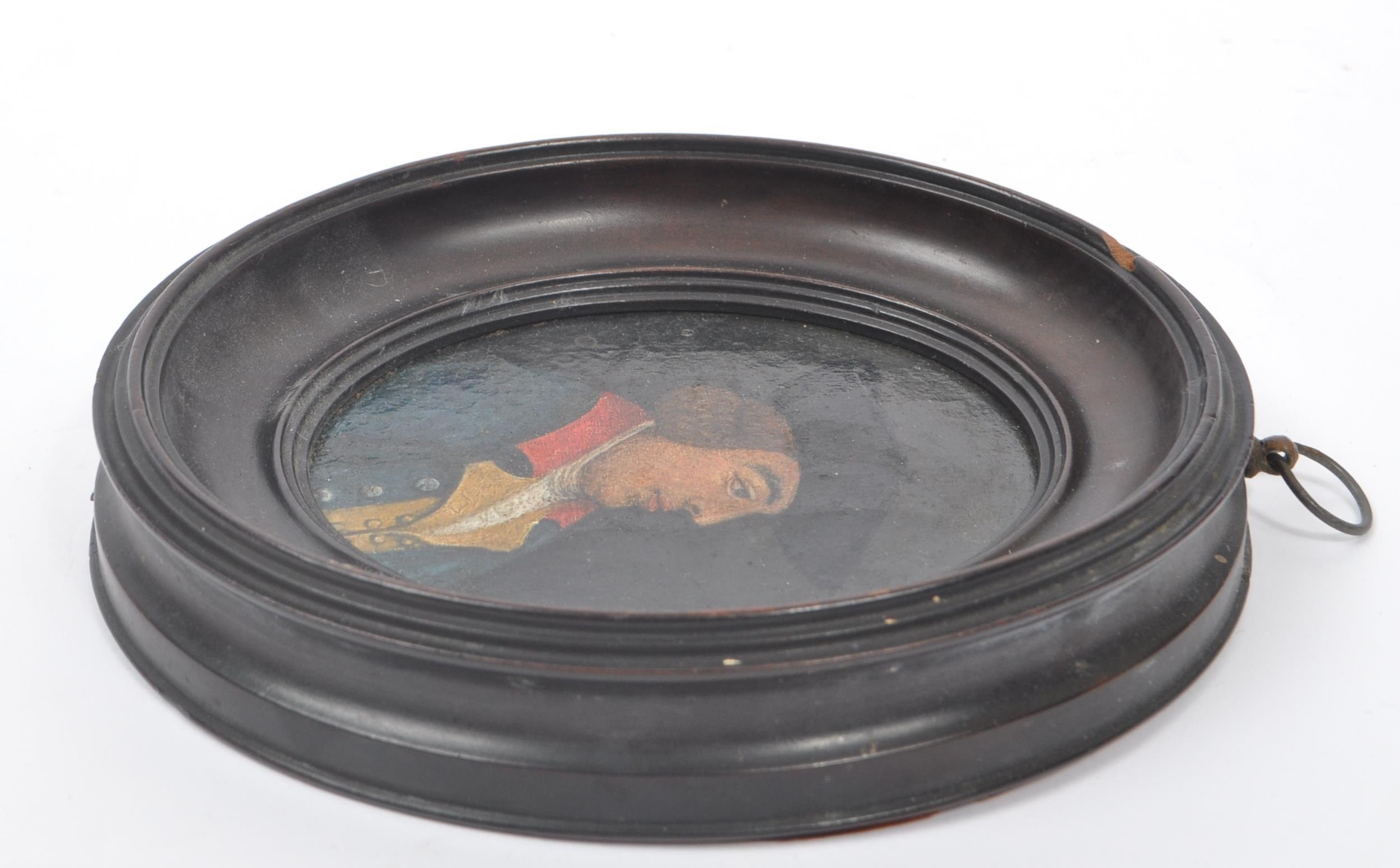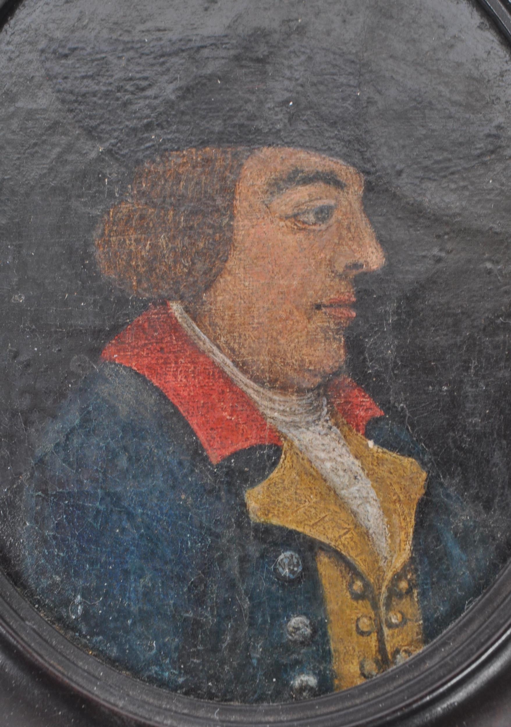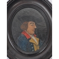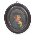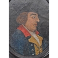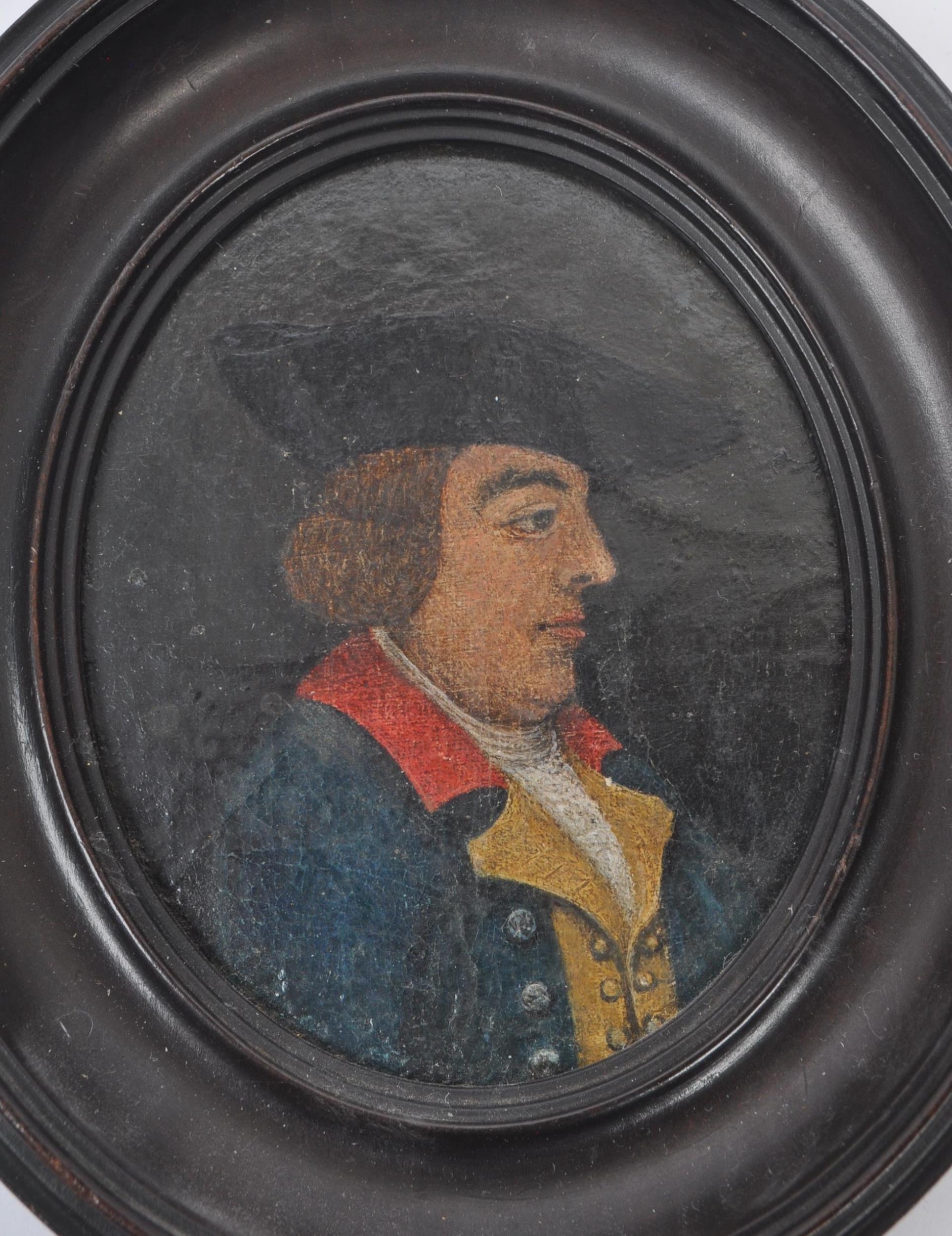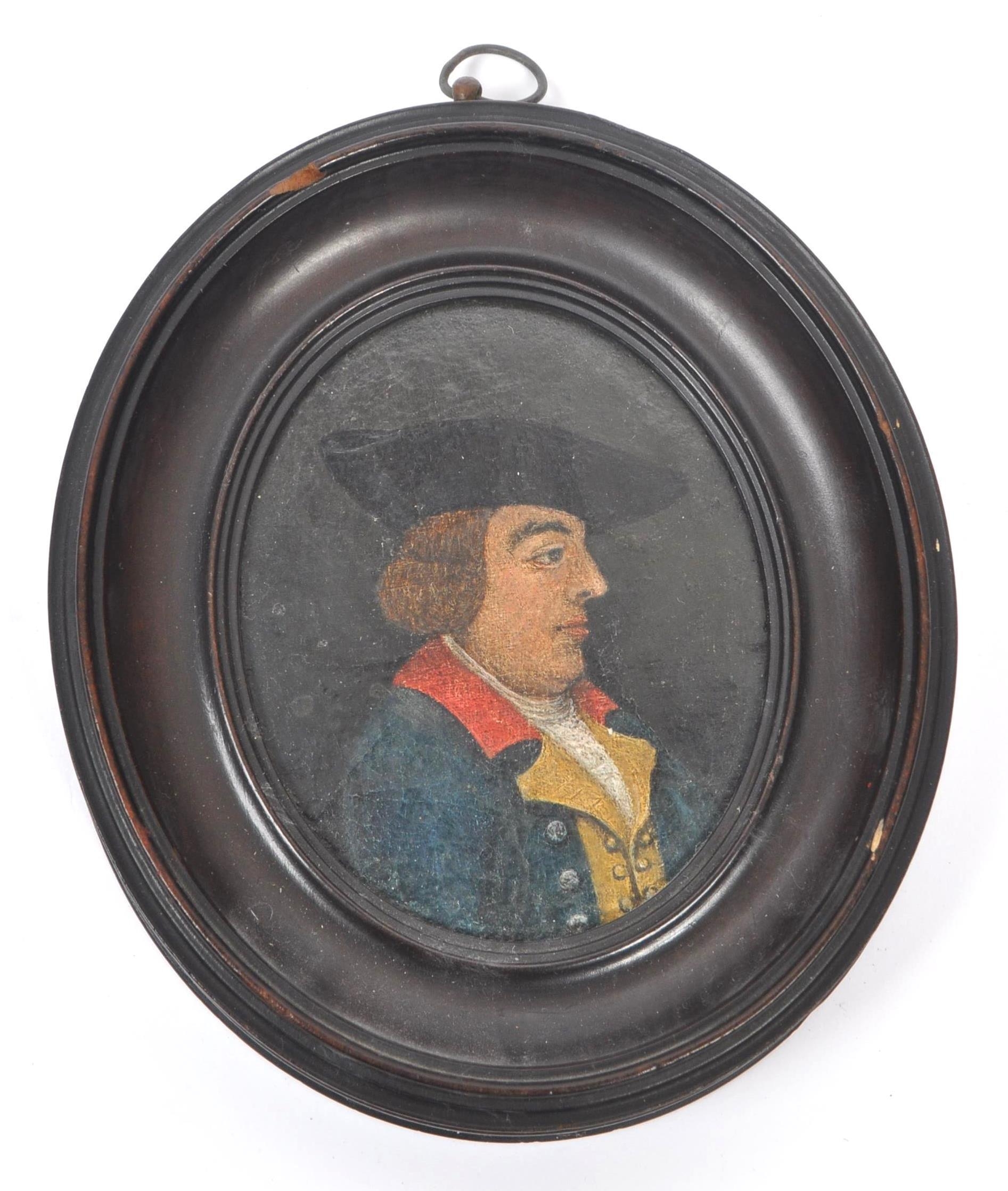 A 19th century miniature portrait painting. The painting in oval mahogany frame, depicting a man in tricorn hat and blue coat. With hanging ring to top. Measures approx. 15cm x 12cm.