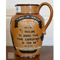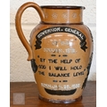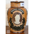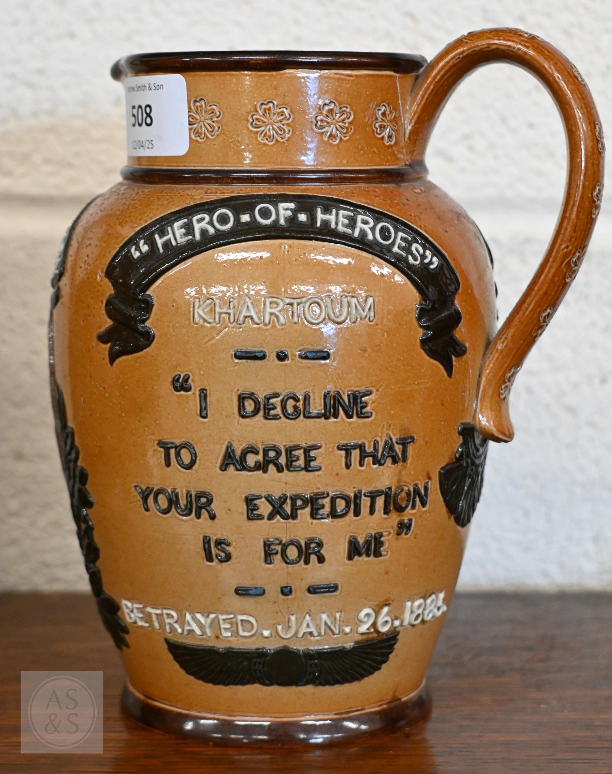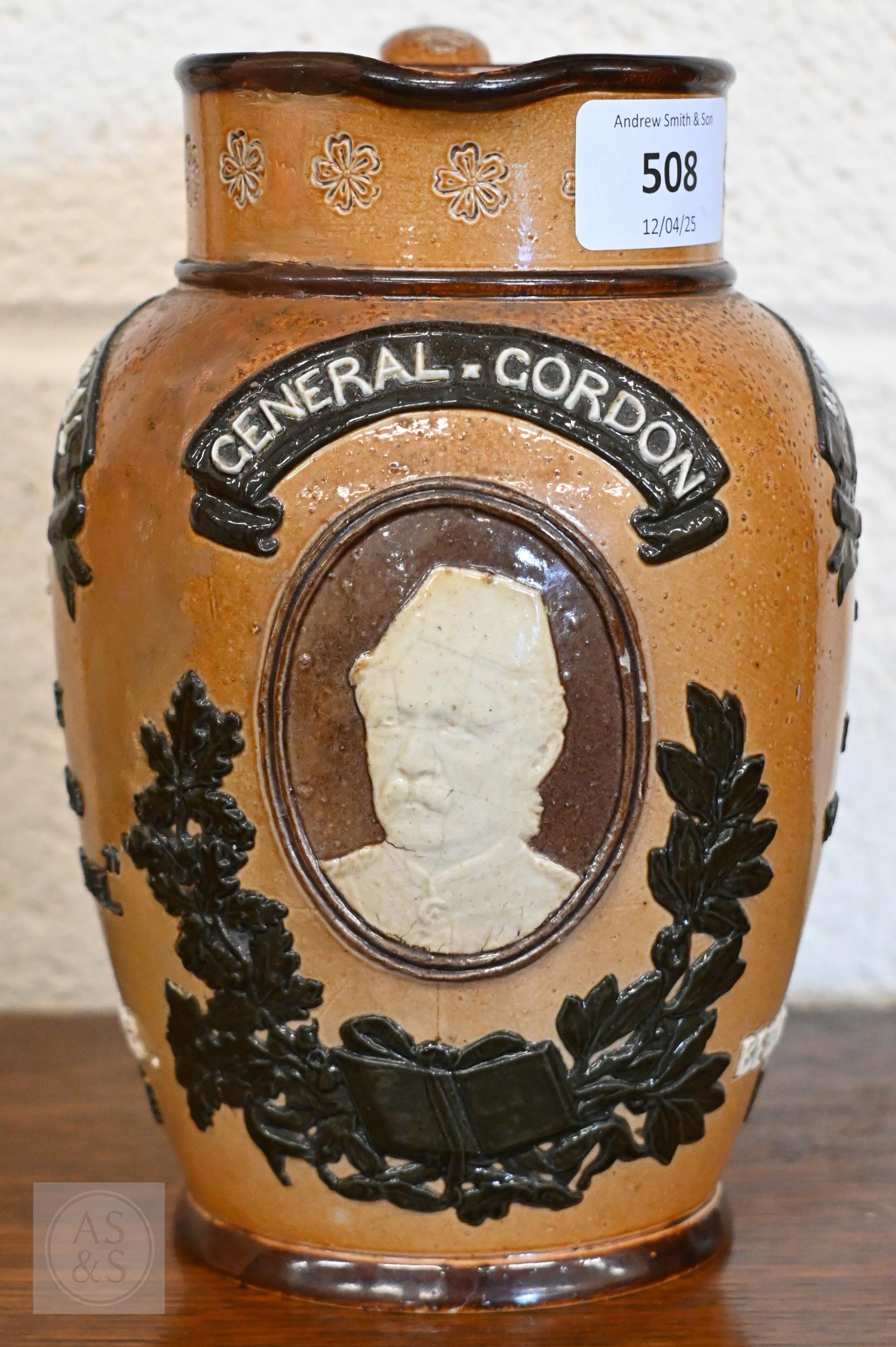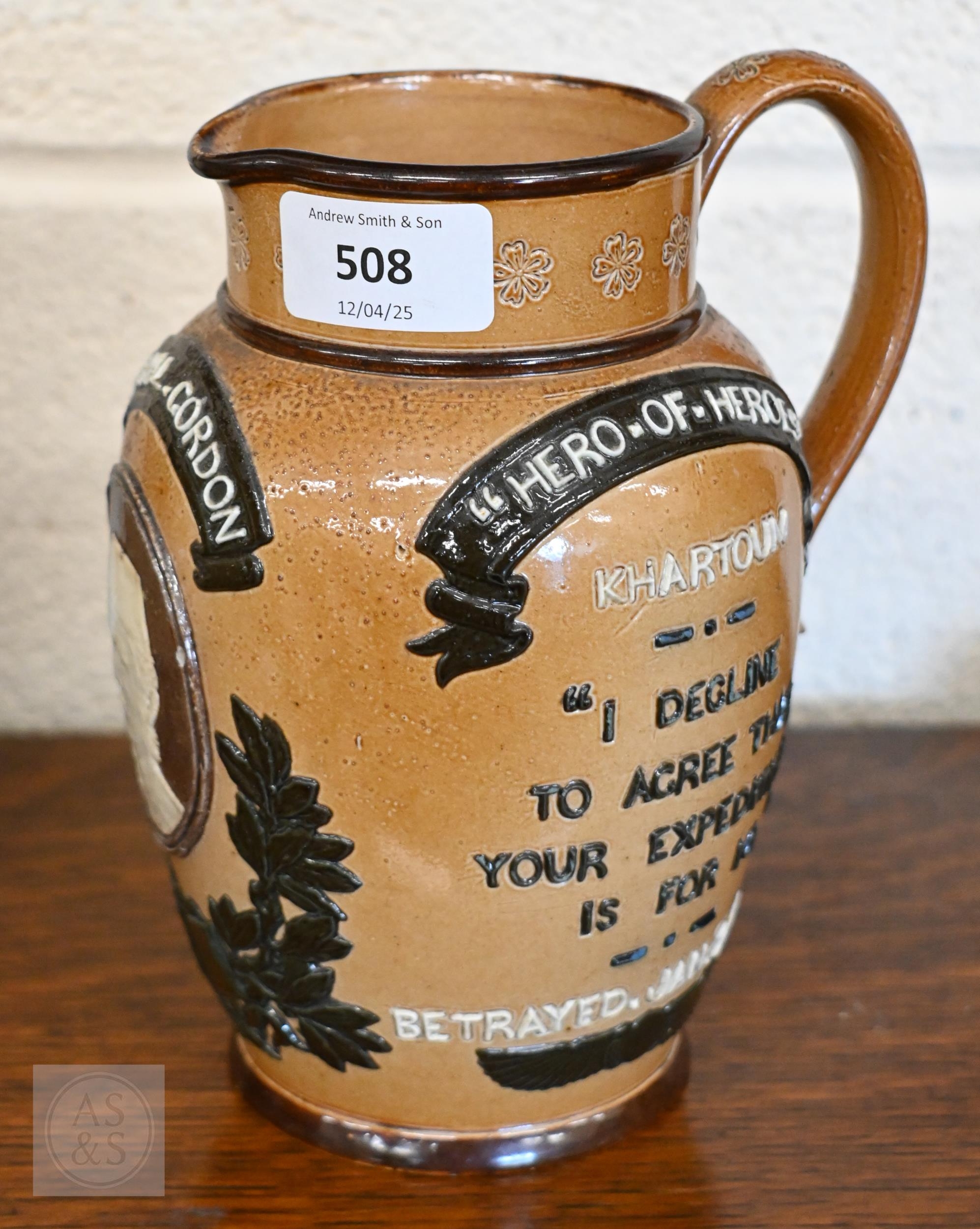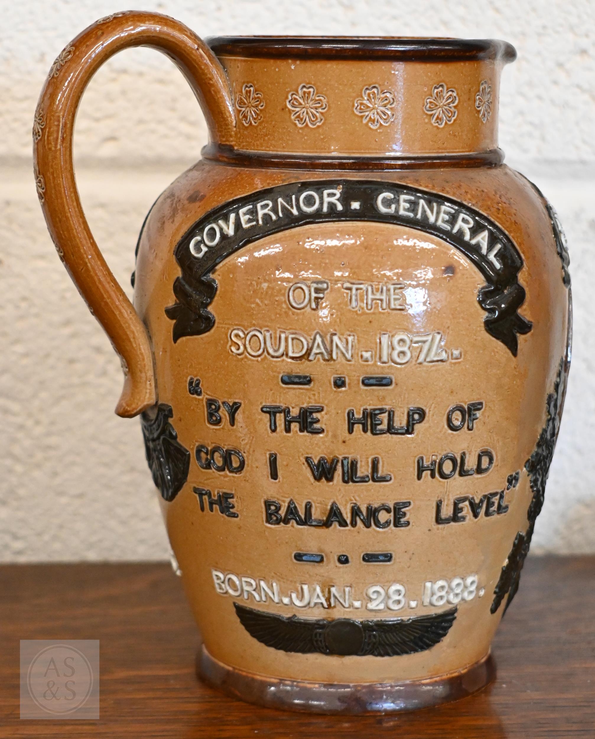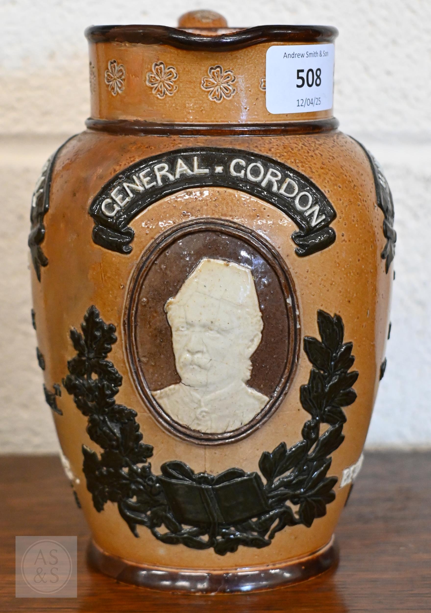 A Victorian Doulton Lambeth stoneware jug, commemorating the Death of General Gordon of Khartoum 'Betrayed Jan 26 1885', 19 cm high