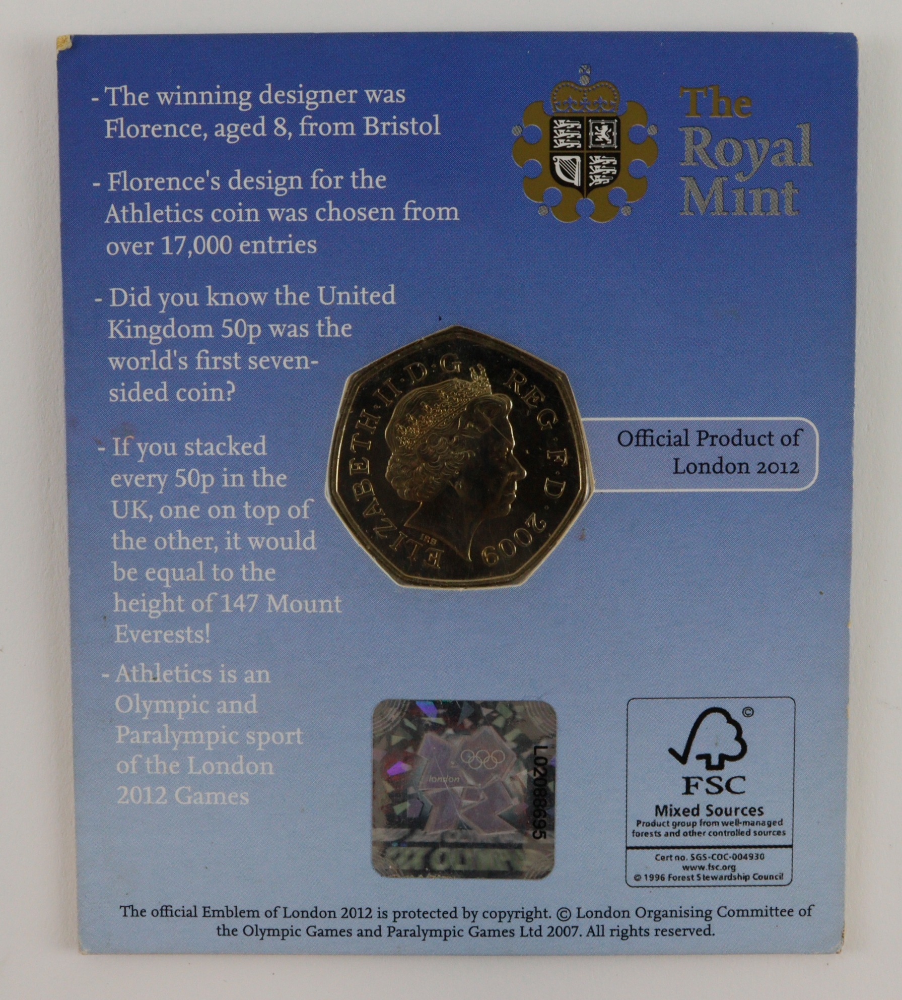 Fifty Pence 2009 Blue Peter London Olympic Games Winner's Edition, BU in packaging.
