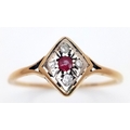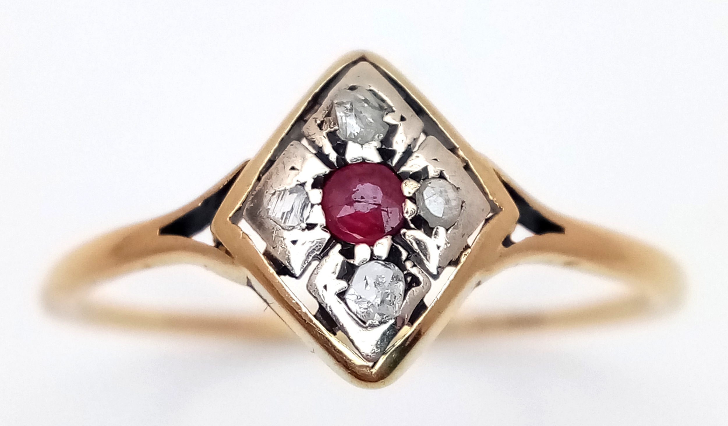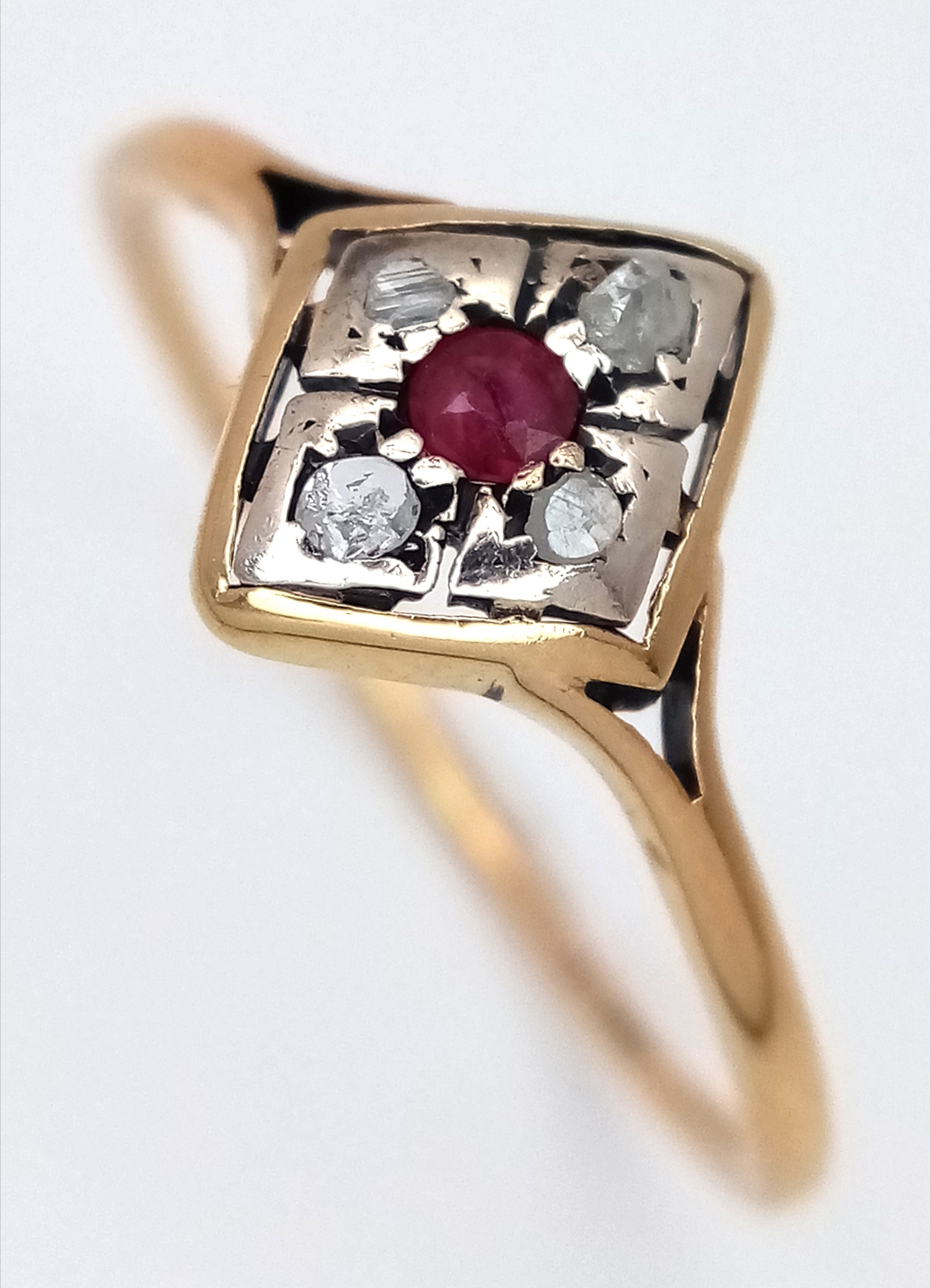 AN 18K YELLOW GOLD VINTAGE DIAMOND AND RUBY RING. TOTAL WEIGHT 1.7G. SIZE T. SC 9048
