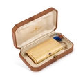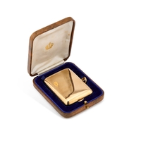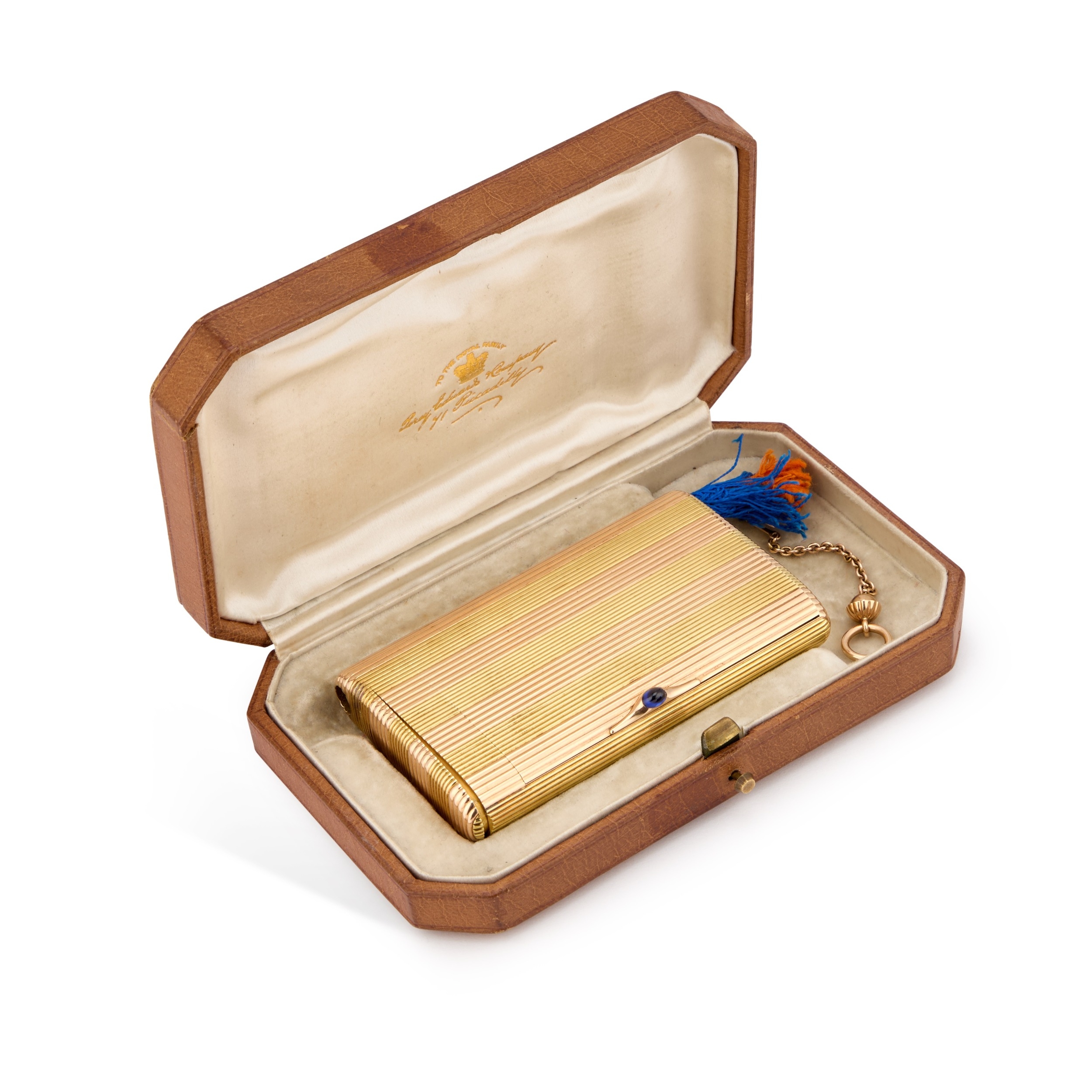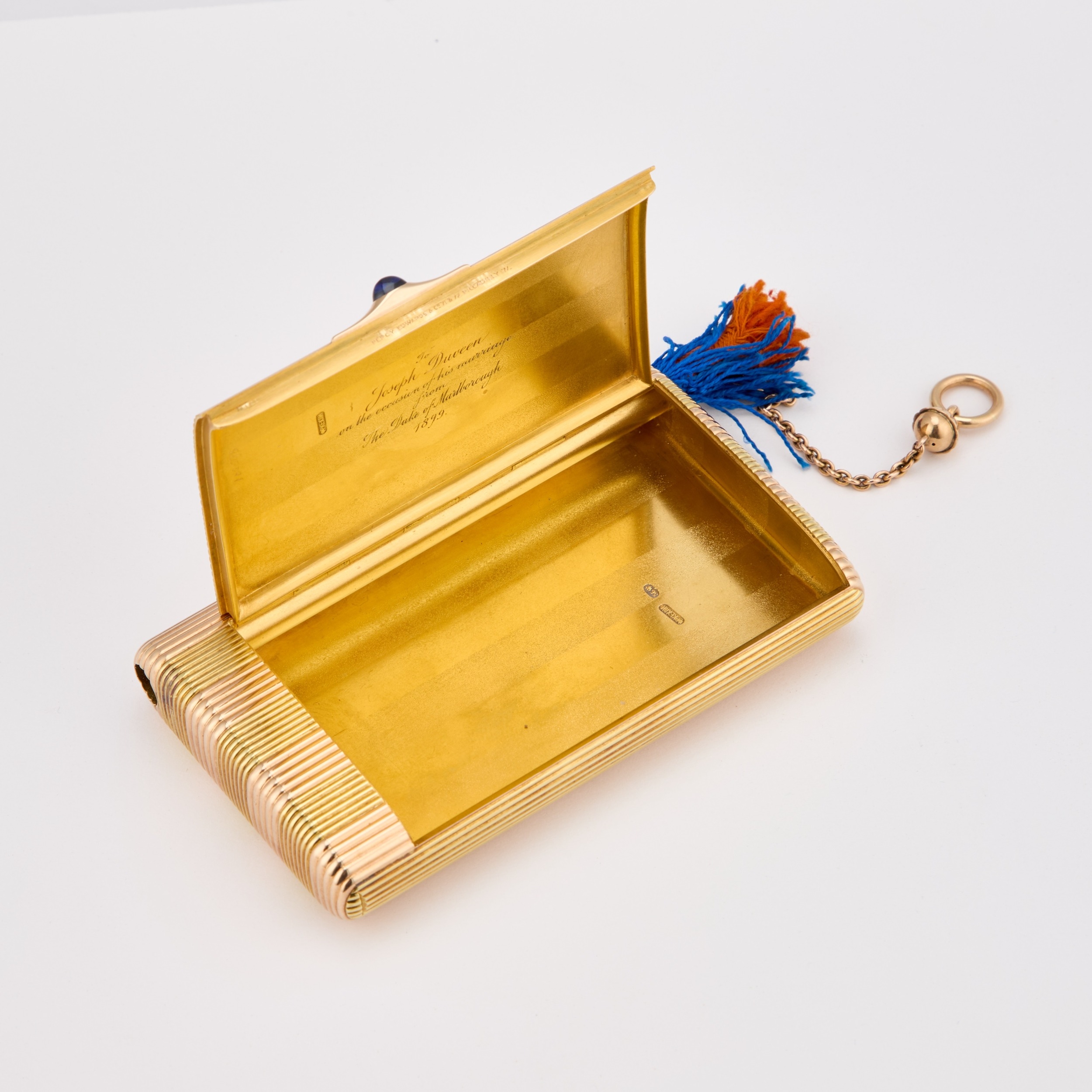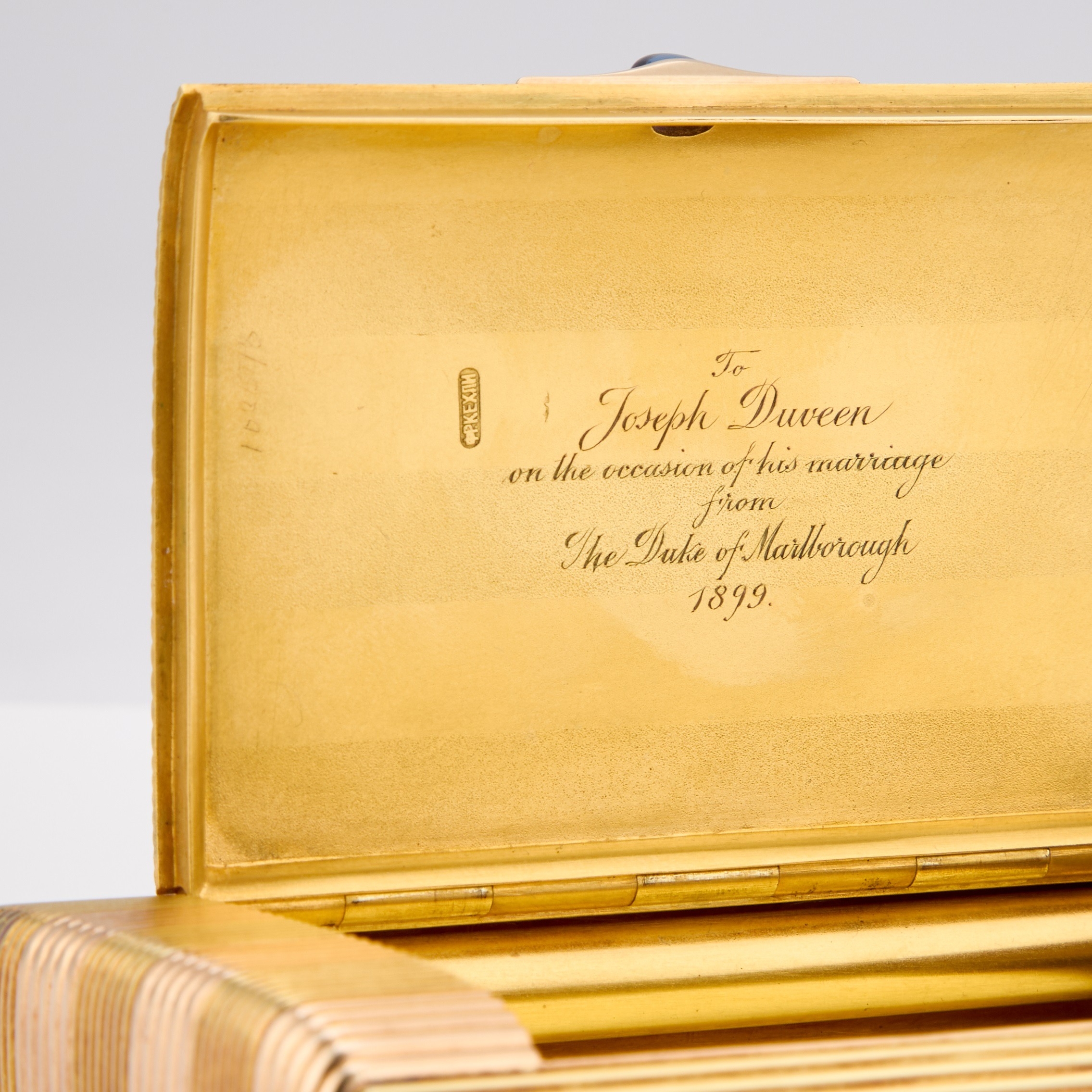 of rectangular oval-section with a hinged vesta to one end, the exterior reeded, the cover with an oval cabochon set thumbpiece, the underside of the cover inscribed To Joseph Duveen on the occasion of his marriage from The Duke of Marlborough 1899, St. Petersburg, combined city and 56 standard mark, in the original Percy Edwards retailer's box. 9.7cm long, 5.7cm wide, 161 grams gross