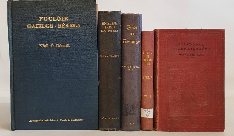 Studies in Modern Irish (Ó Nolan, Gearóid) HB. 1st Edit. 1919. Foclóir Gaeilge-Béarla (Niall Ó Dónaill) Hardback. 1st Edit. 1977. English - Irish Dictionary (Tomás de Bhaldraithe) Hardback. 1st Edit. 1959. Filidheacht Fiannaigheachta (Torna) Hardback (No date) Gnás na Gaedhilge (Cormac Ó Cadhlaigh) HB 1st Edit. 1940.