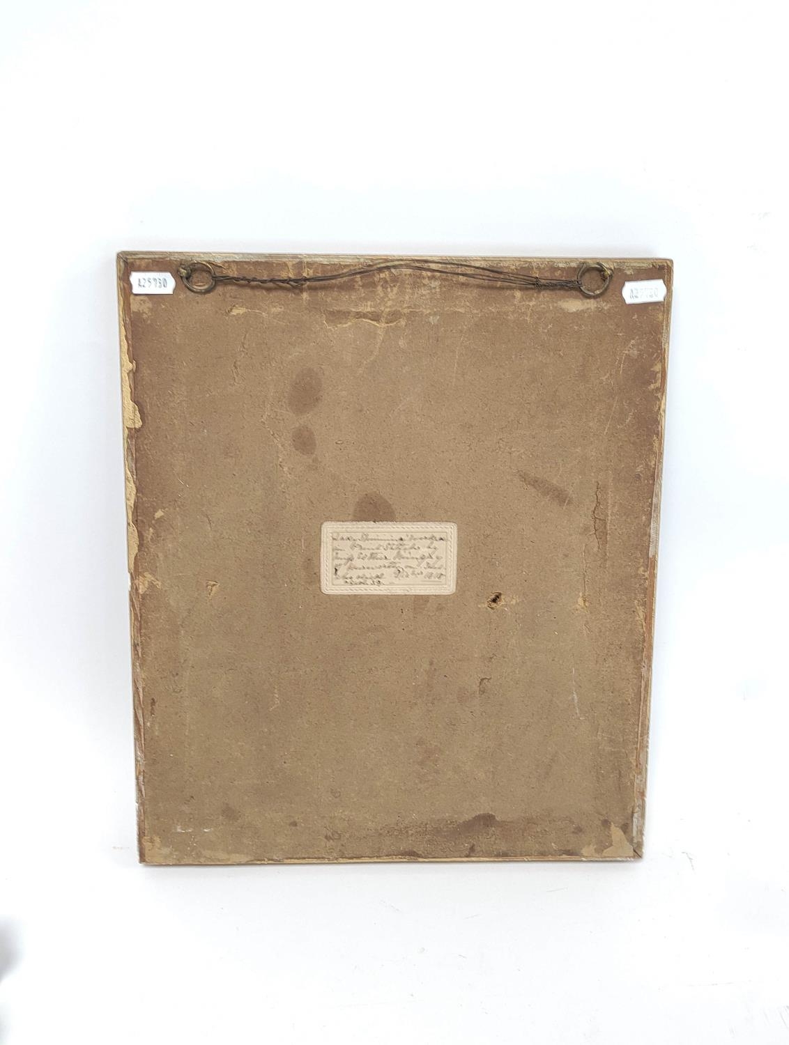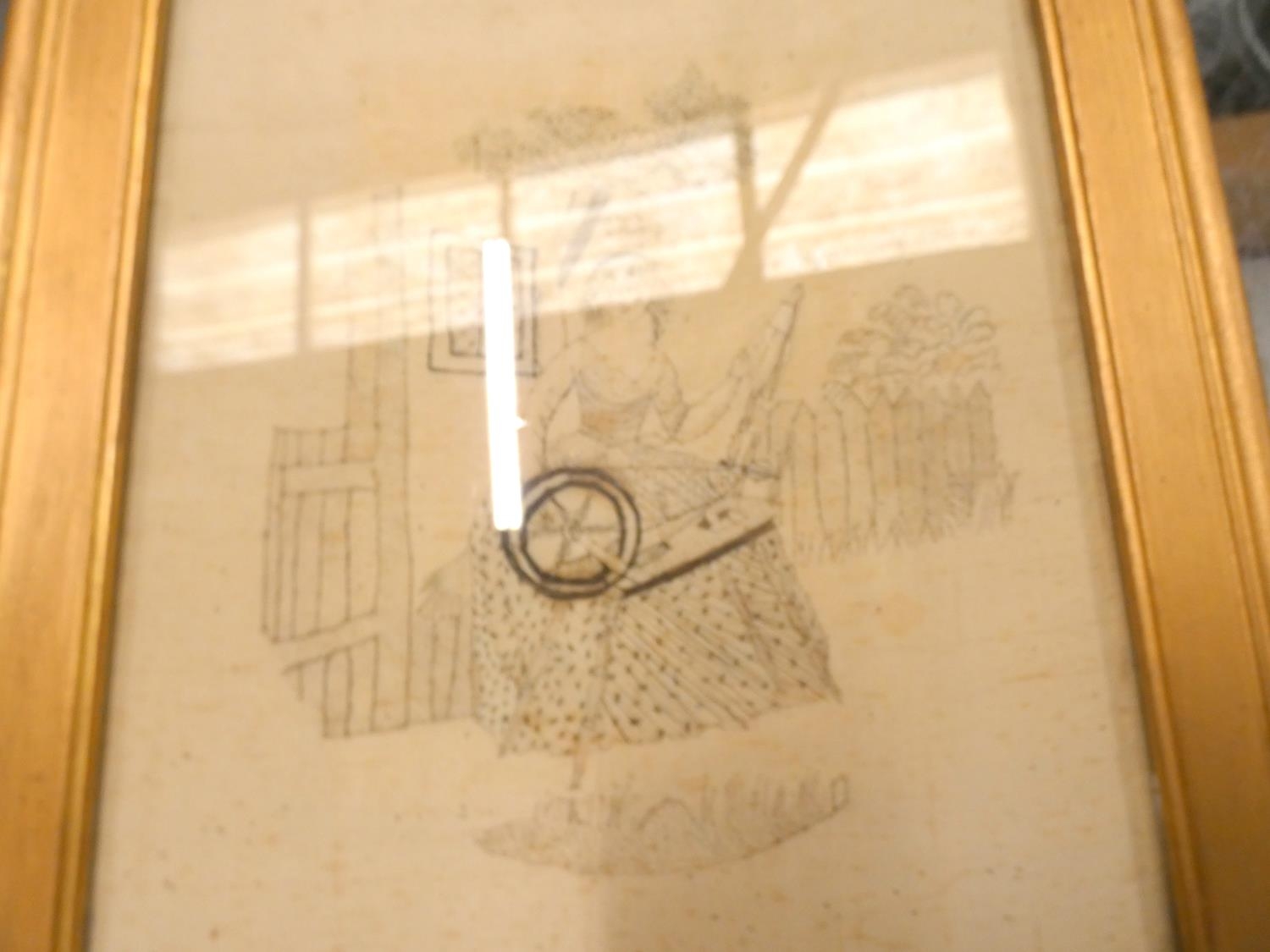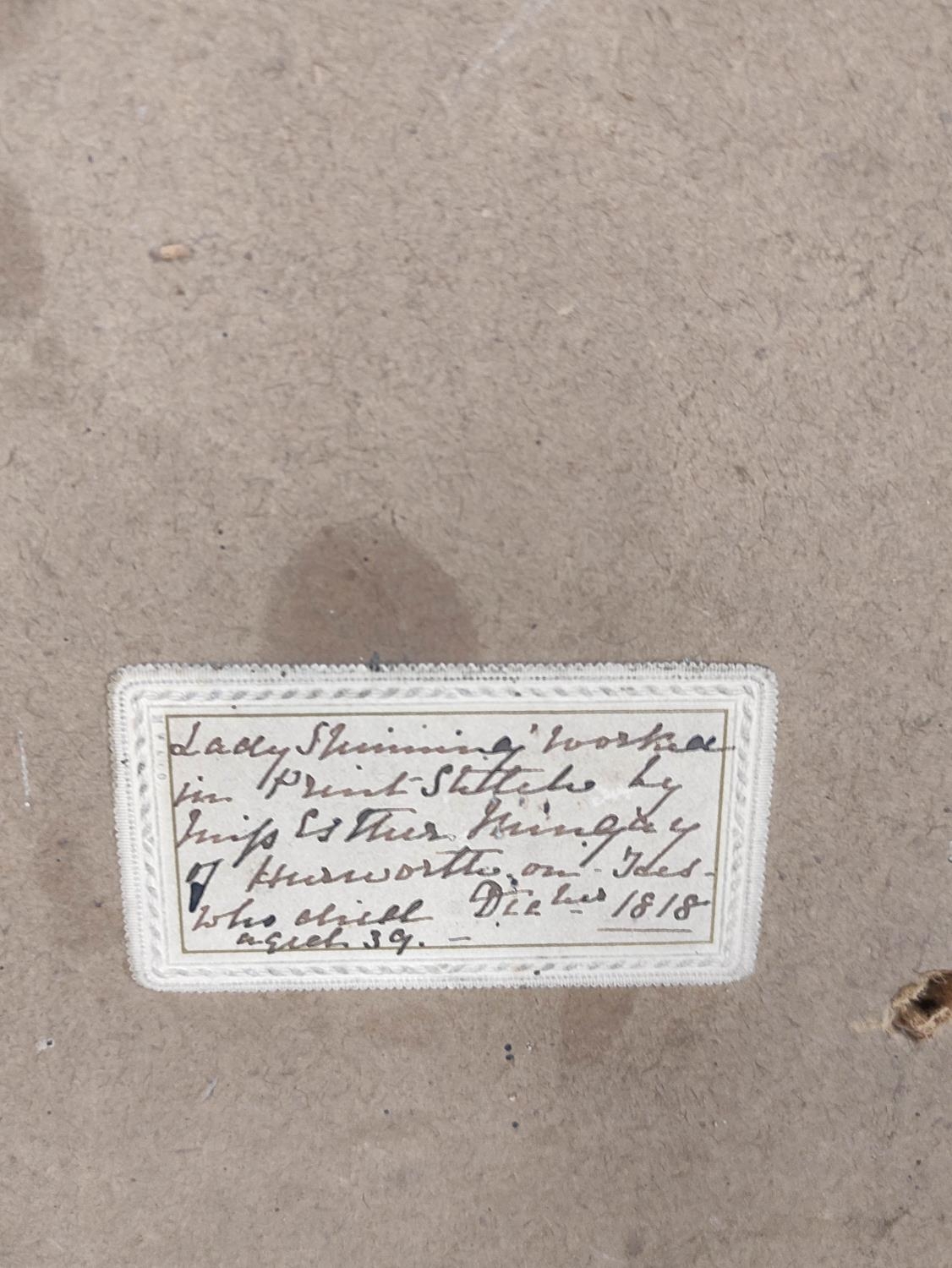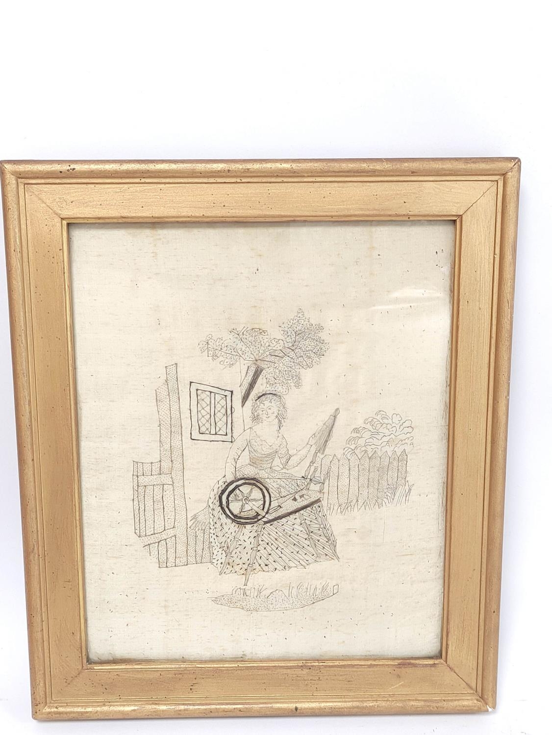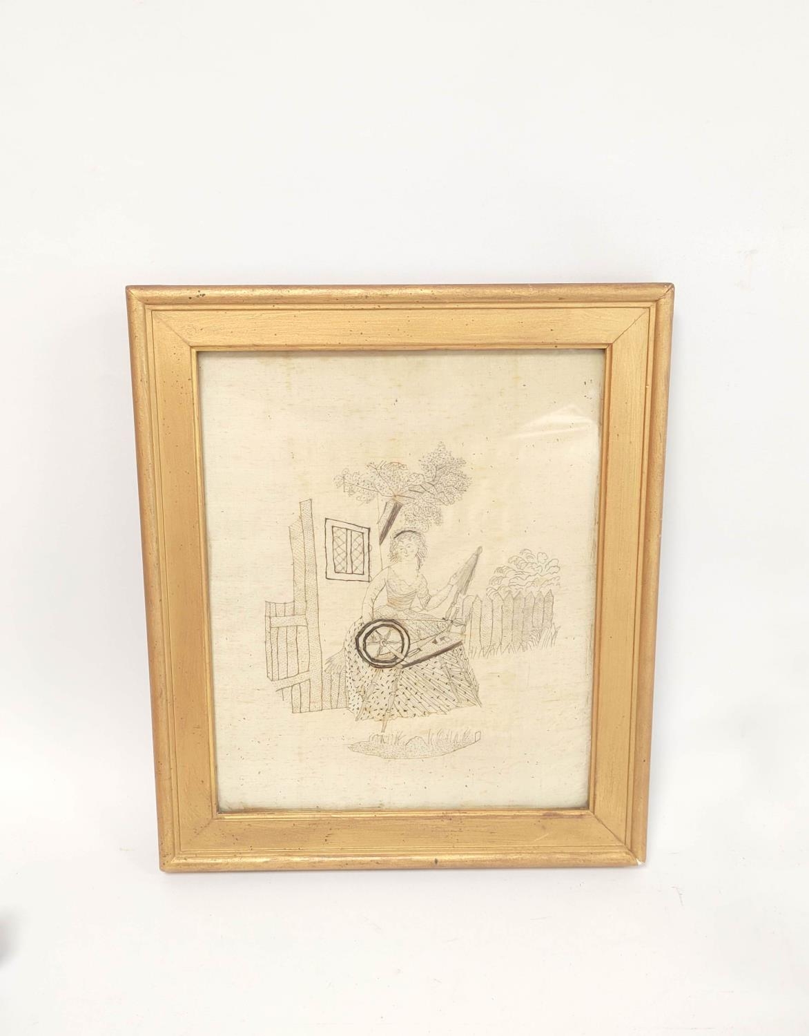 Regency silk work embroidery depicting a lady spinning and worked in print stitches, by Esther Pringle, December 1818, 30cm x 24.5cm, framed and glazed, to verso label with provenance.