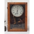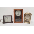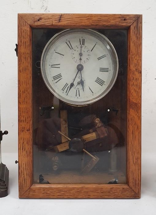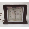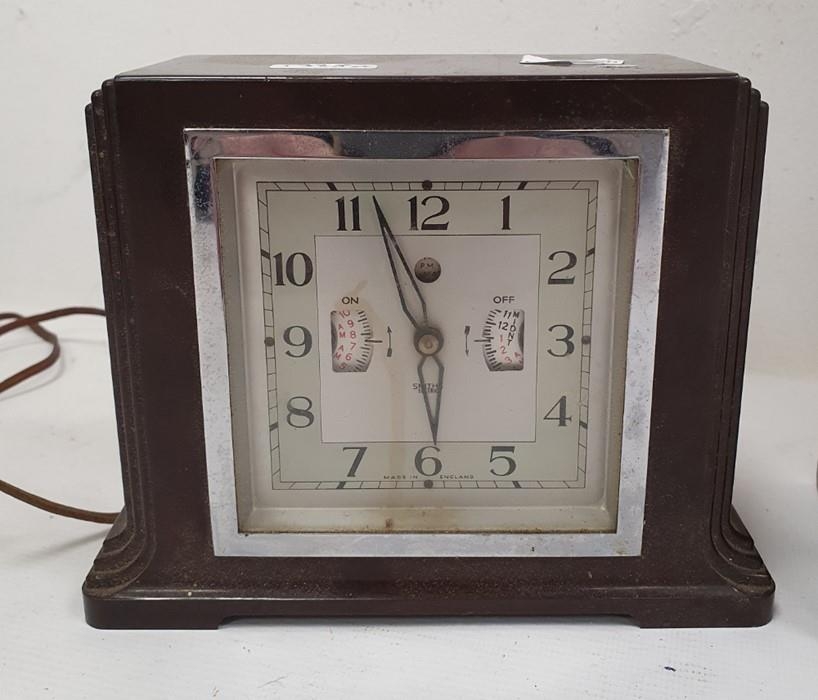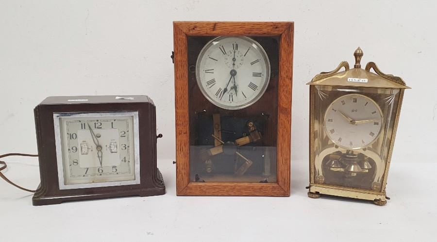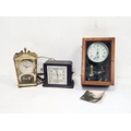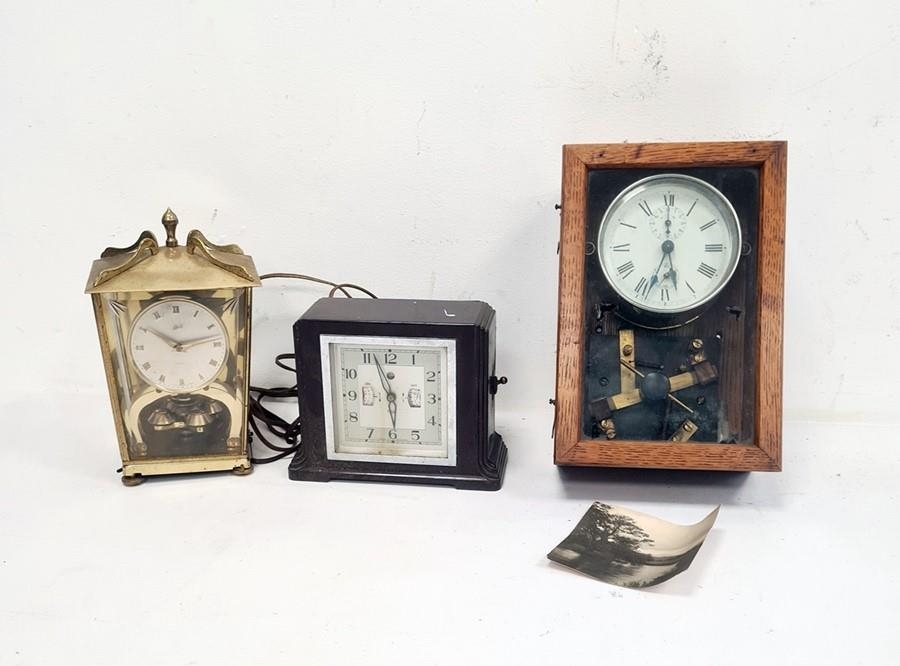 Early 20th century alarm clock in chrome case, modified and mounted in glazed wooden case to activate mechanical electrical switch, early Smiths Metro bakelite cased alarm clock and another clock (3)