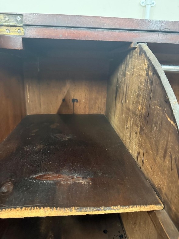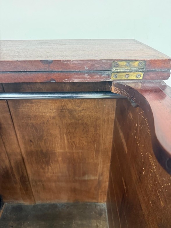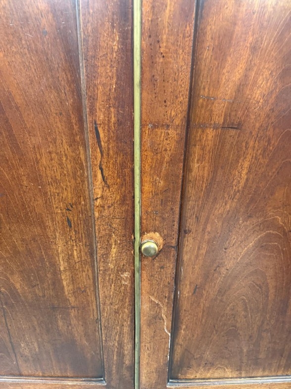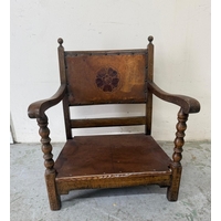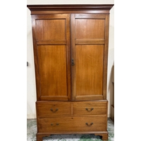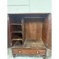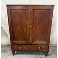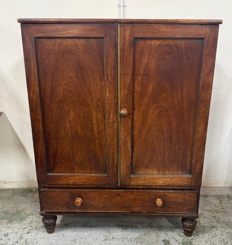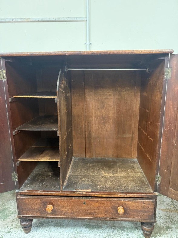 An oak gentleman's wardrobe with two doors opening to cross hanging rails and shelves over a single long drawer on turned legs H133cm W104cm D91cm
