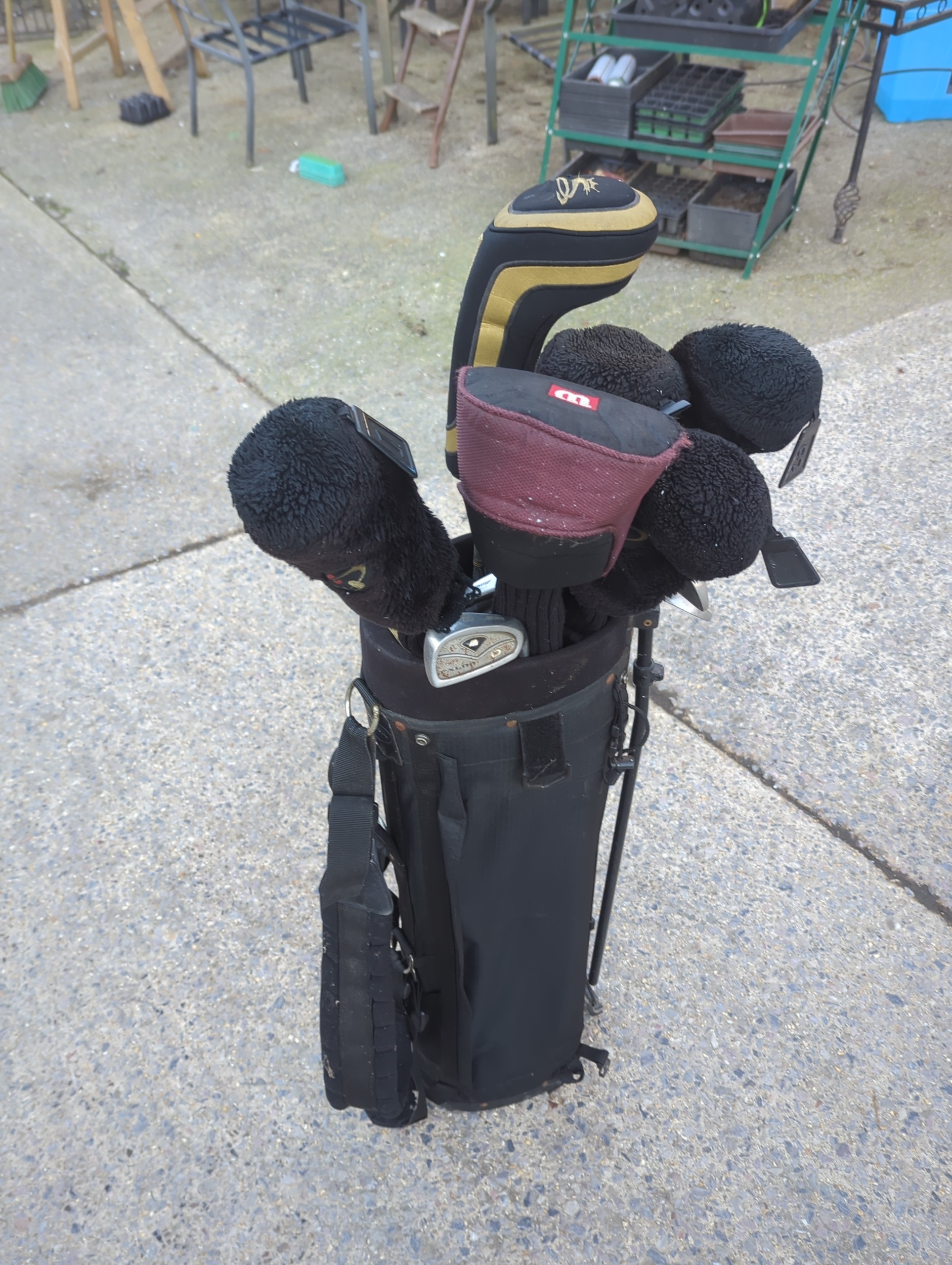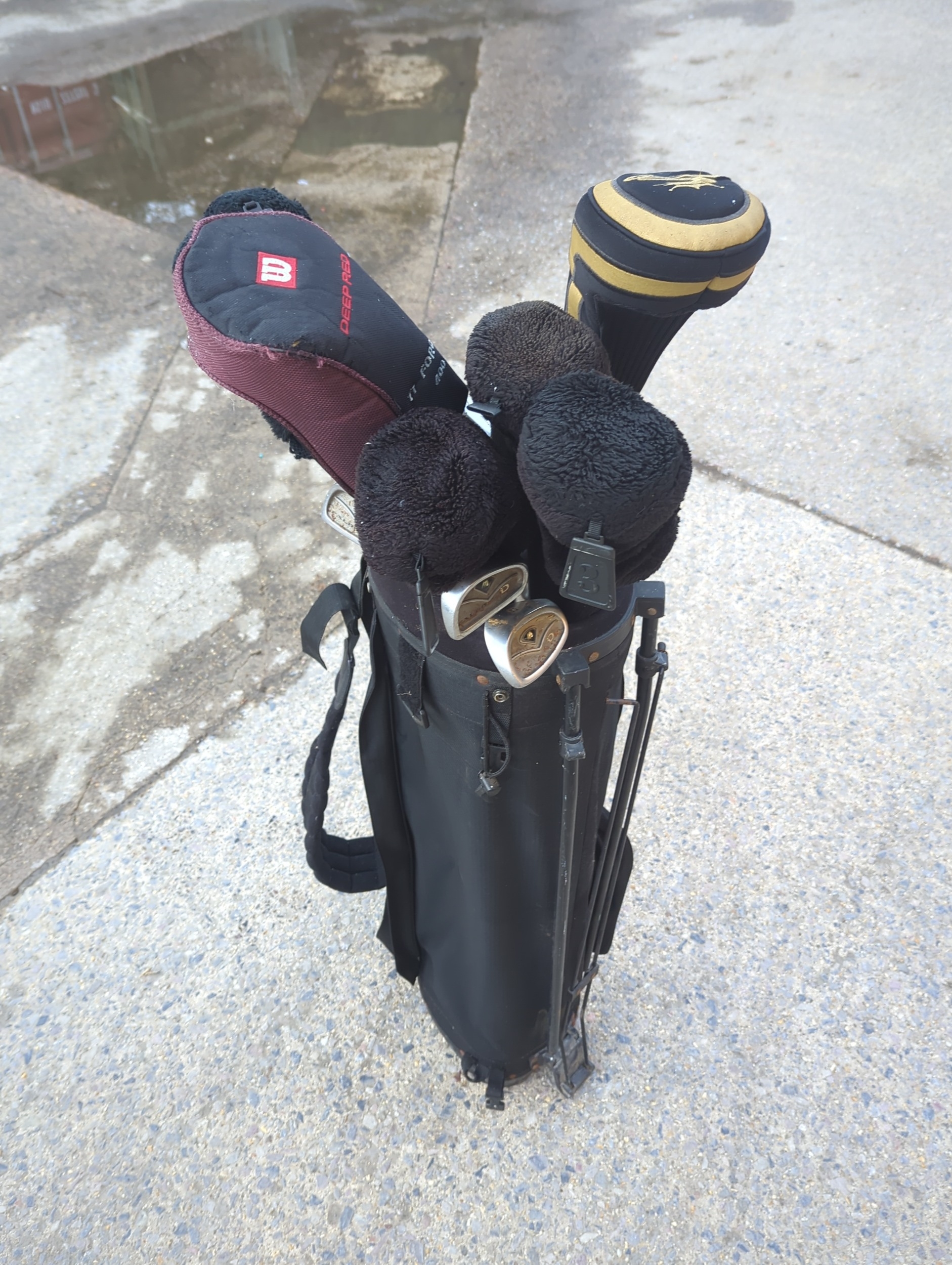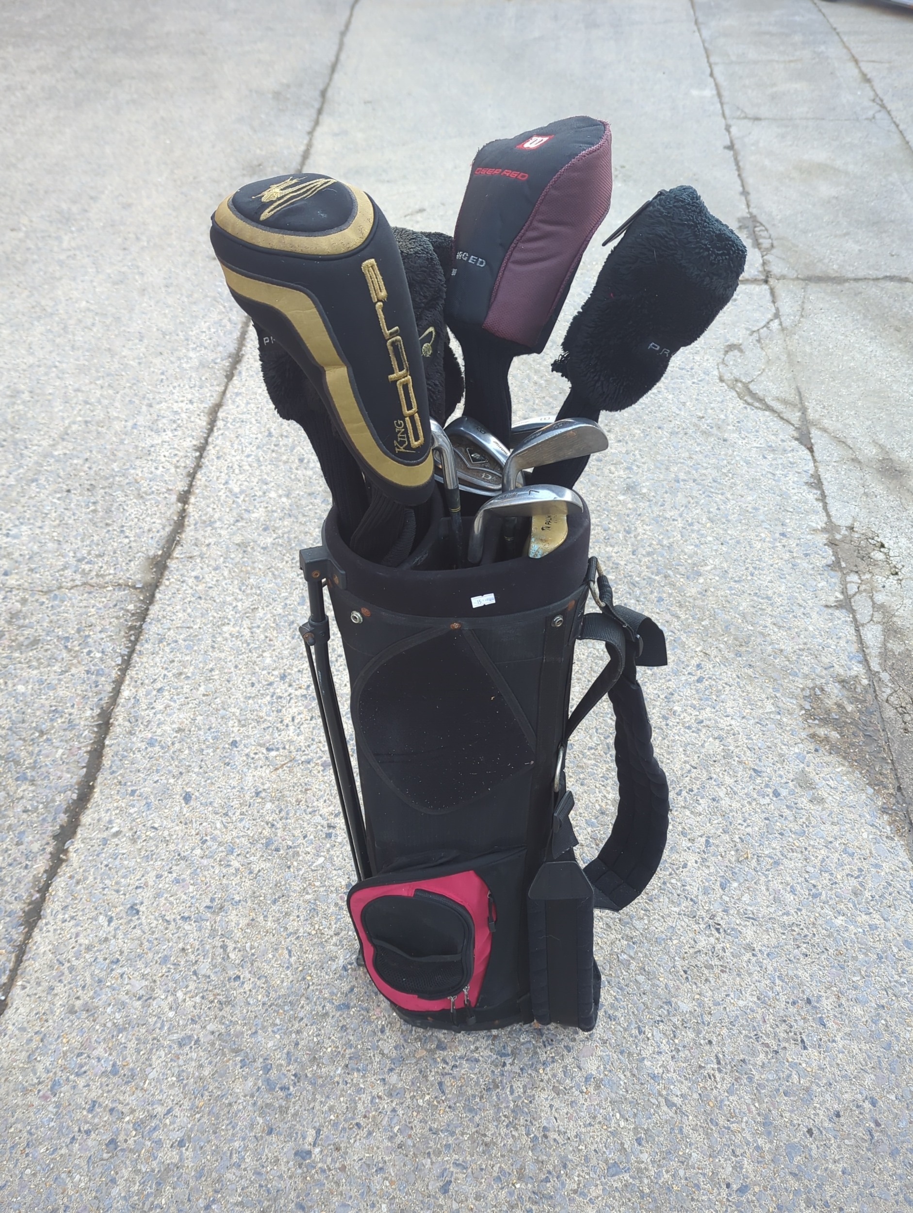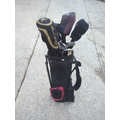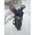 This bundle includes a selection of golf clubs featuring a Cobra golf club head cover and a Mizuno 7 iron. The set is stored in a practical black golf bag, which provides ease of transport and organization on the course. Ideal for golf enthusiasts looking to expand their club collection with quality brands.