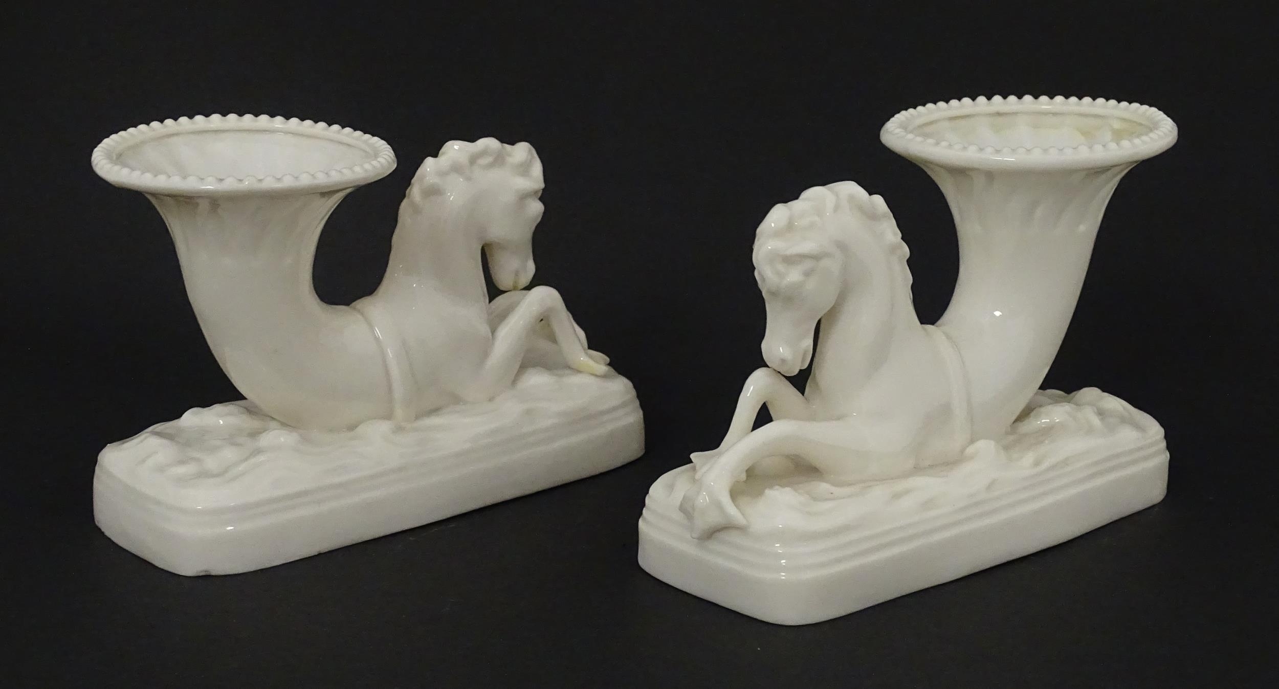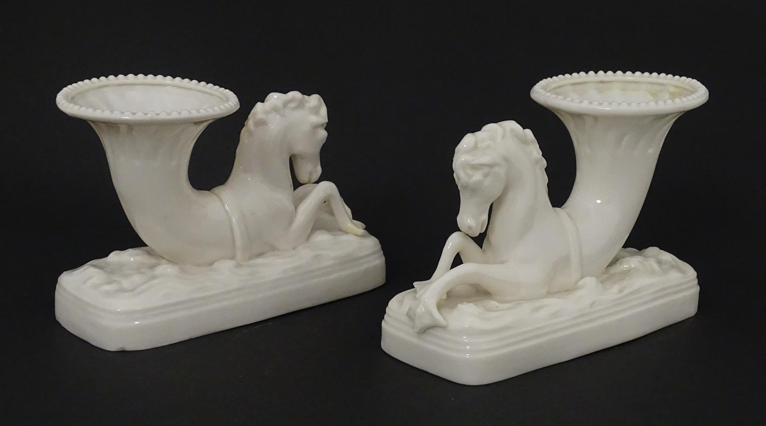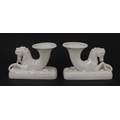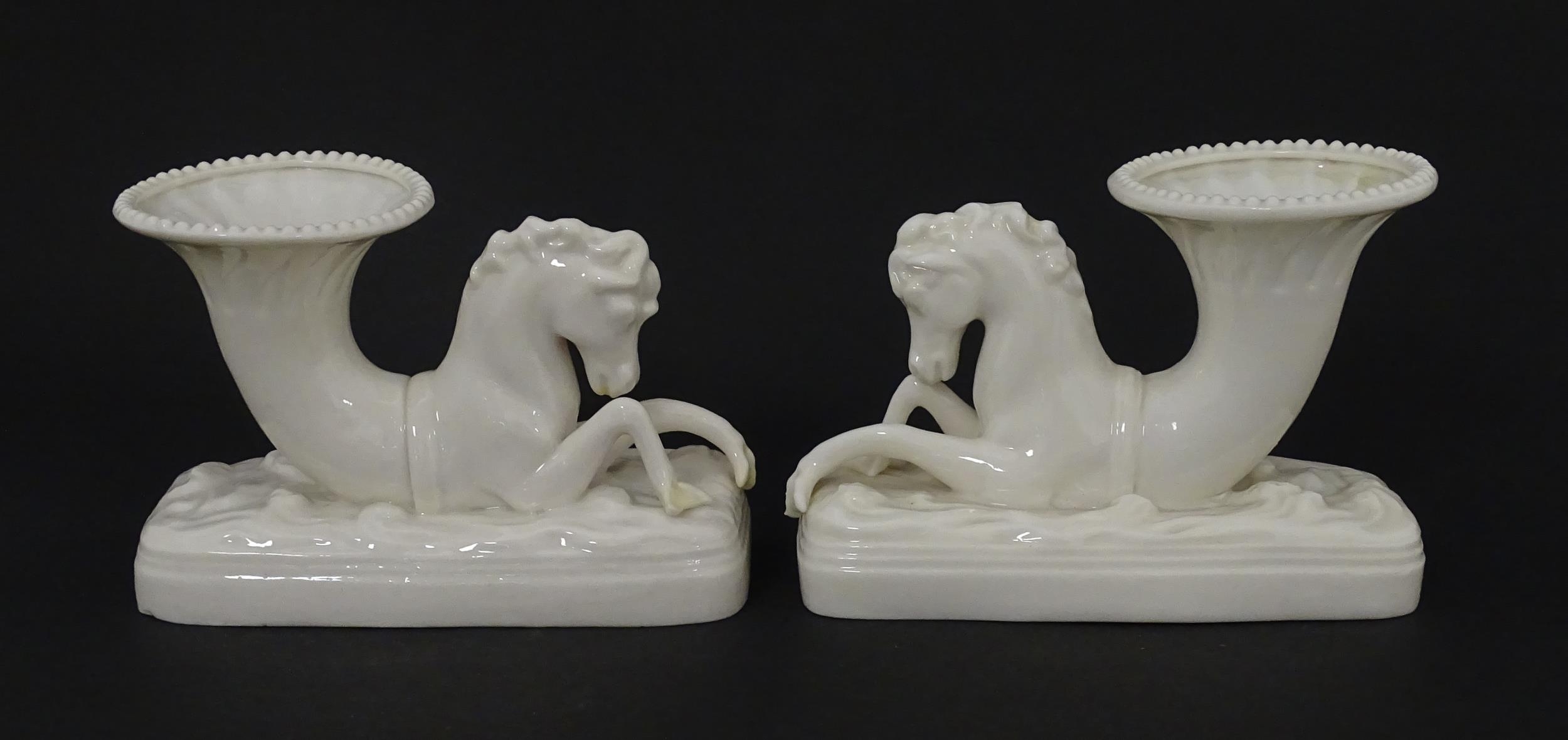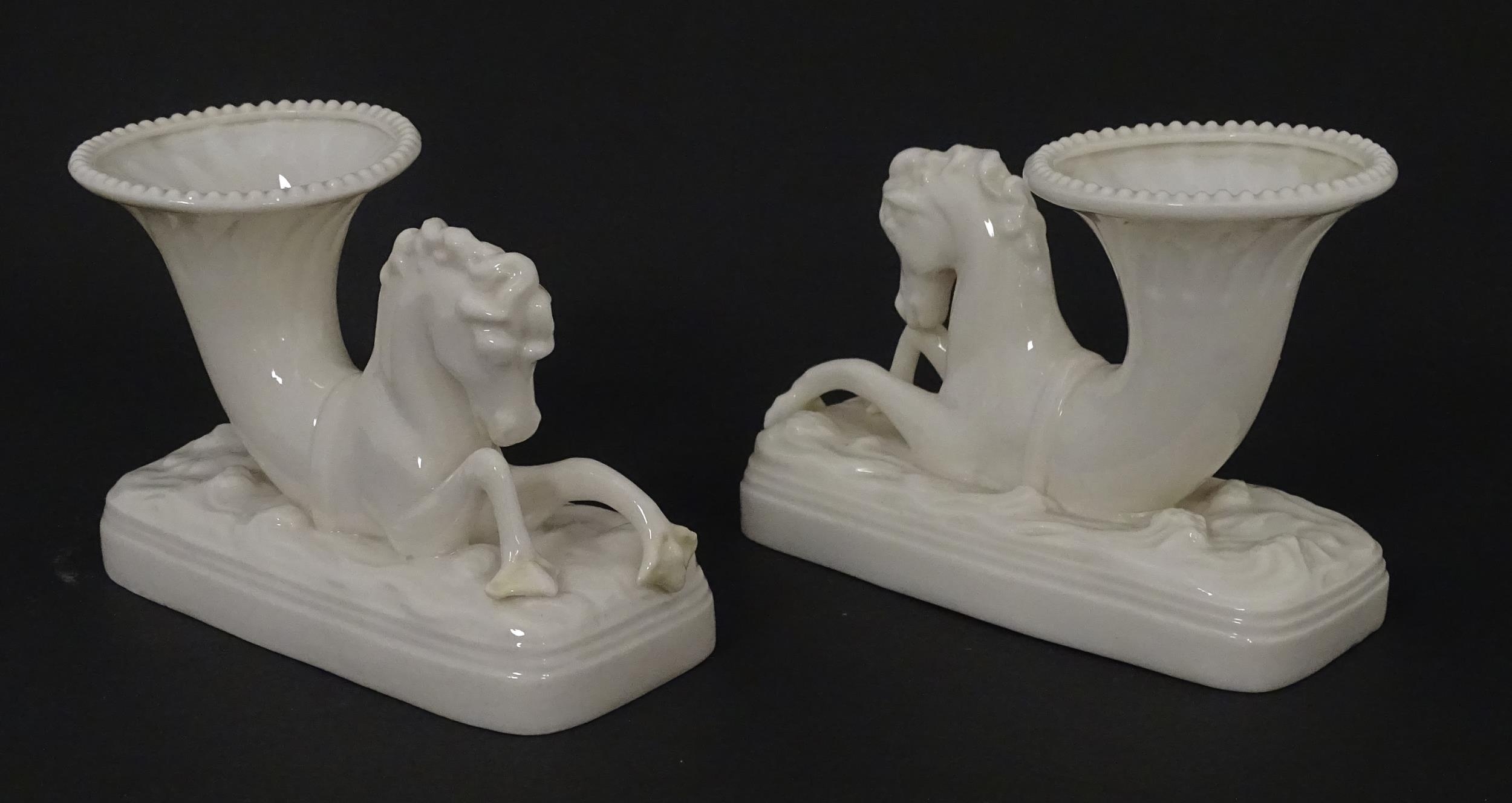 A matched pair of Belleek Seahorse flower holders / vases. One with impressed First Period mark, the other with Second Period mark. Approx. 3 1/4" high (2)