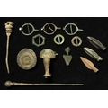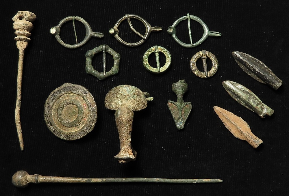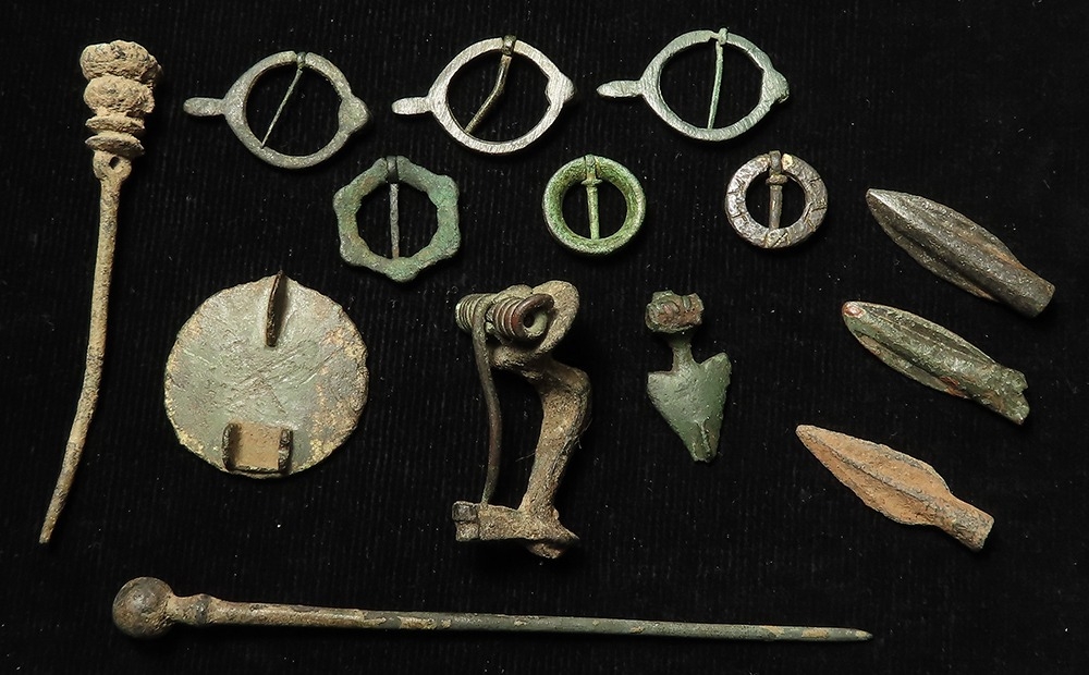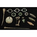 Artefacts / Detector-finds (14) bronze: 3x Greek arrowheads; a Roman disc brooch, fly brooch, knee brooch (with pin), 2x long pins, and 6x Medieval disc brooches.