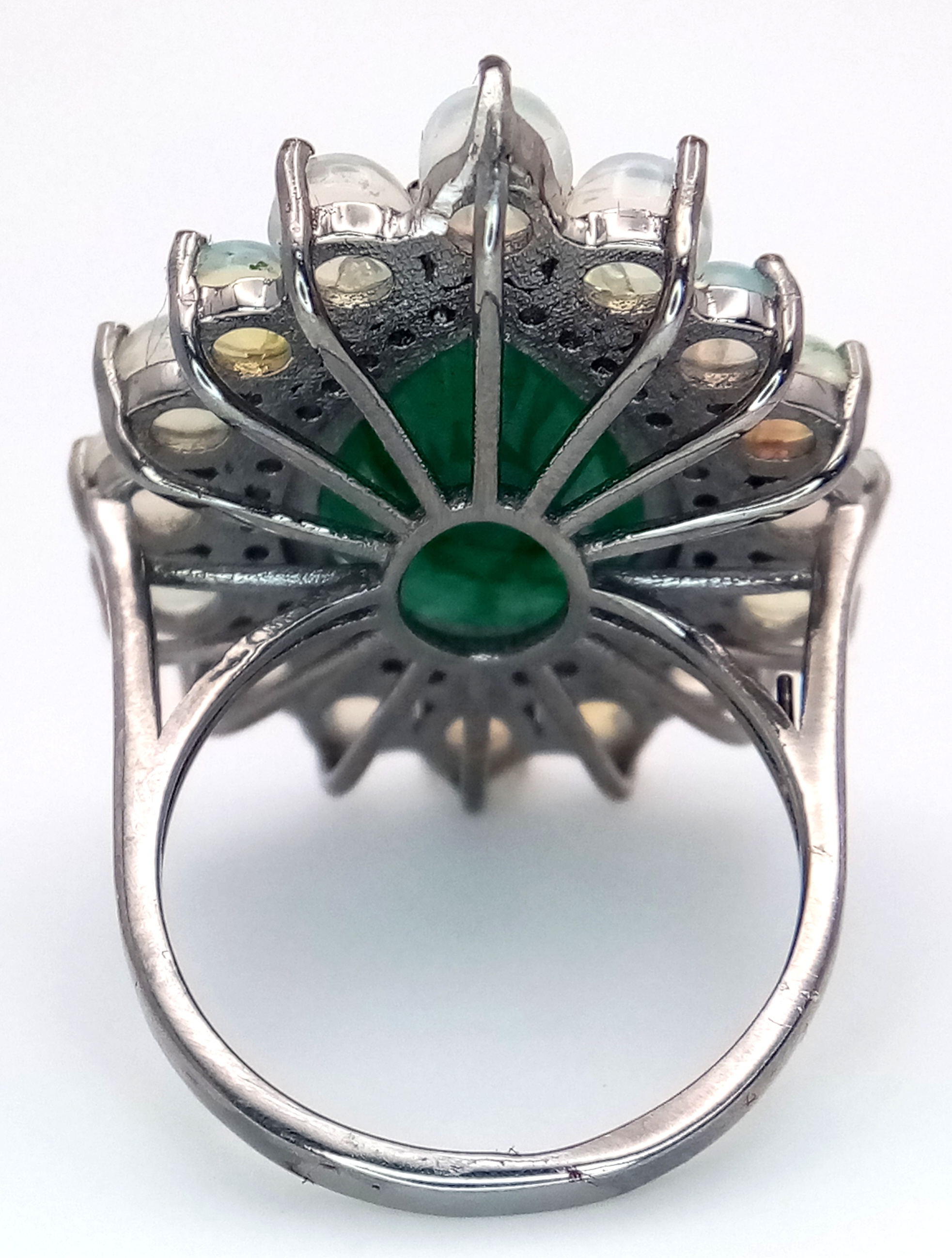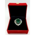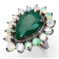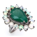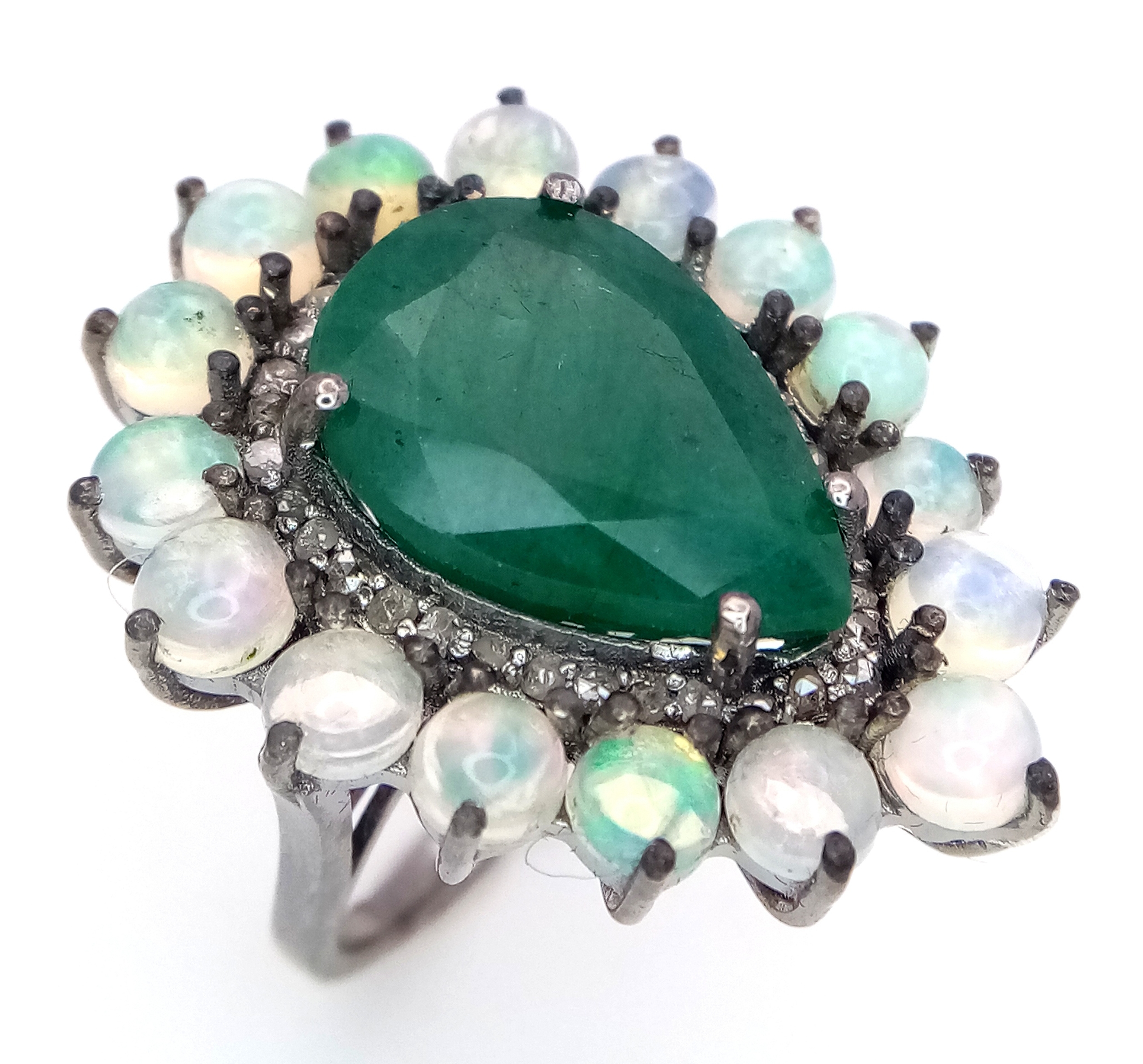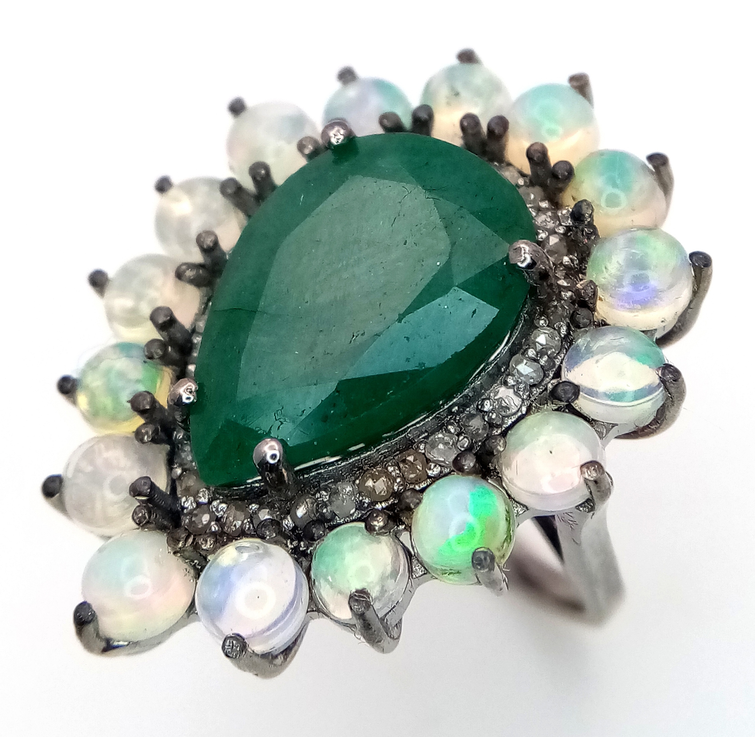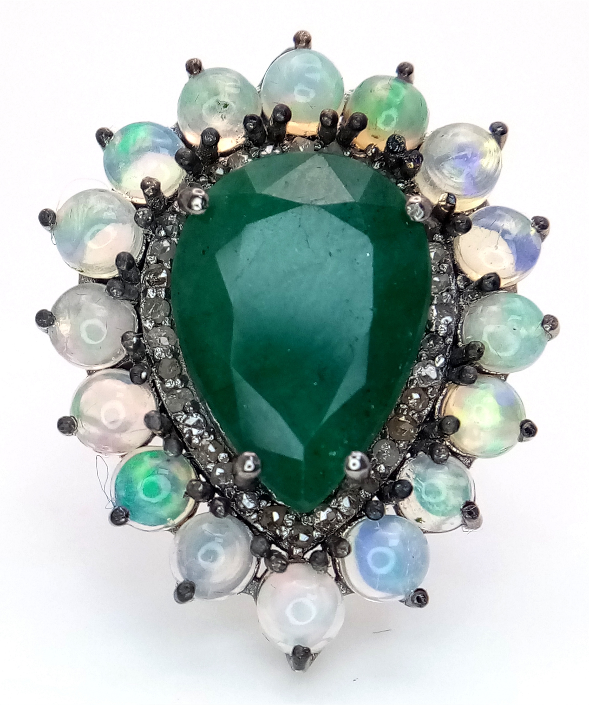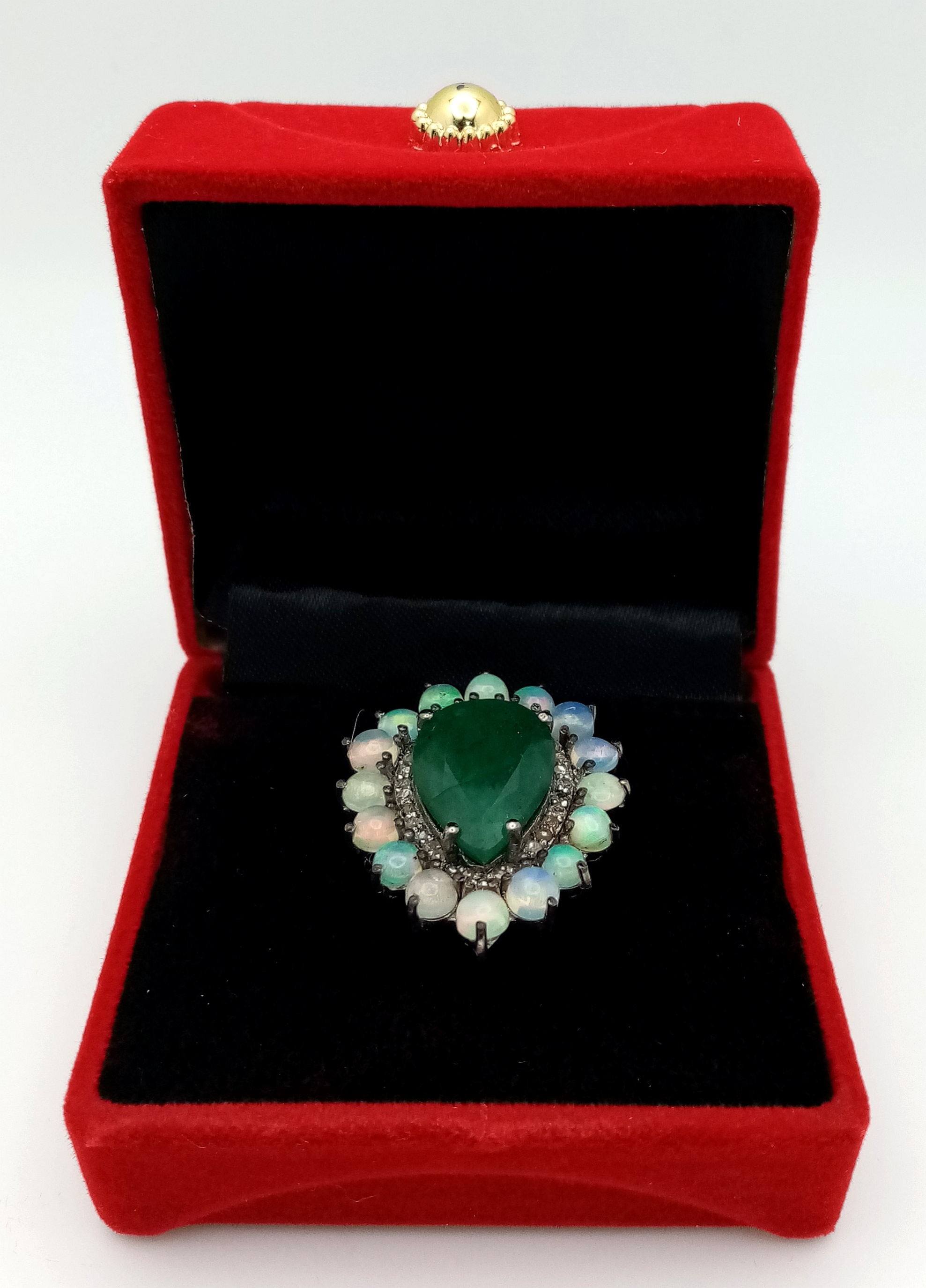 A 6Ct Pear Cut Emerald Ring with a 0.20ctw Diamond and 2ctw of Opal surround. Size O. With case. Cd-1763