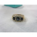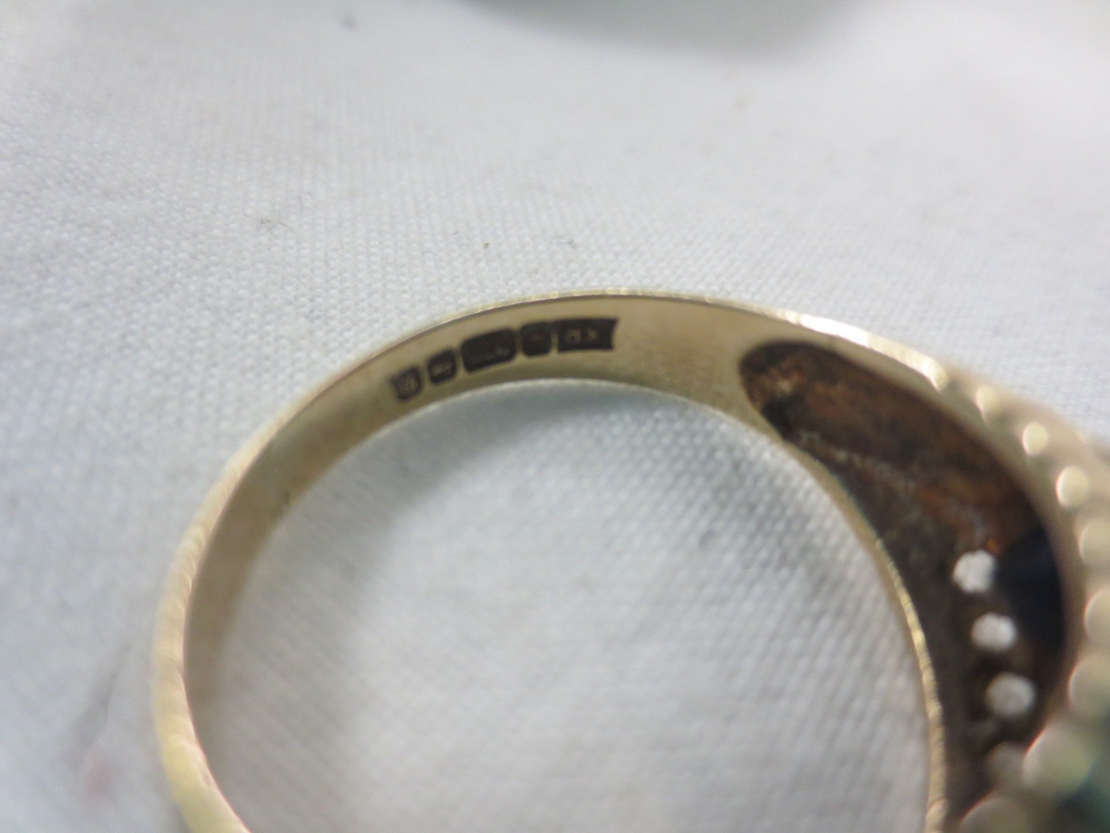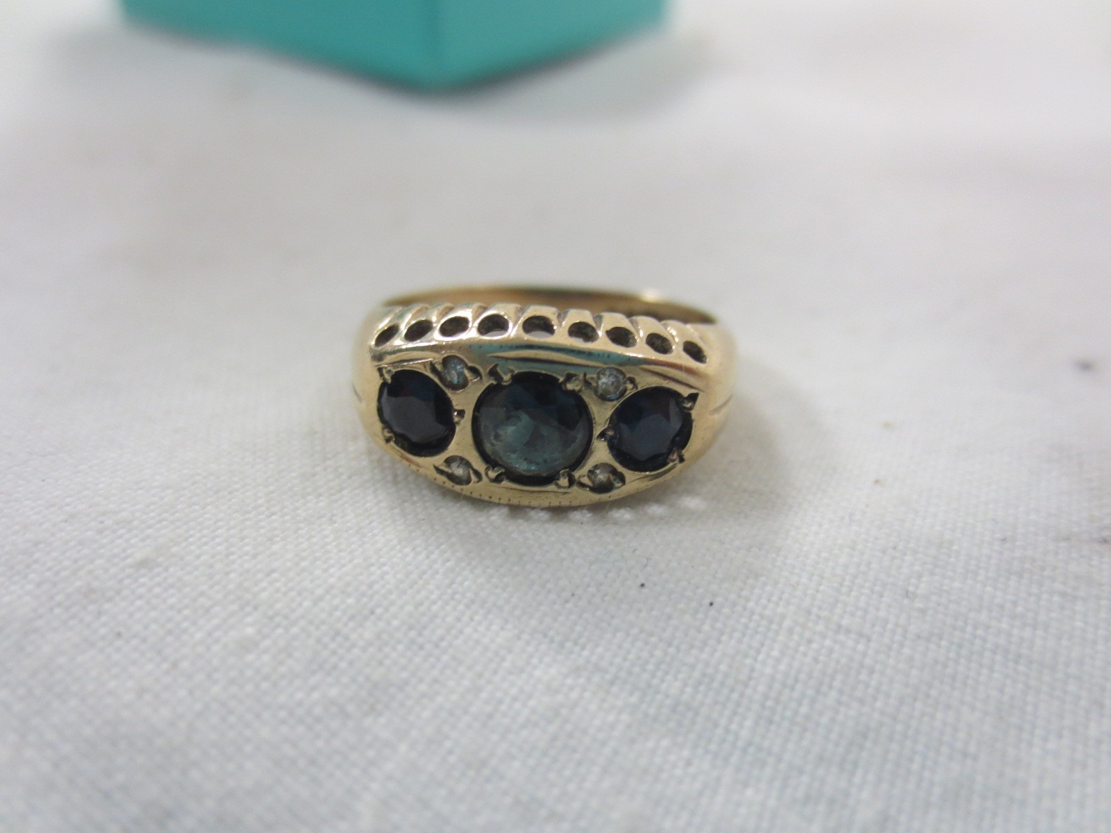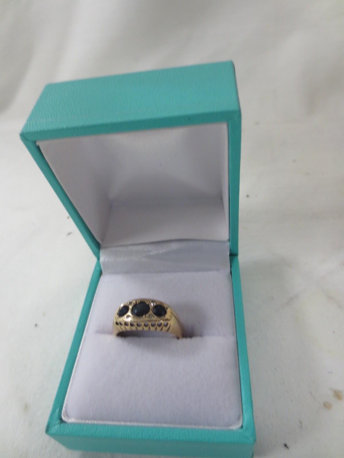 A 9 carat gold ring set with red stones, likely garnets, approx weight 2.2g, ring size K