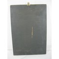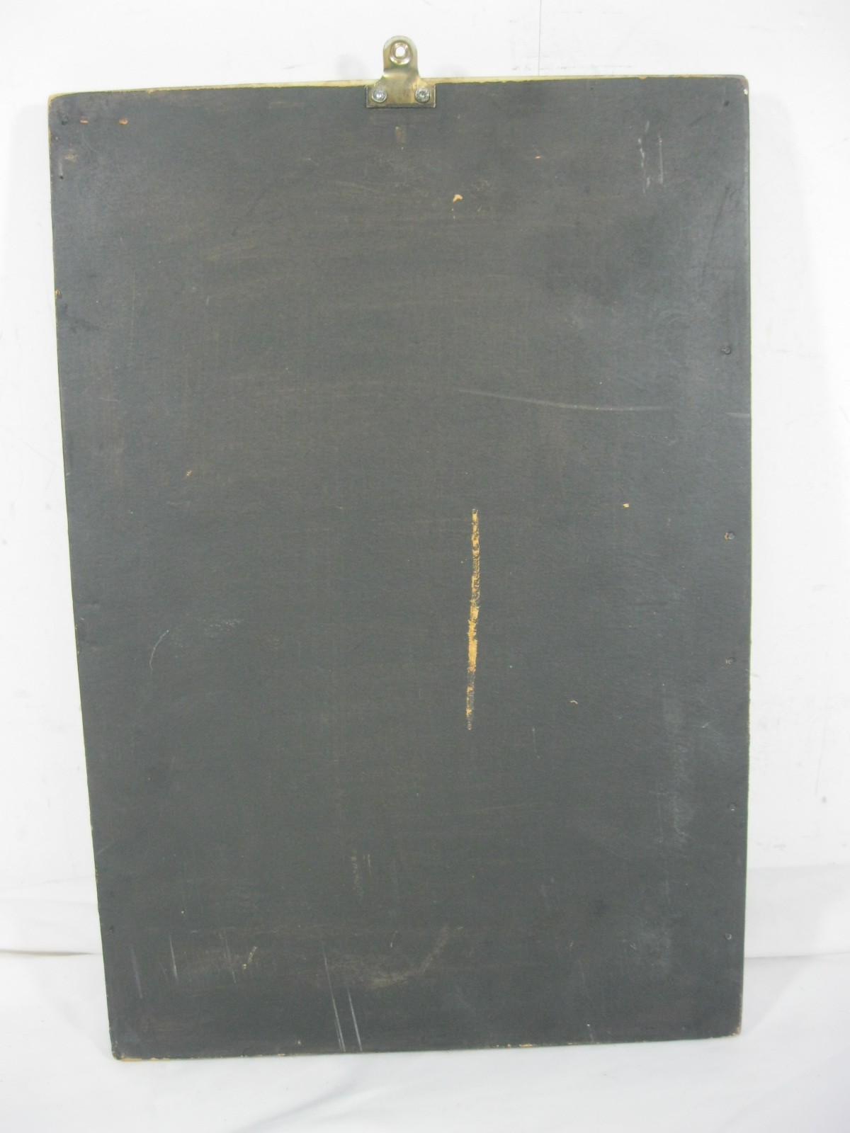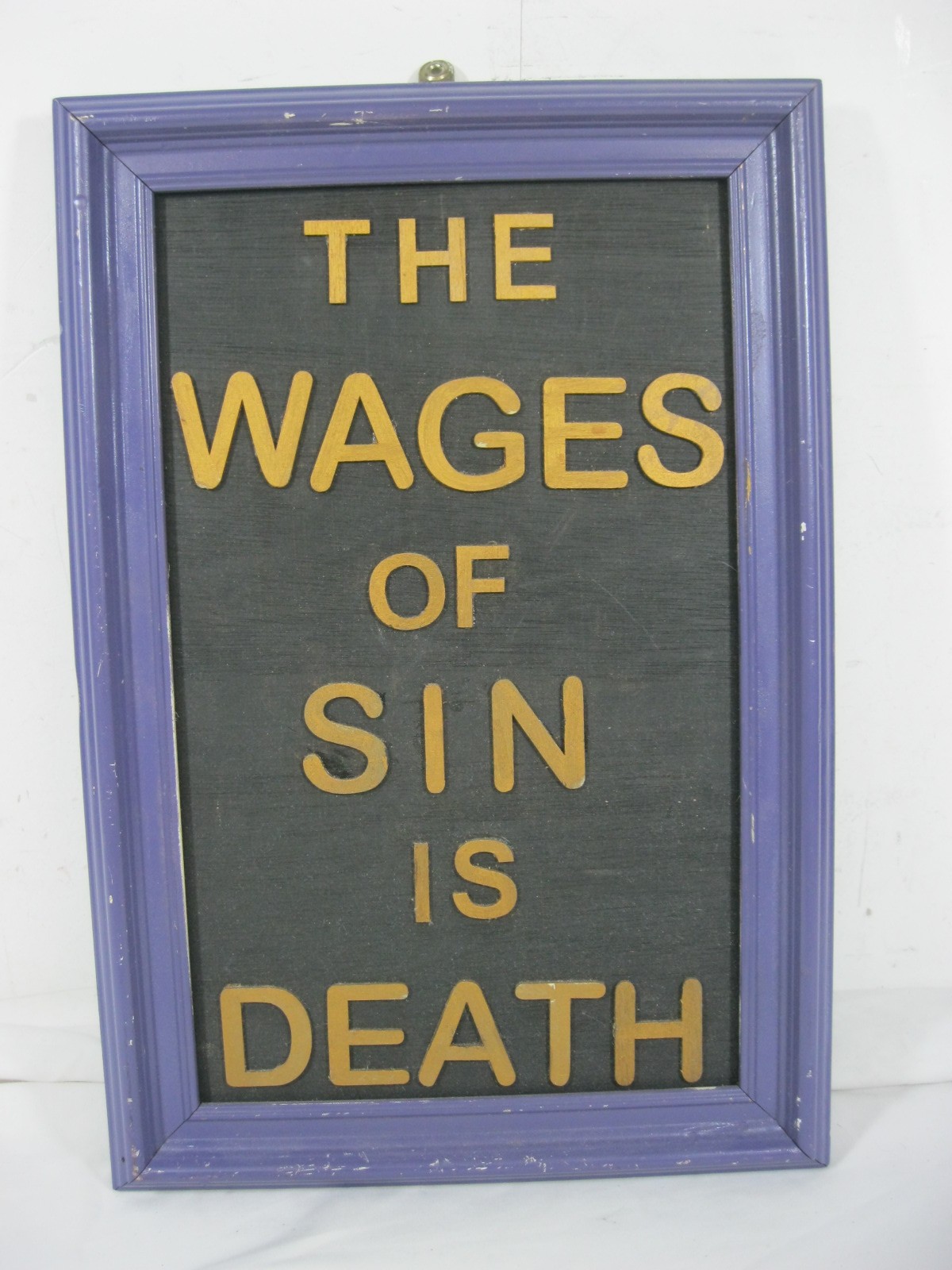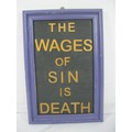 A framed sign with THE WAGES OF SIN IS DEATH in applied fret-cut letters. The background is stained black, and the frame is purple. Overall 39cm x 26cm