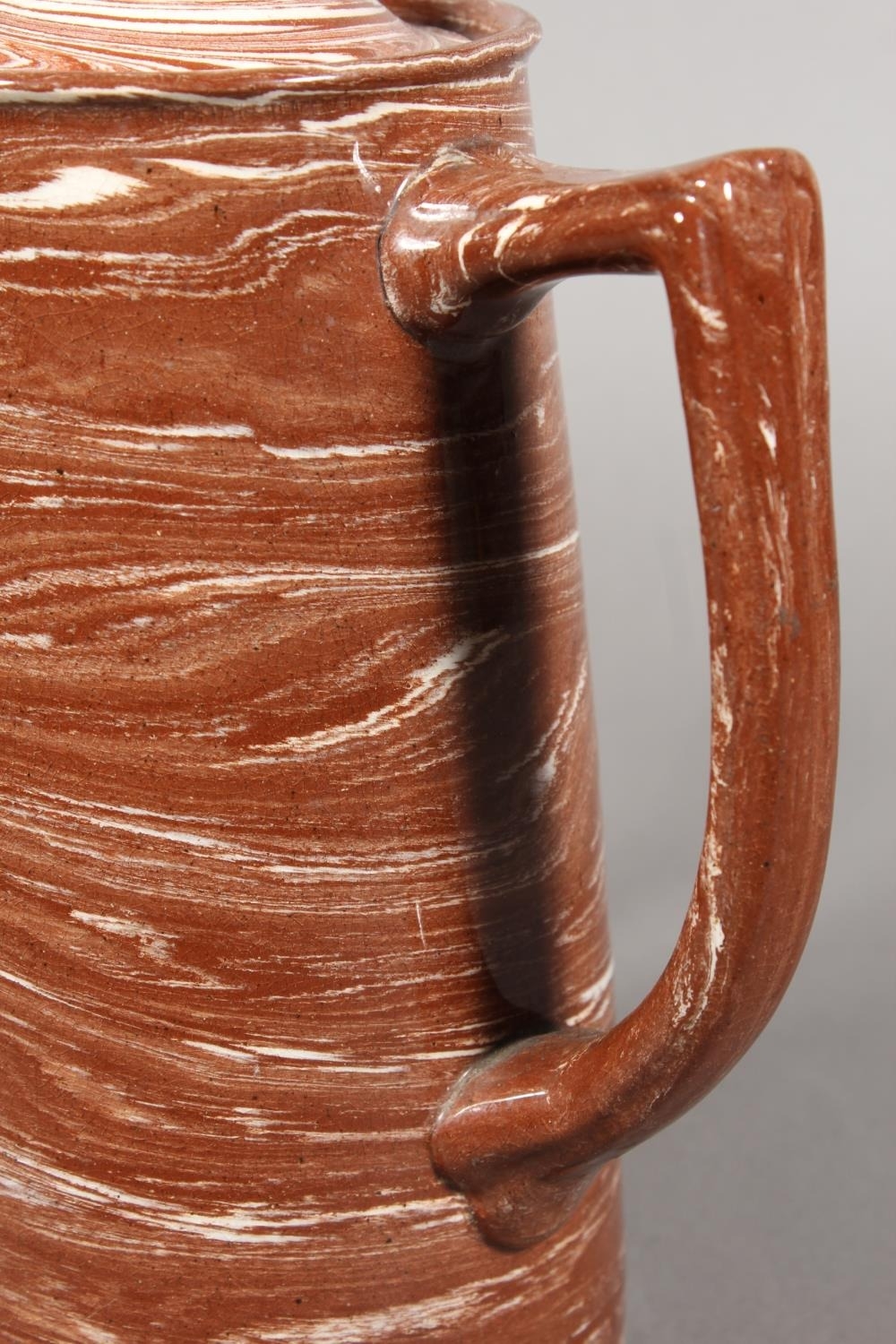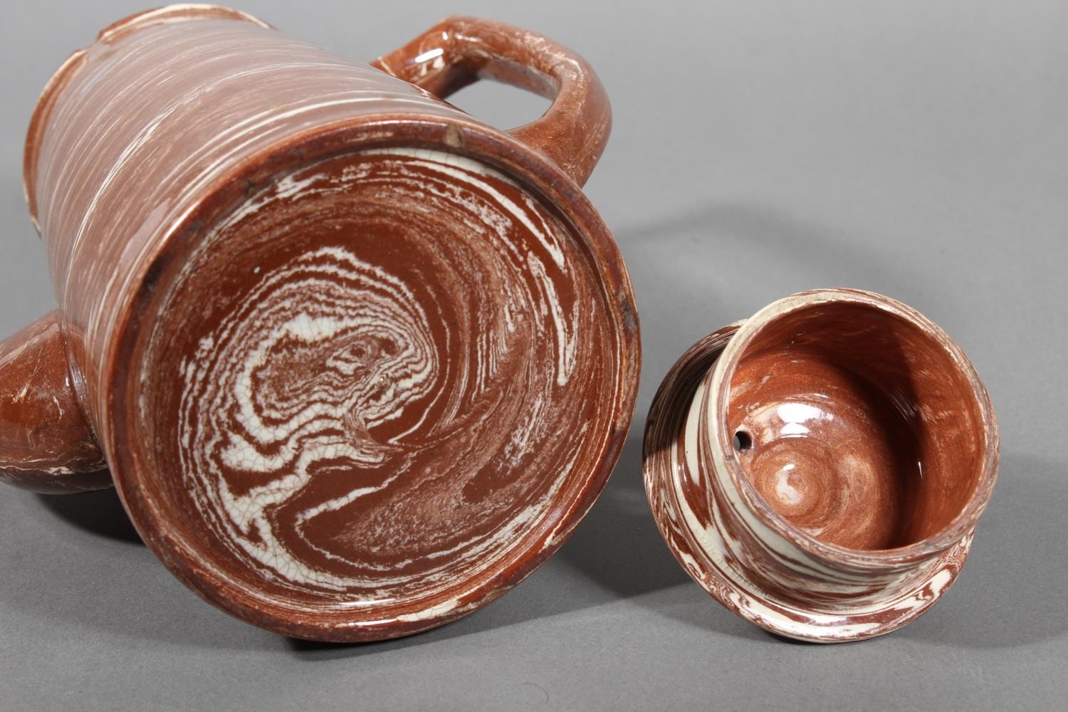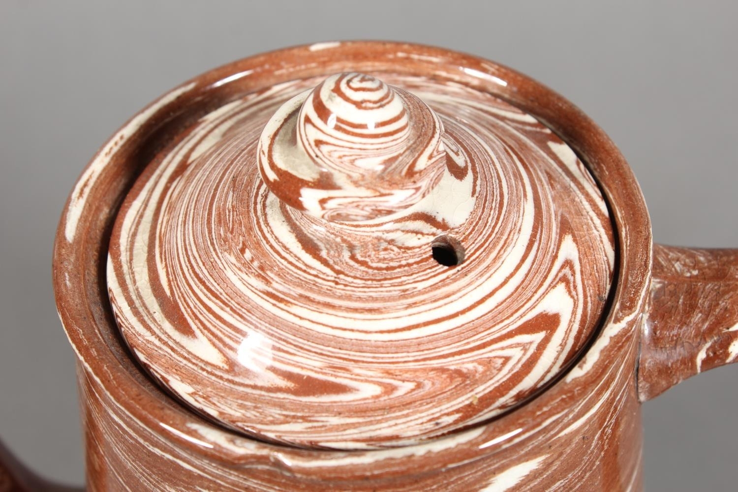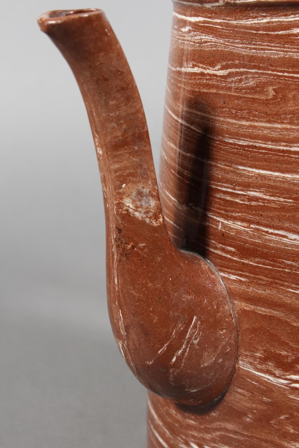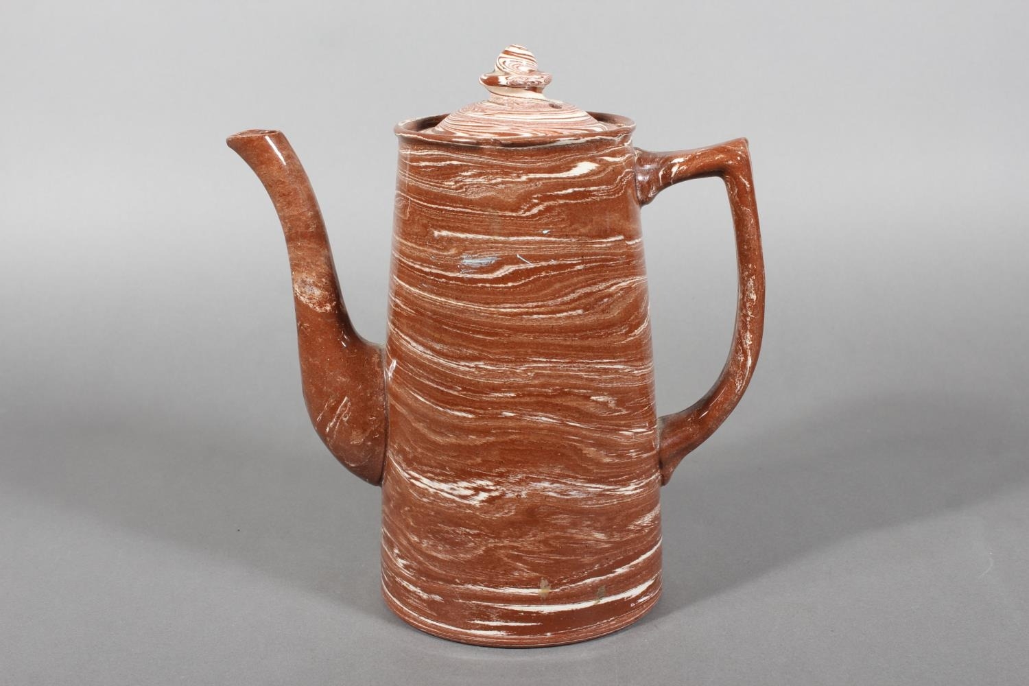 Scottish pottery agate ware coffee pot in the manner of Prestonpans, Seaton and Fife potteries, 24cm tall.