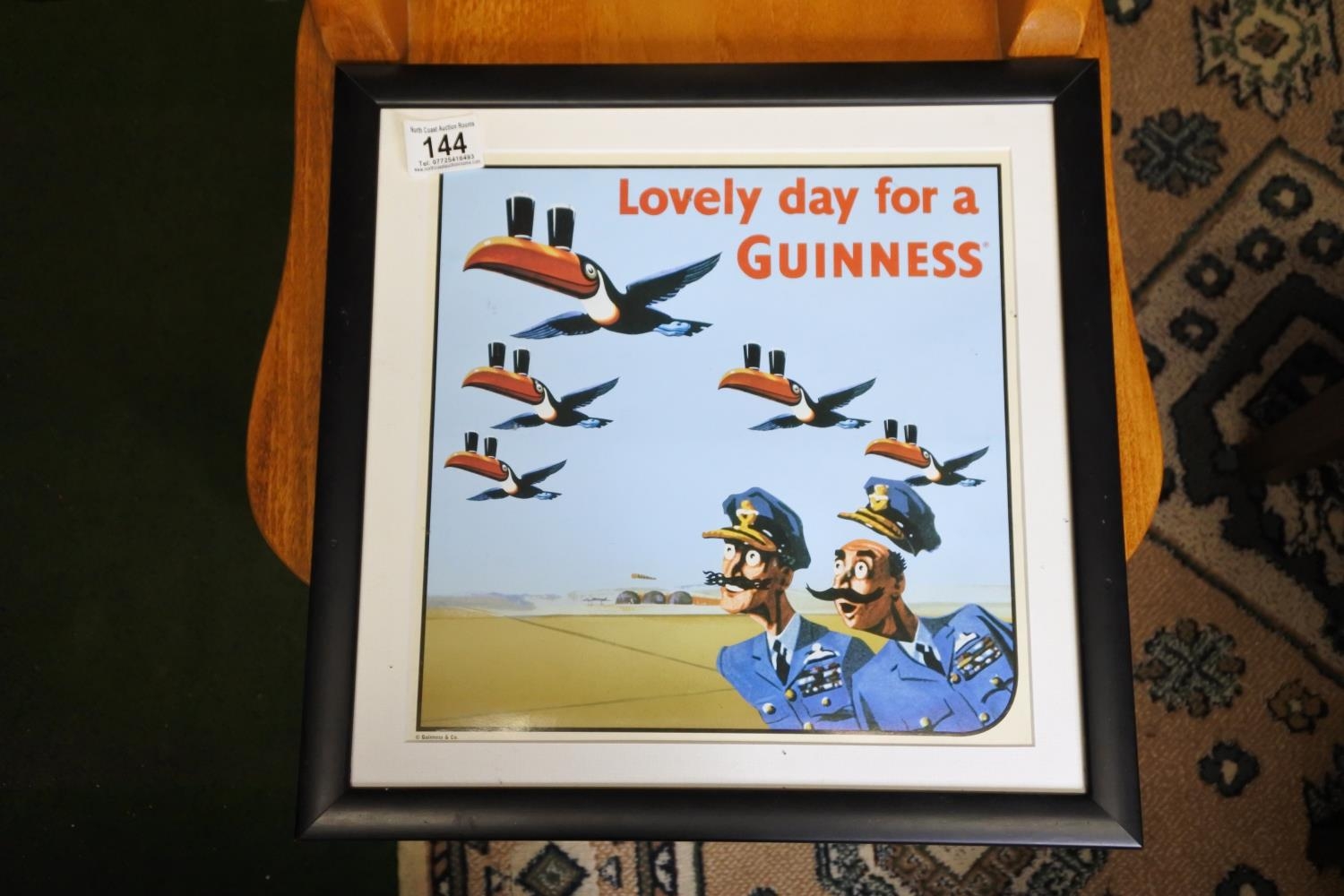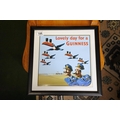 A framed Guinness print, reading 'Lovely day for a Guinness'.