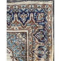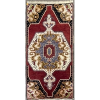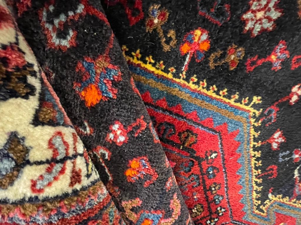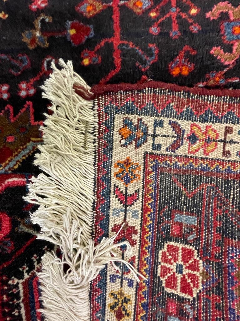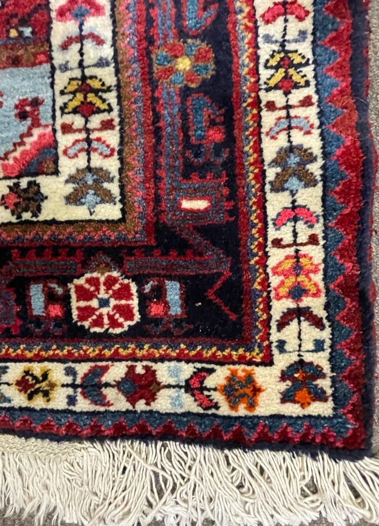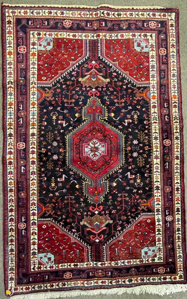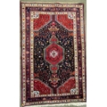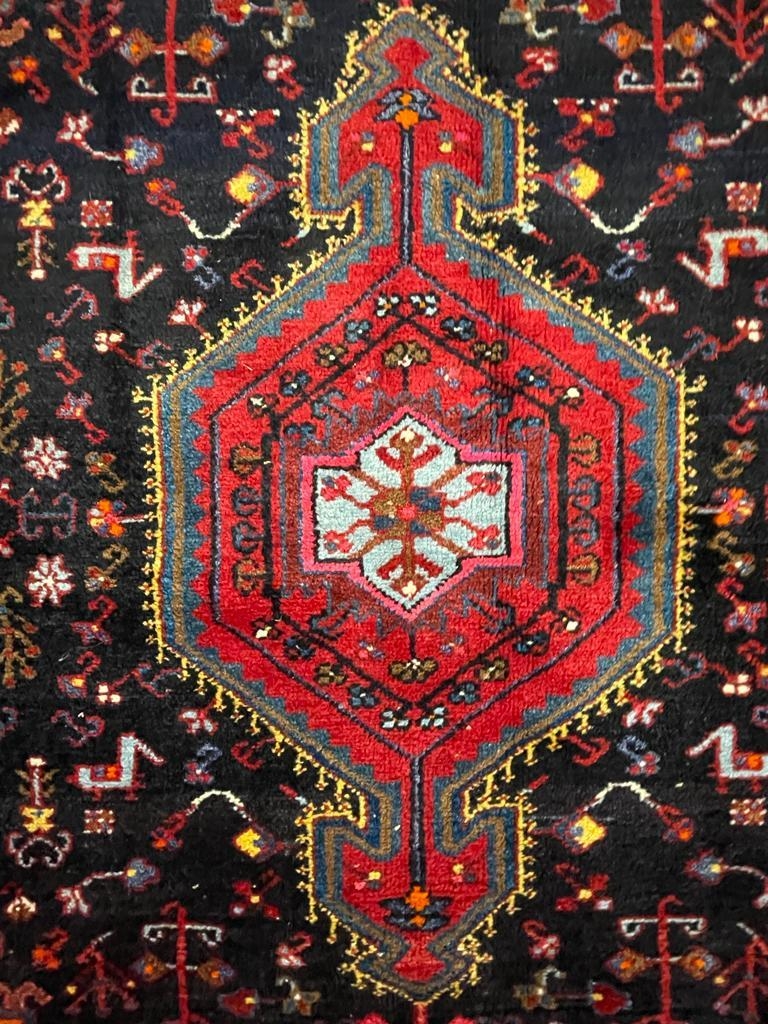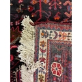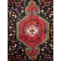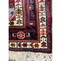 A vintage mid 20th century Persian Islamic Hamadan floor carpet rug having geometric central medallion enclosed in a central panel with shaped corner sections. Encapsulated in graduating outer borders with foliate patterns. The rug having vibrant saturated reds, blue & pinks. Measures approx. 227 x 146cm.