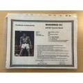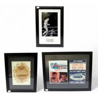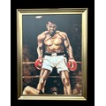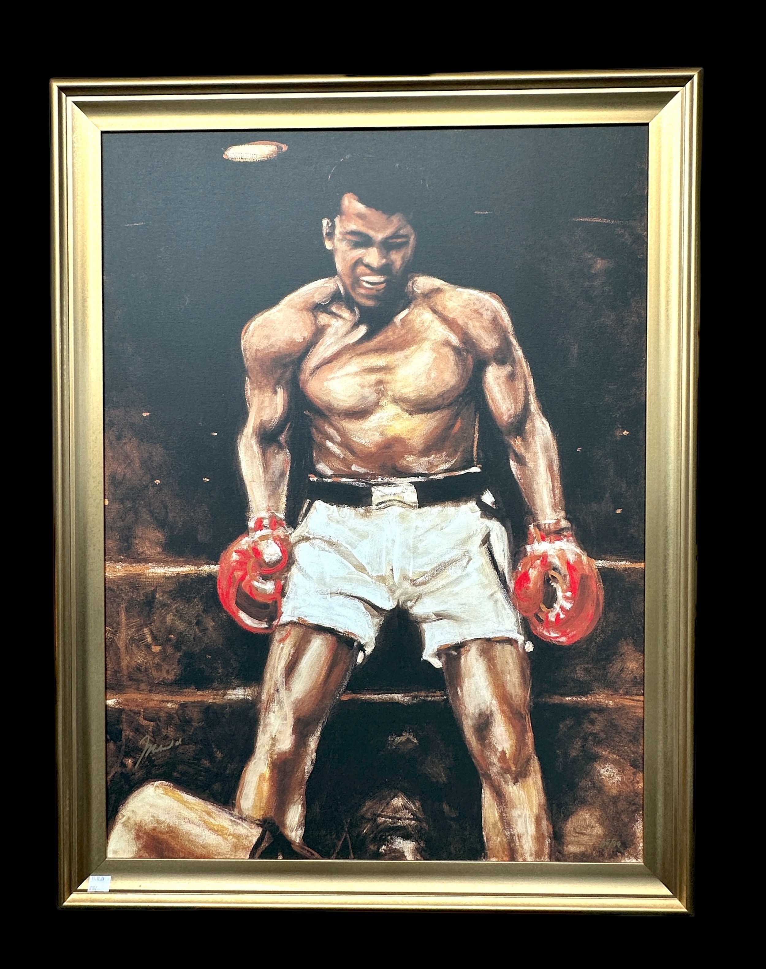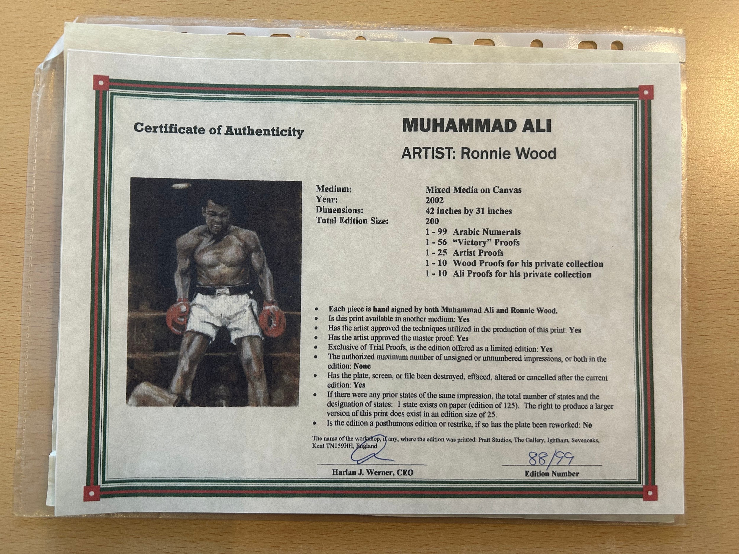 Ronnie Wood (b.1947). 'Muhammad Ali,' a.k.a. Casius Clay, 'The Greatest' painted by Wood in 2002 from the legendary image taken of the then Casius Clay as he stands over Sonny Liston in their reurn fight having dropped Liston with the 'anchor' punch in the first round. Signed in gold pen by both Ronnie Wood and Muhammad Ali, limited edition 88/99, mixed media on canvas, with certificate 106cm x 80cm (42 x 31.5") in giltwood frame.