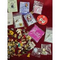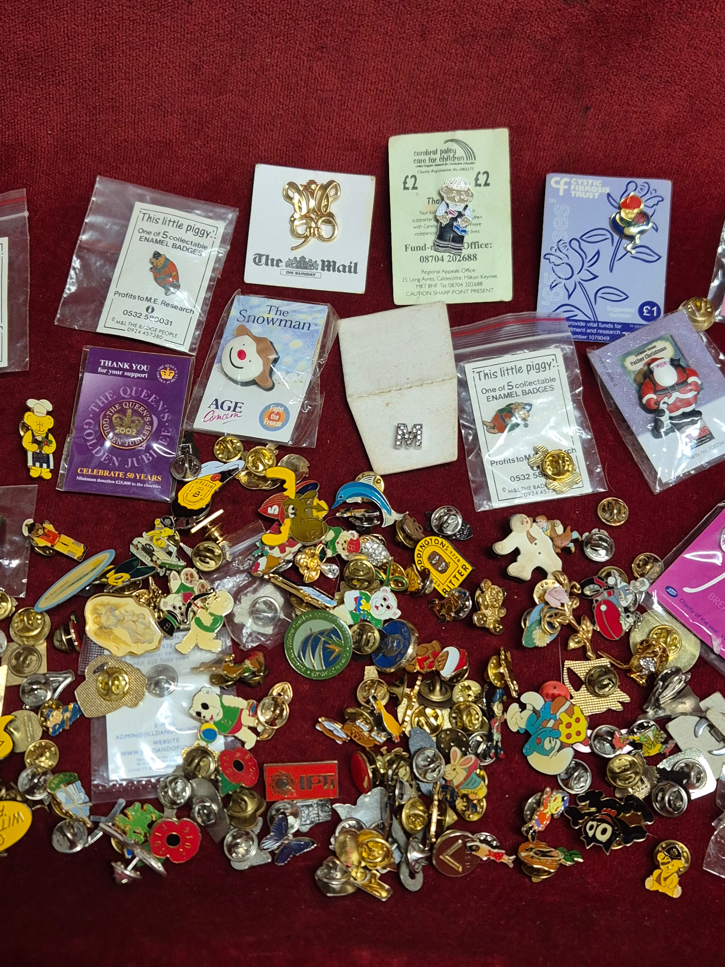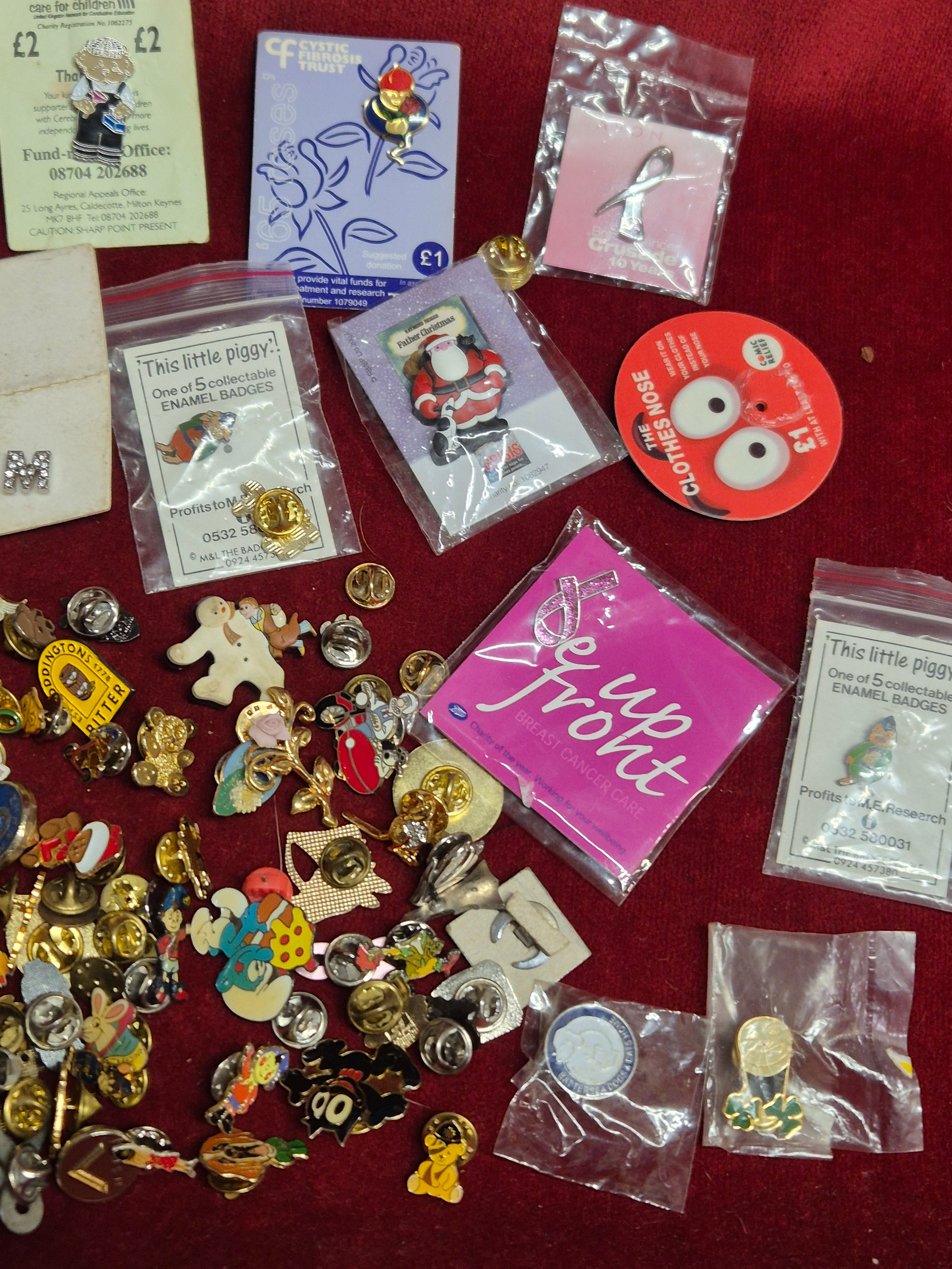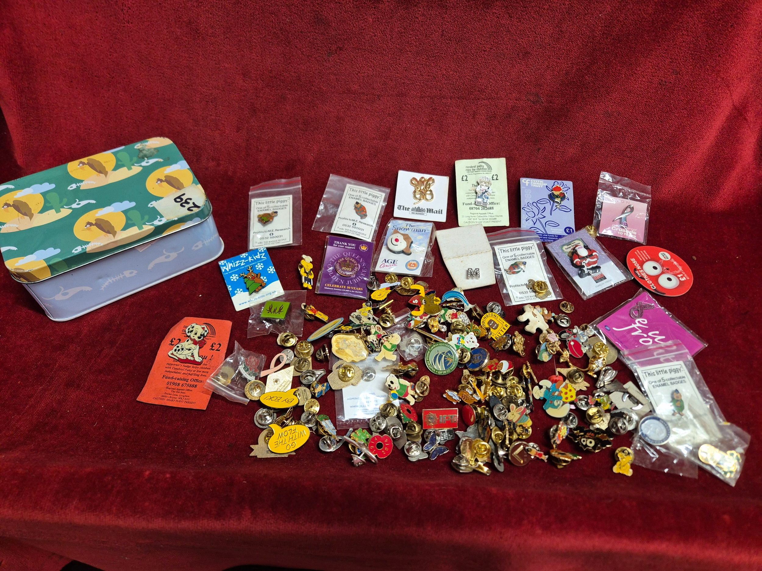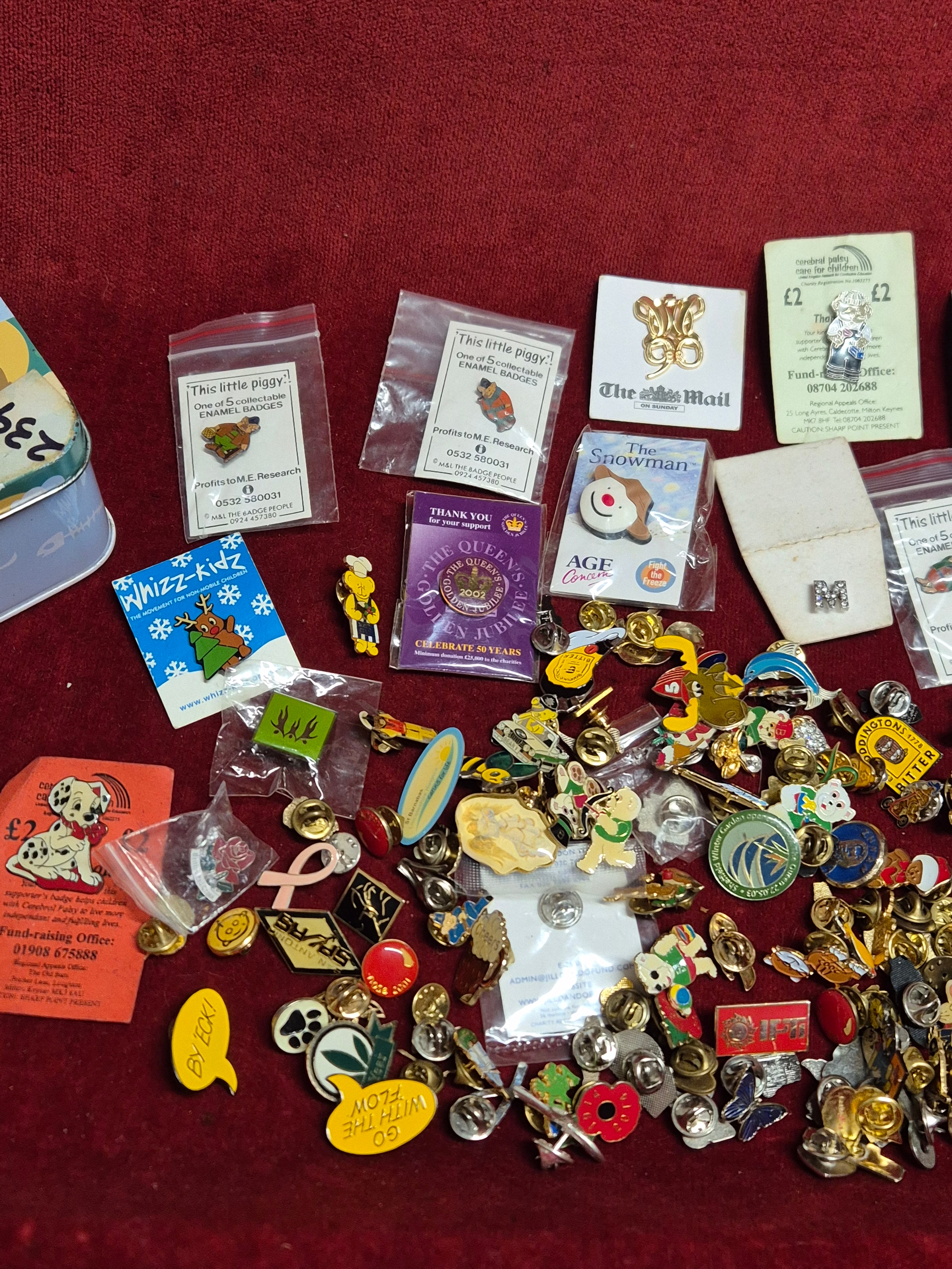 Tin of various pin badges