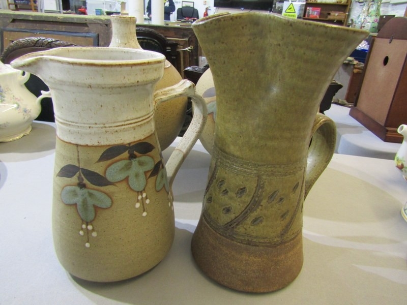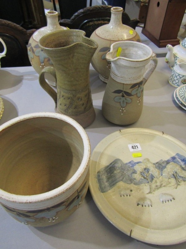 STUDIO POTTERY, an Isle of Arran pottery plate depicting sheep together with other various studio jugs and pots