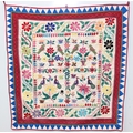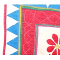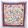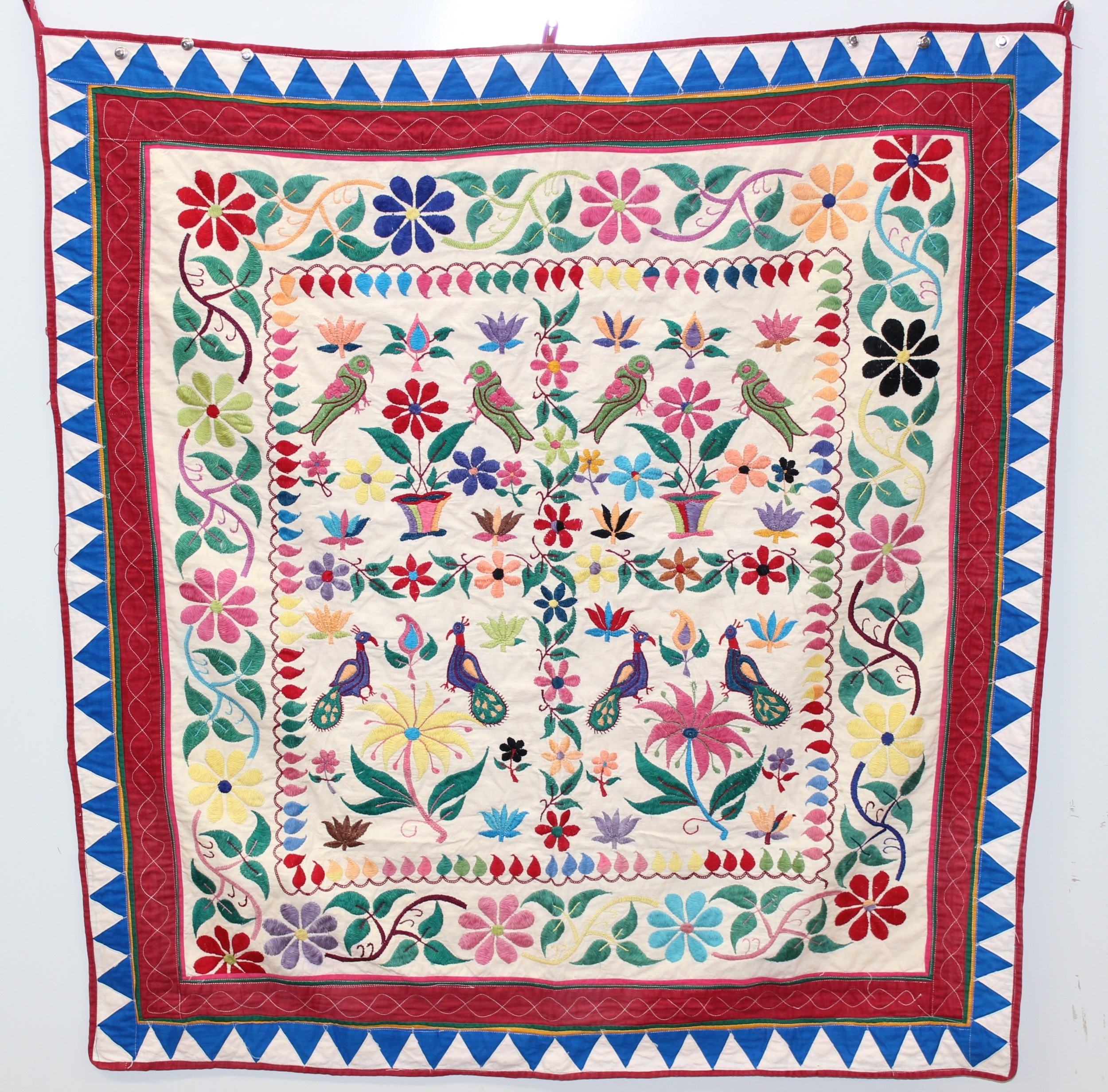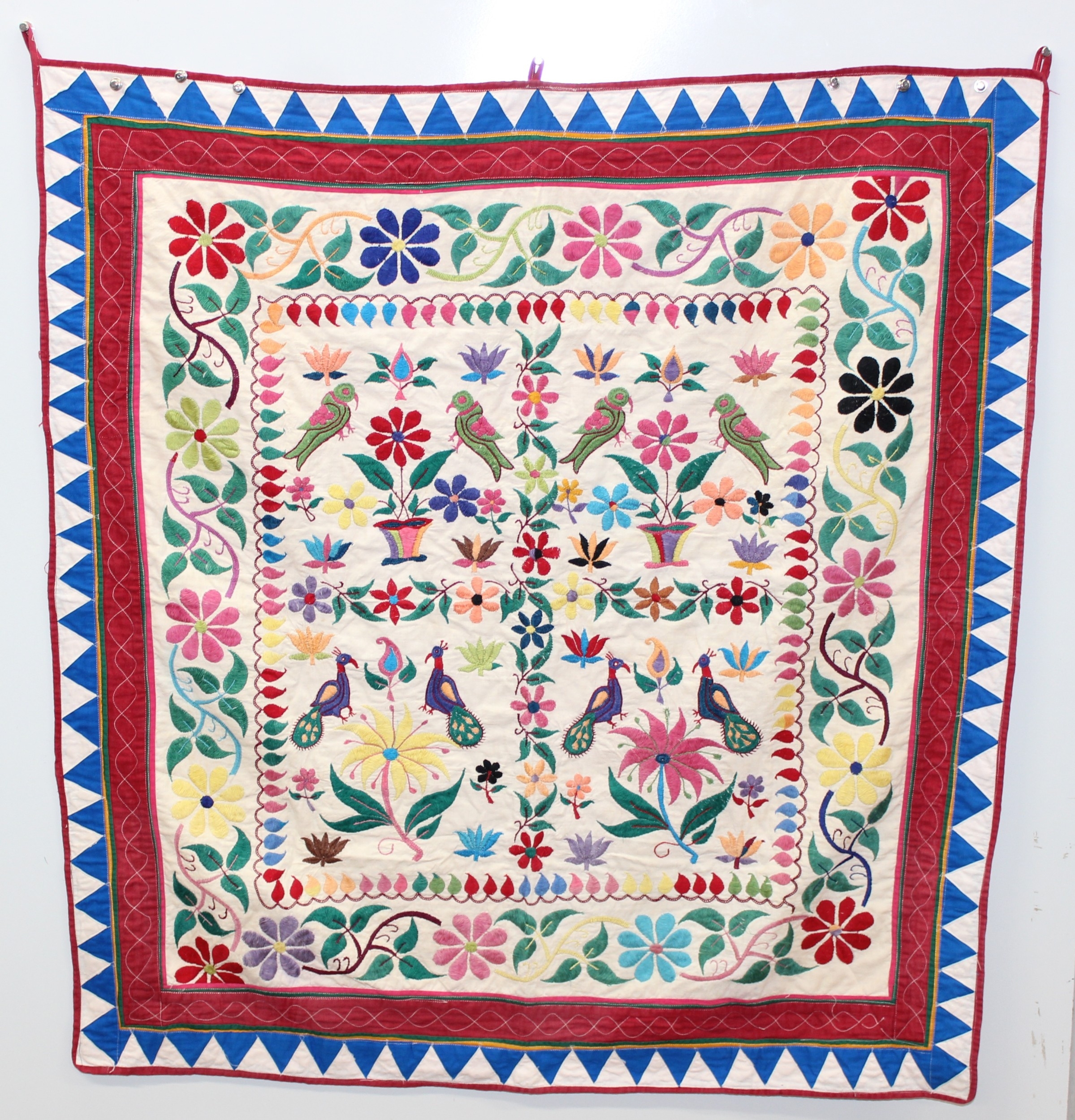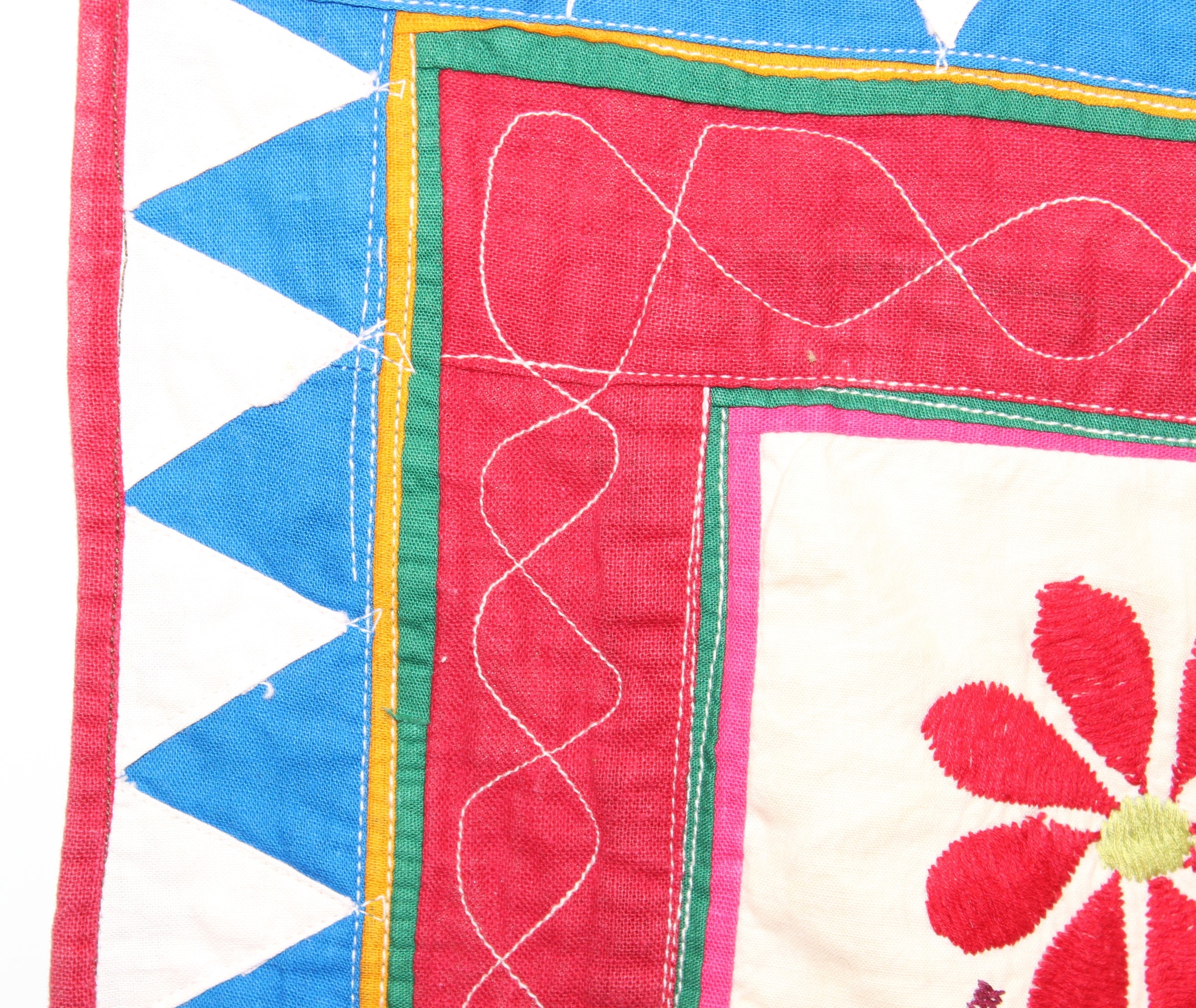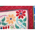 A vintage Indian Toran or Kutch style embroidered wall hanging decorated with colourful flowers and birds, 103cm x 93cm