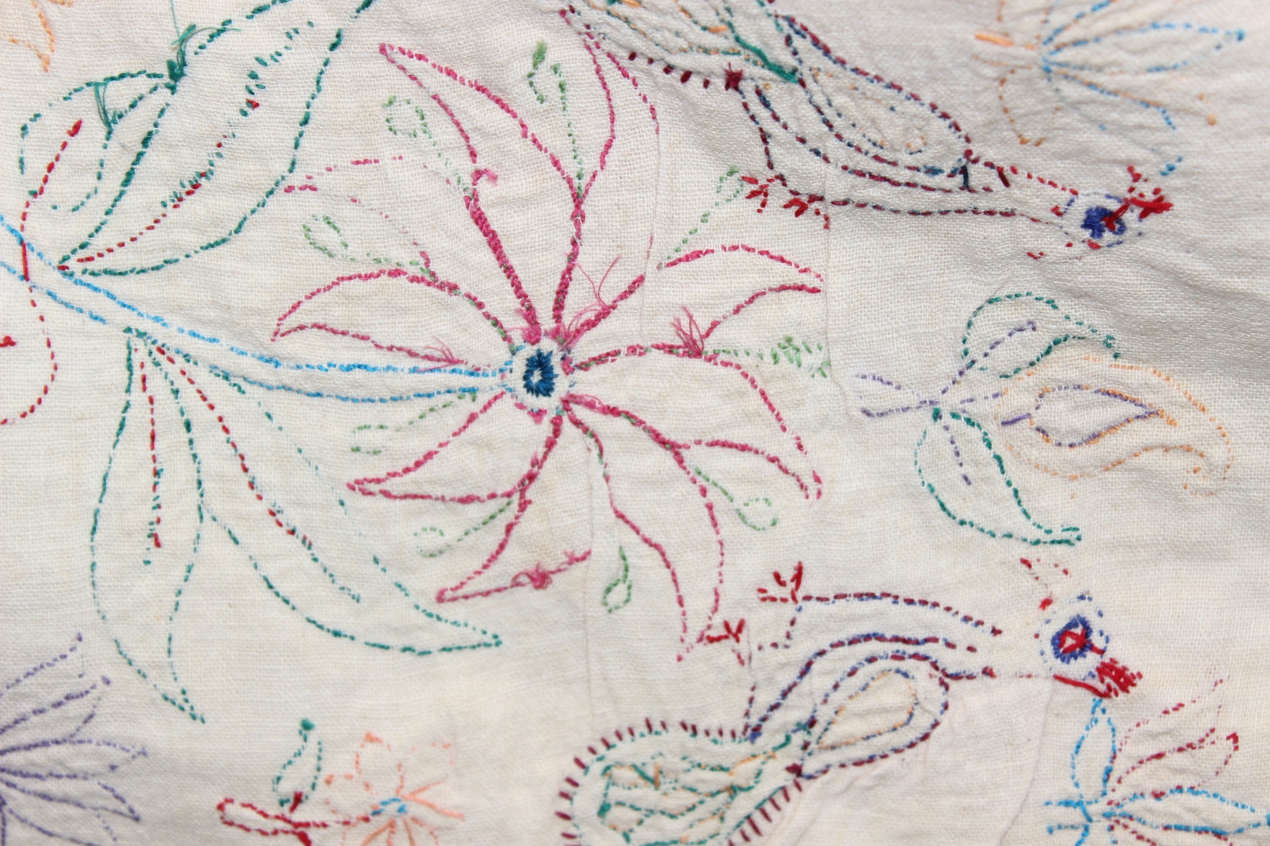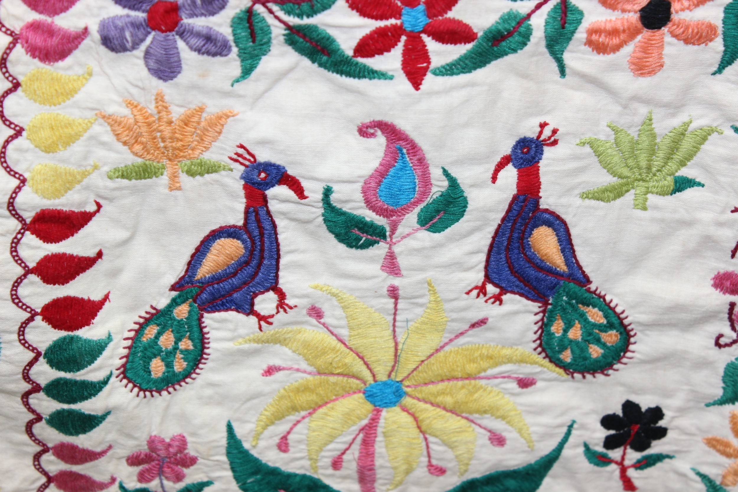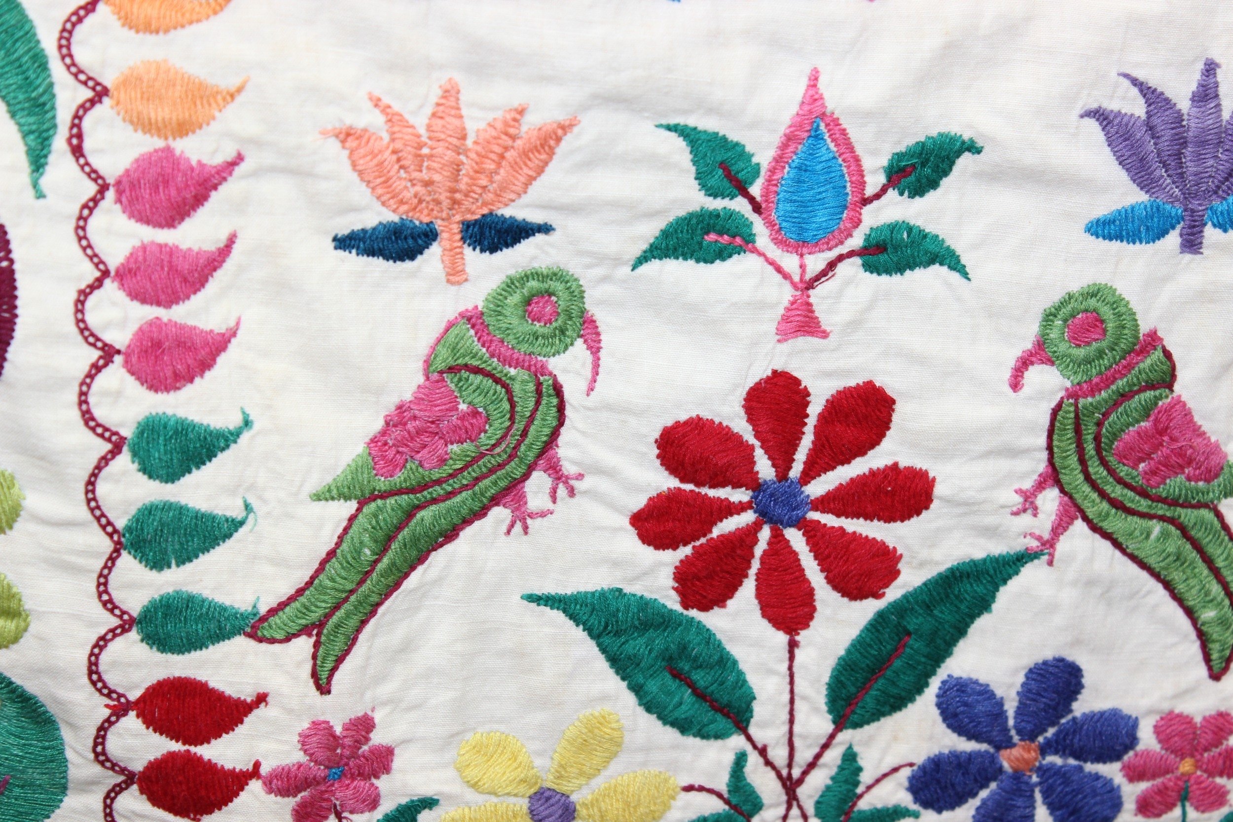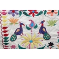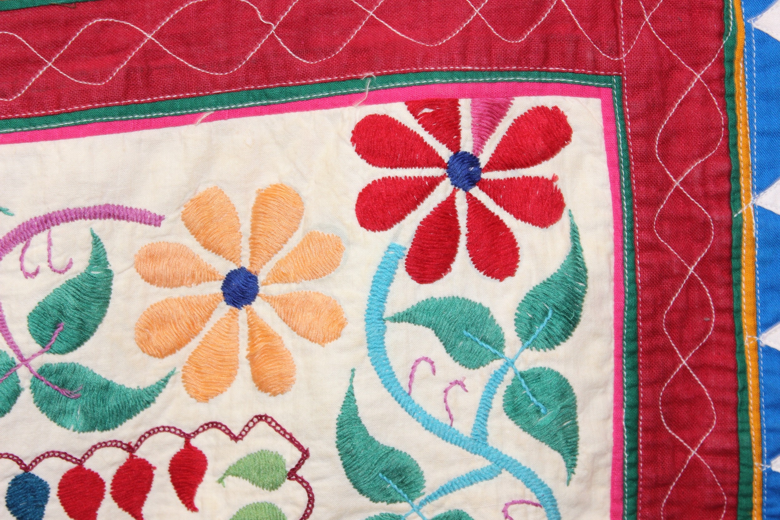 A vintage Indian Toran or Kutch style embroidered wall hanging decorated with colourful flowers and birds, 103cm x 93cm
