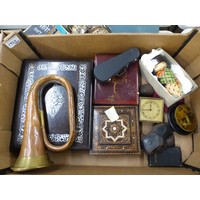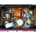 Mixed collection of items to include a Metamec clock, Smiths clock, together with cased vintage binoculars, brassware, etc (1 tray).