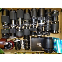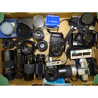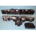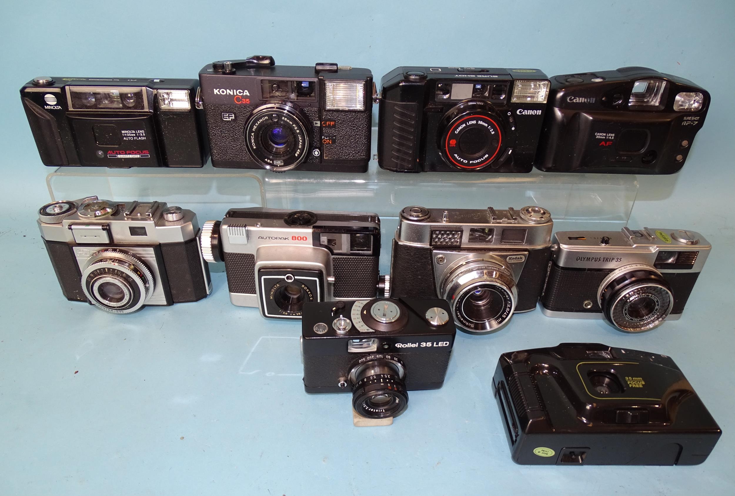 Ten various SLR cameras: Rollei 35 LED, Olympus Trip 35, Canon Sureshot (x2), Konica C35, Minolta Autopak 800 & AF-3, Zeiss Ikon Contina, Kodak Revinette IIA and one other, (10).