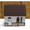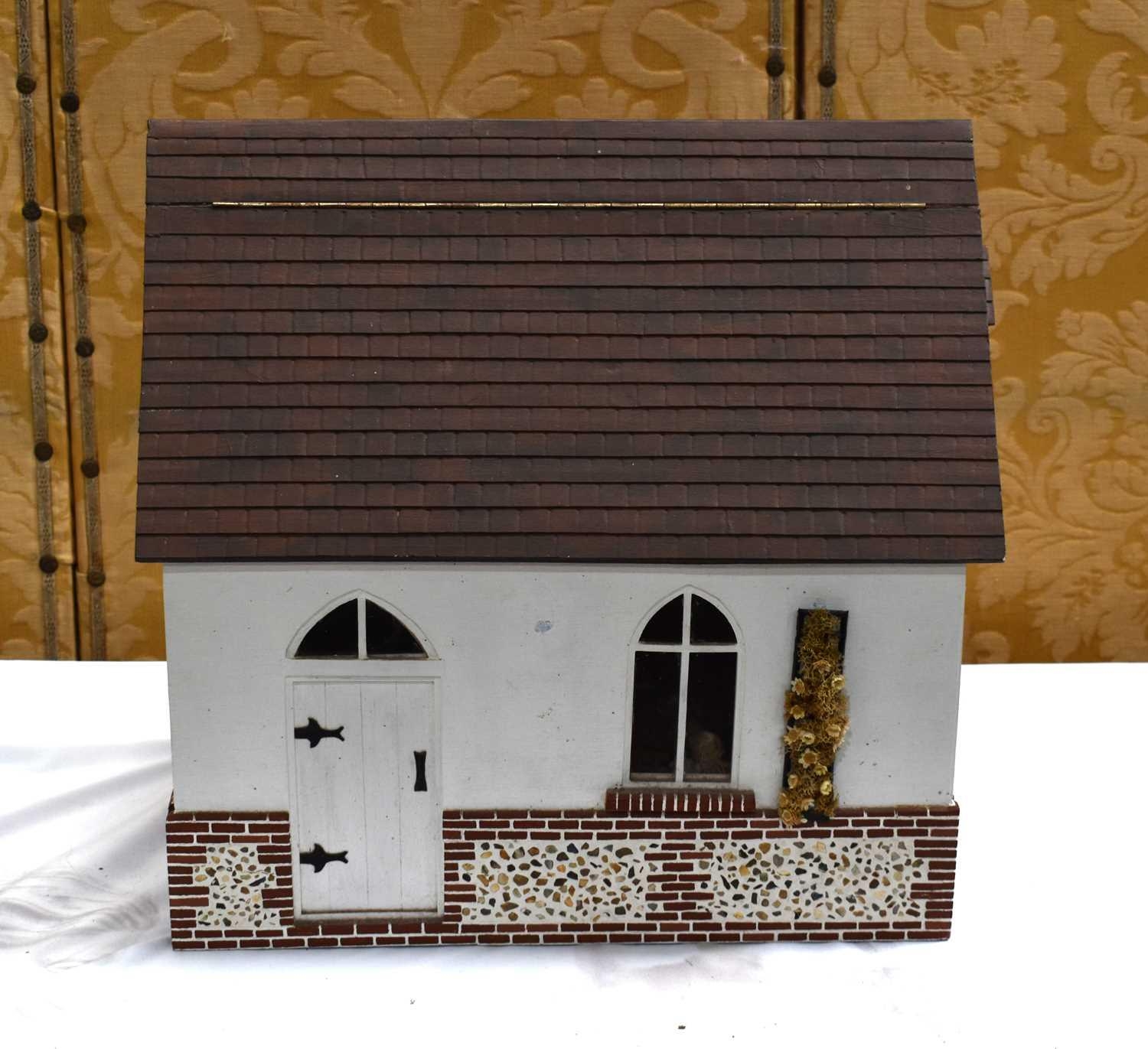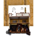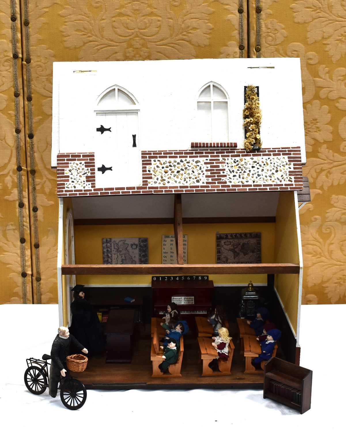 A vintage dolls house modelled as a school, the lift up folding front opening to reveal a single room with various school related furniture and dolls, 45cm high by 47cm.